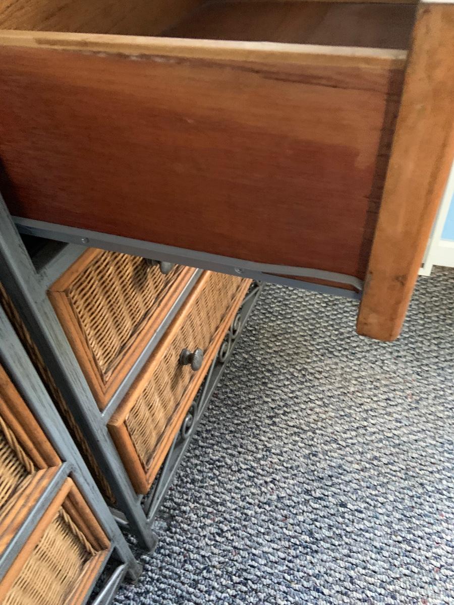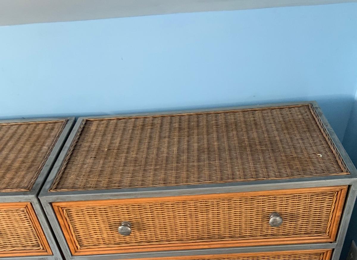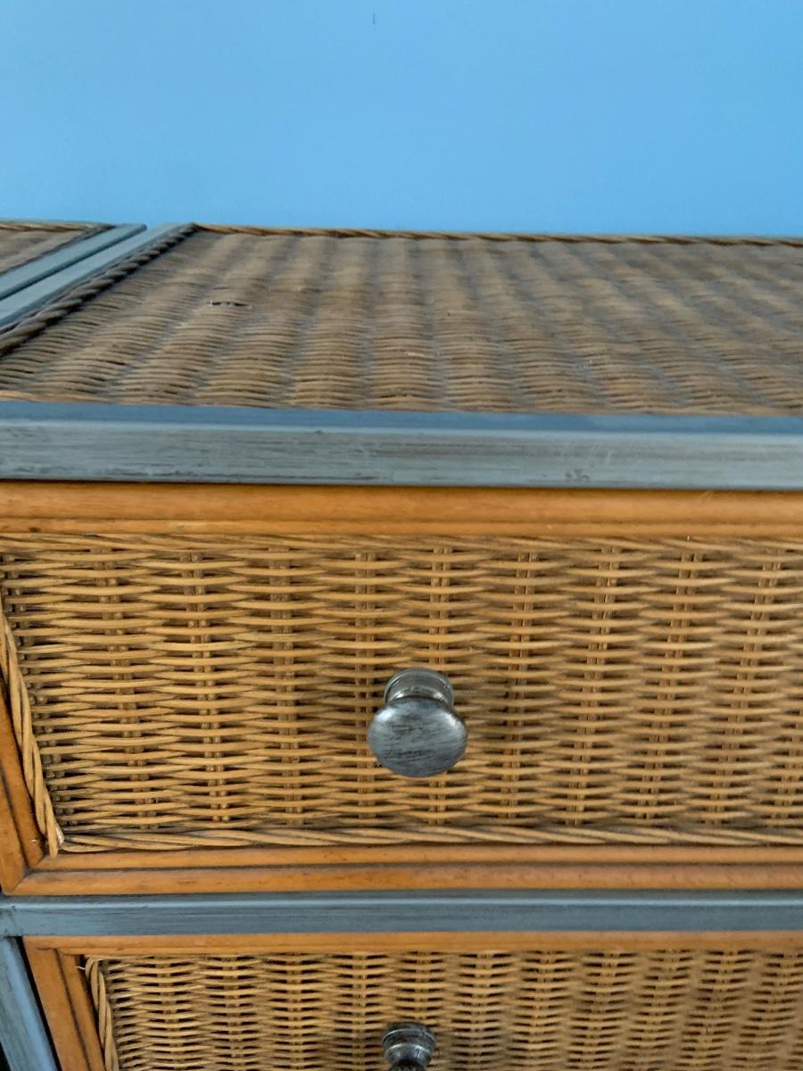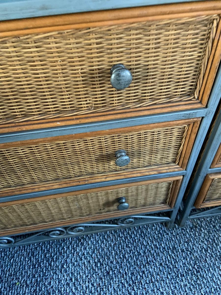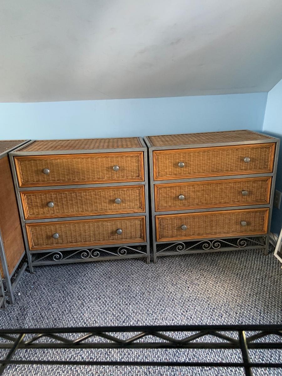 LOT:114G: Set of 2 Wicker/Ratan Three Drawer Dressers with Brushed Nickel Metal Frame and Knobes