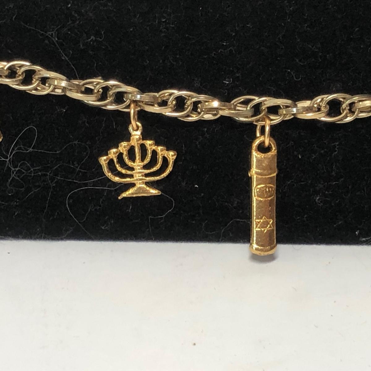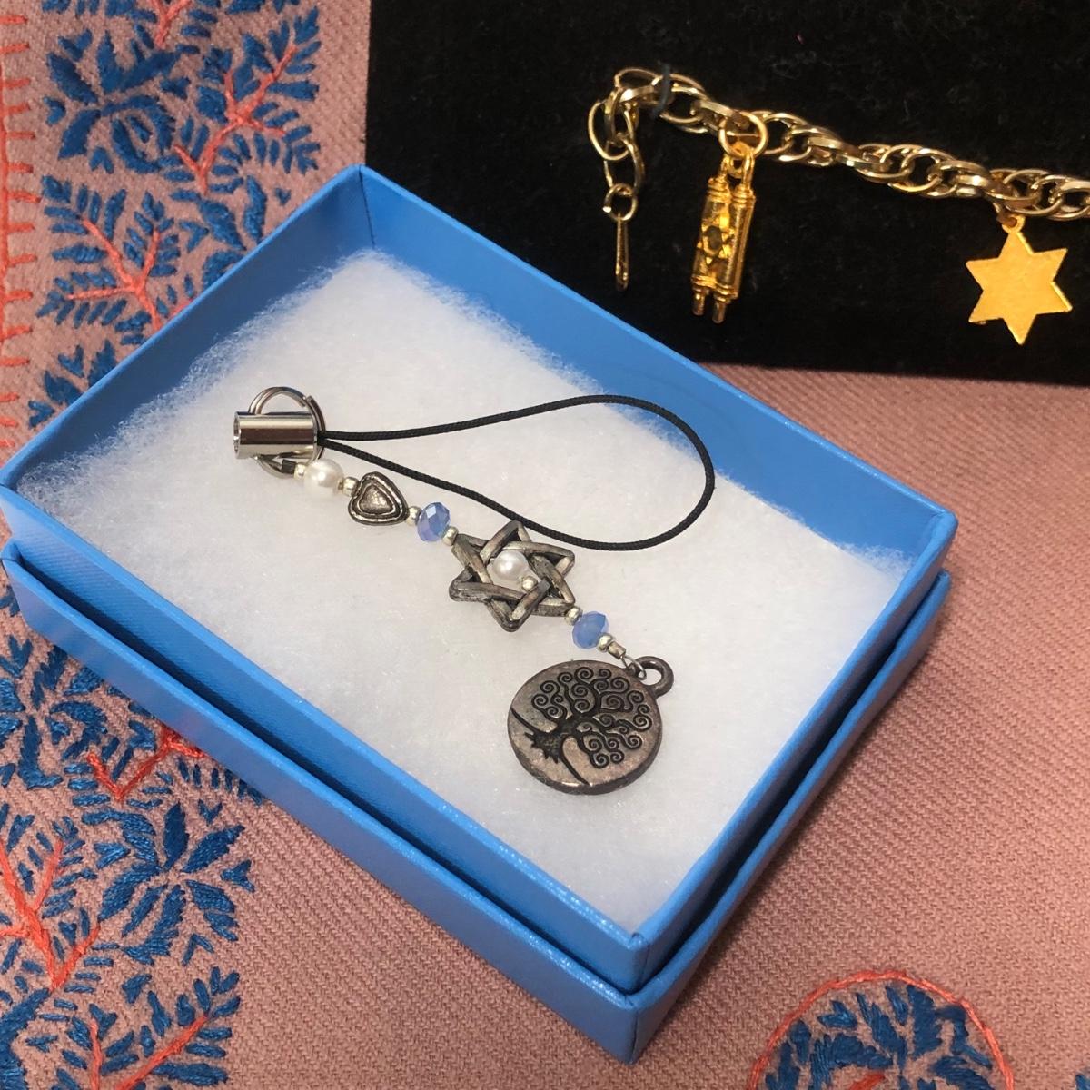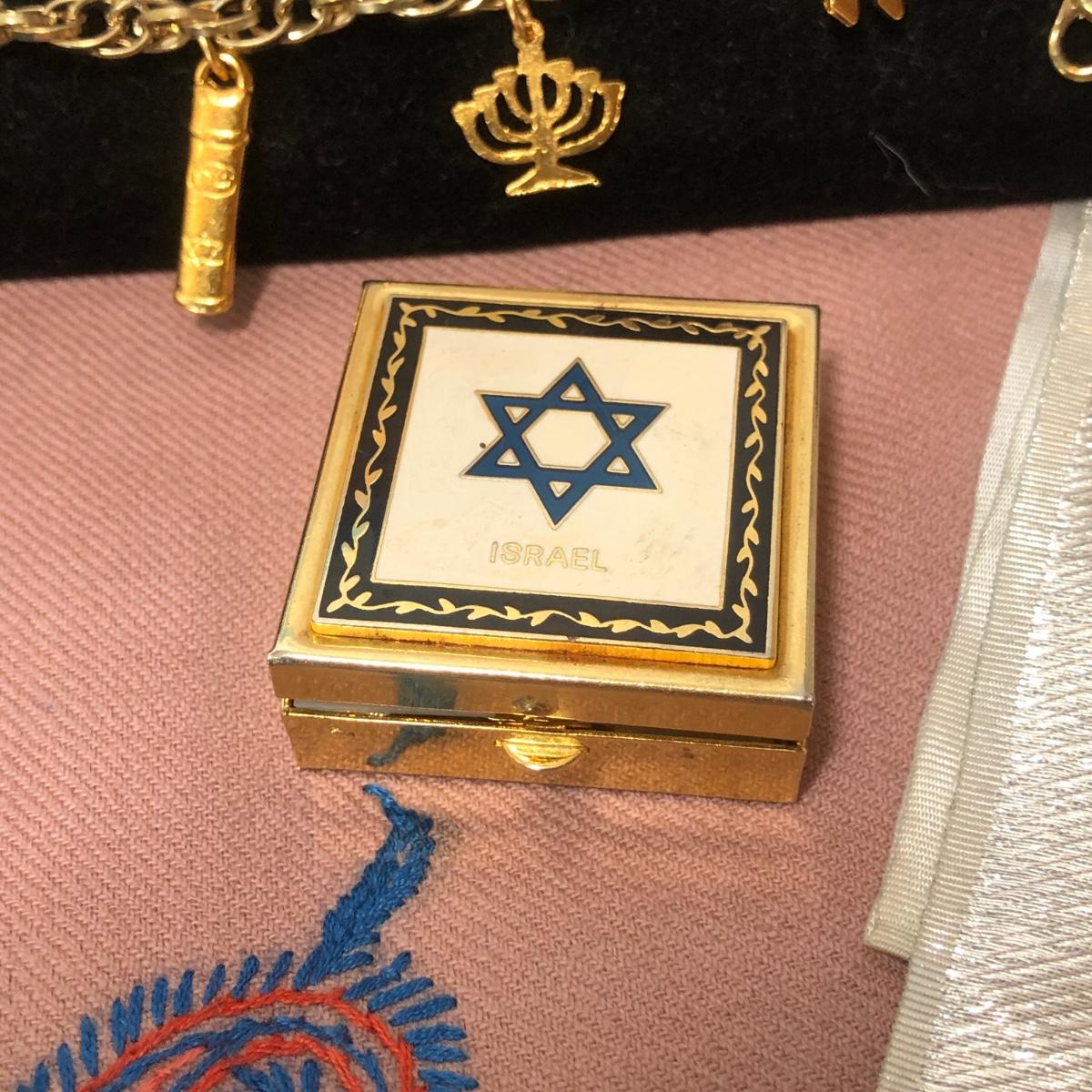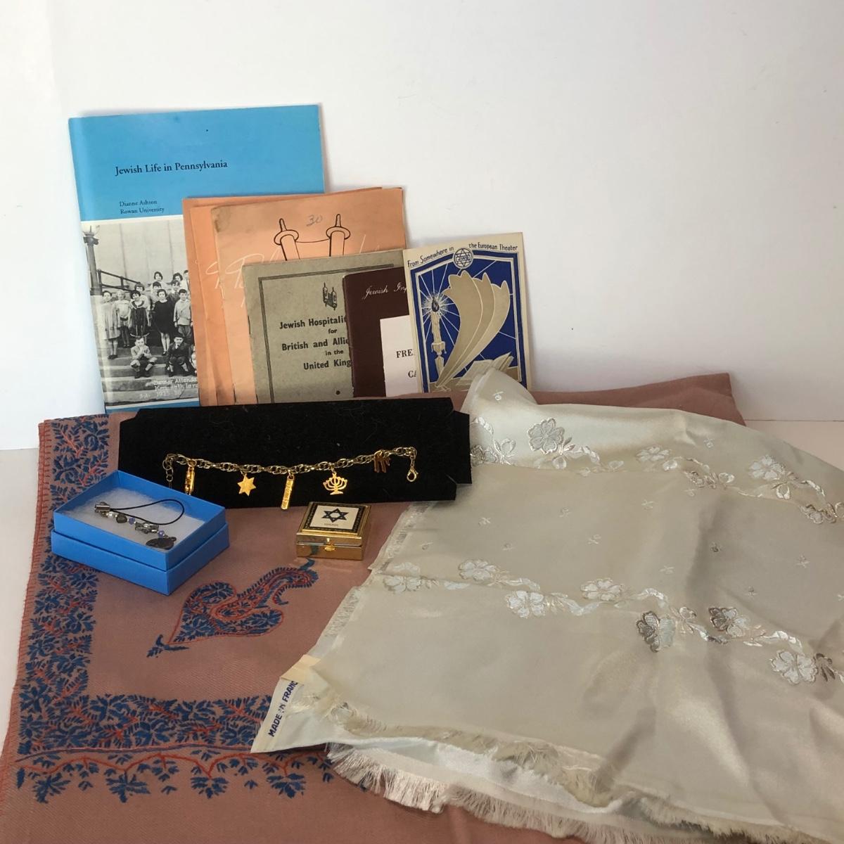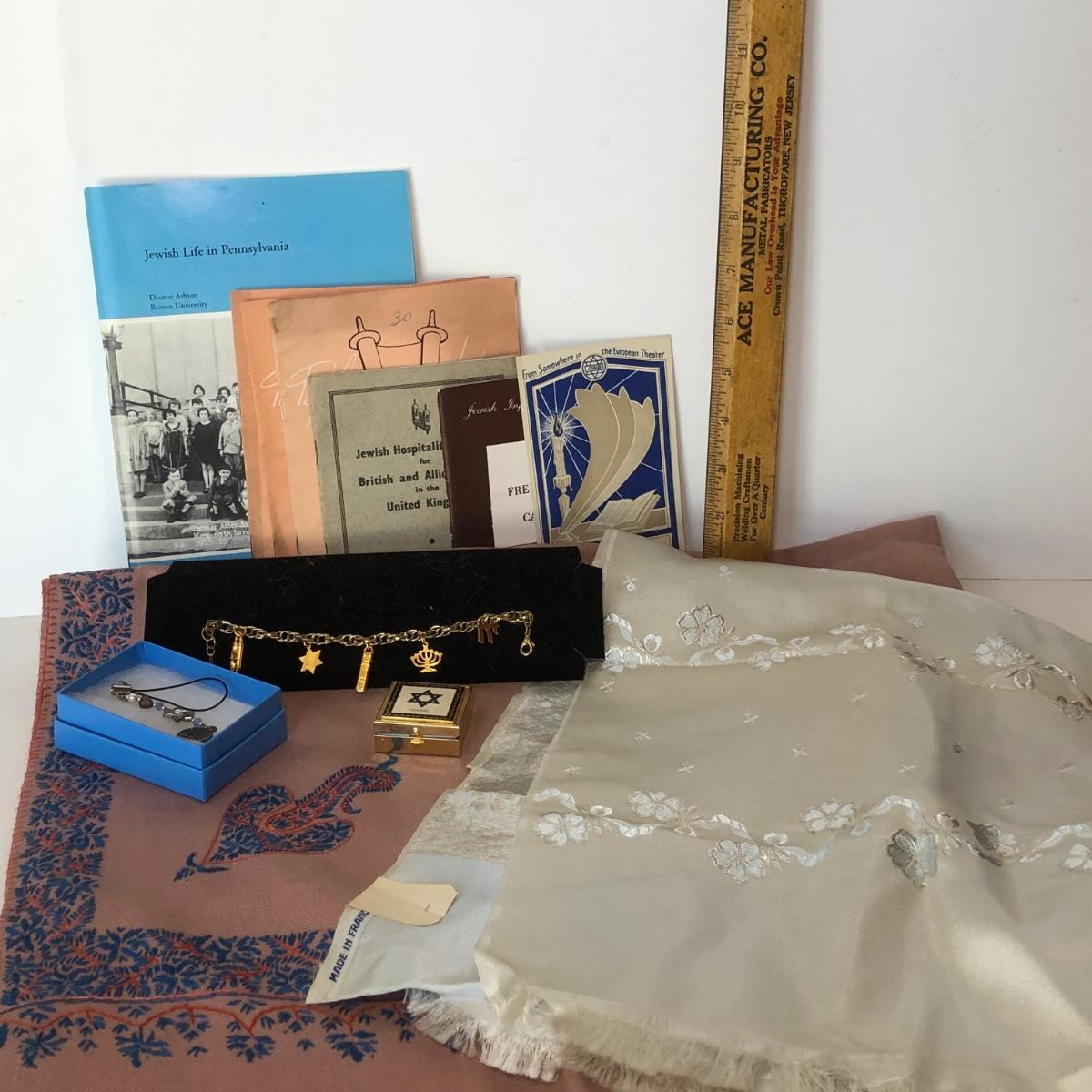 Includes ephemera relating to Judaism, a cell phone charm, a charm bracelet, two prayer scarves and a trinket box.
