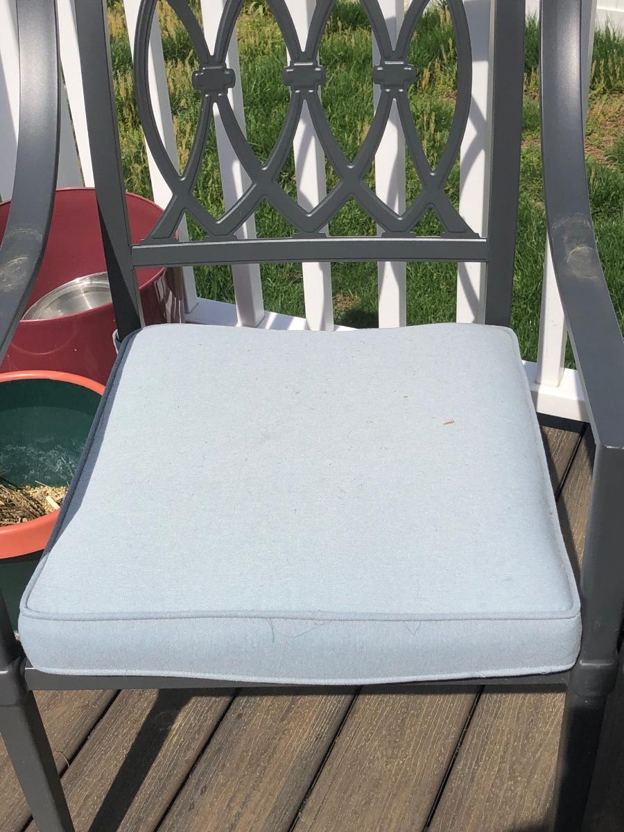 Four chairs with pale blue cushions. Each chair measures 23W x 21D x 38H.