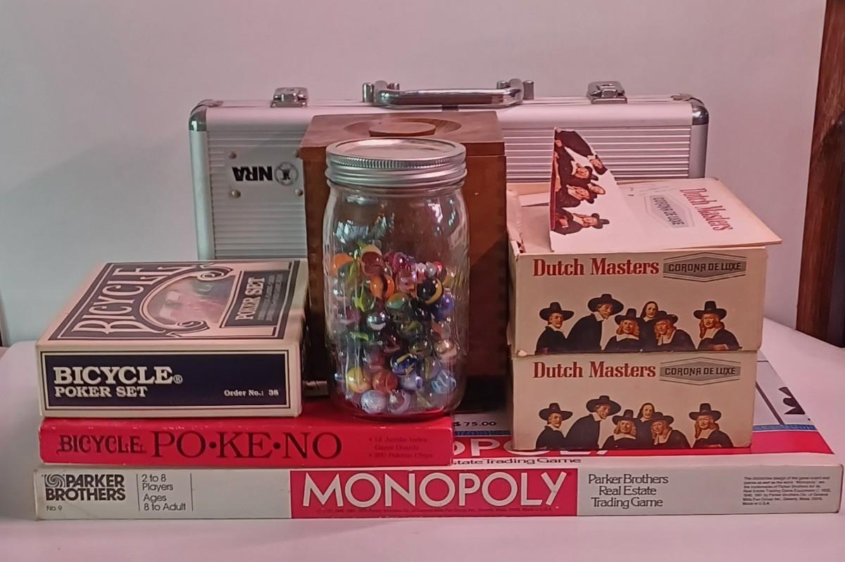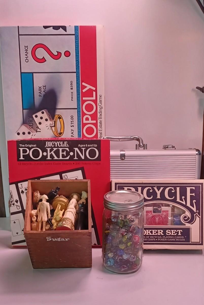 LOT 137: Marble, Monopoly, Pokeno, Poker Chip Set & More