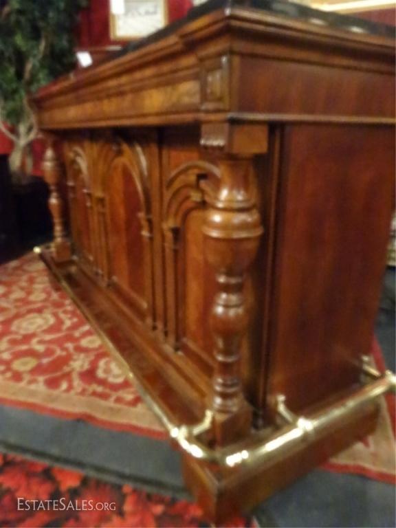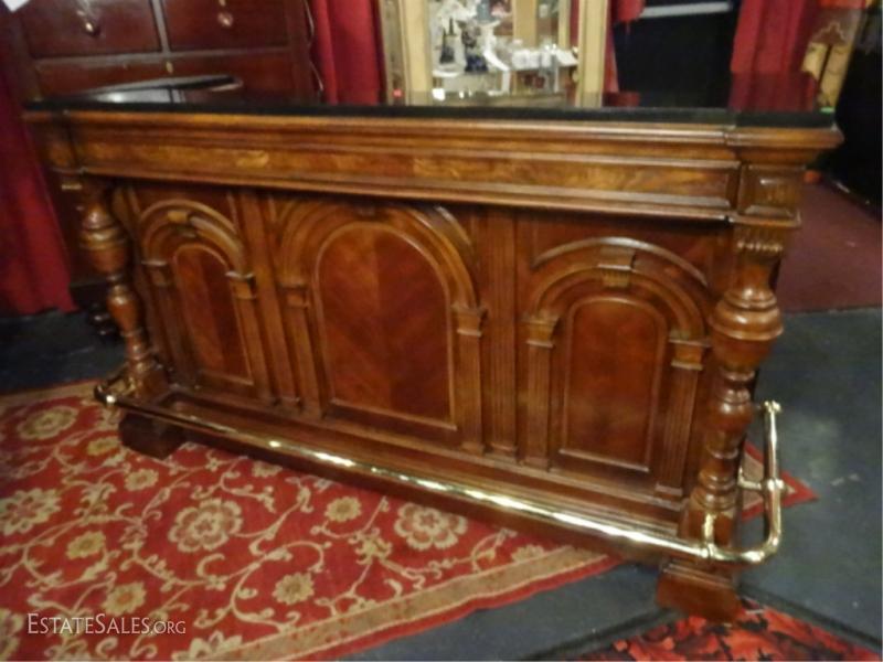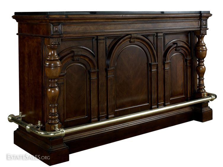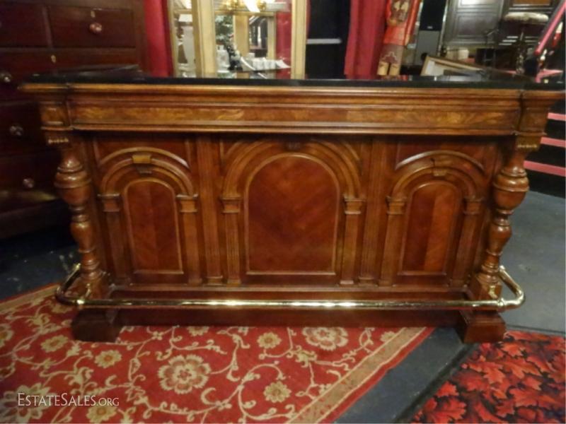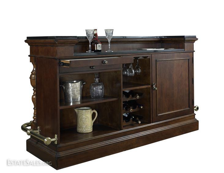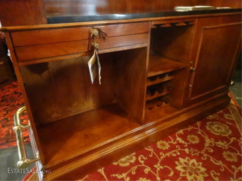 LOT 85A: PULASKI CARLTON MANOR HOME BAR, BLACK GRANITE VENEER TOP, ANTIQUES ROADSHOW COLLECTION, BRASS FOOTRAIL, PULL OUT BUTCHER BLOCK CUTTING BOARD, WINE GLASS AND BOTTLE STORAGE, VERY GOOD CONDITION WITH SOME WATER MARKS TO BAR TOP OTHERWISE EXCELLENT, 78"W X 27"D X 43"H, APPROX 448 LBS, SKU143.12