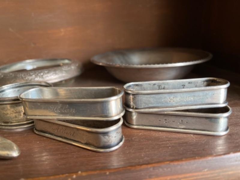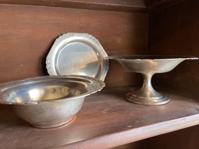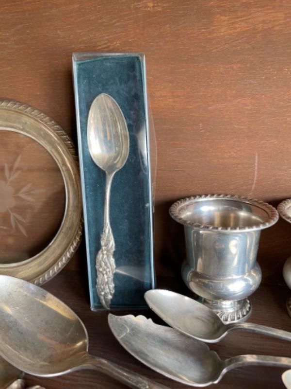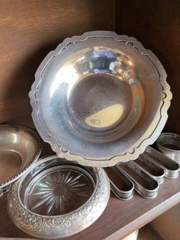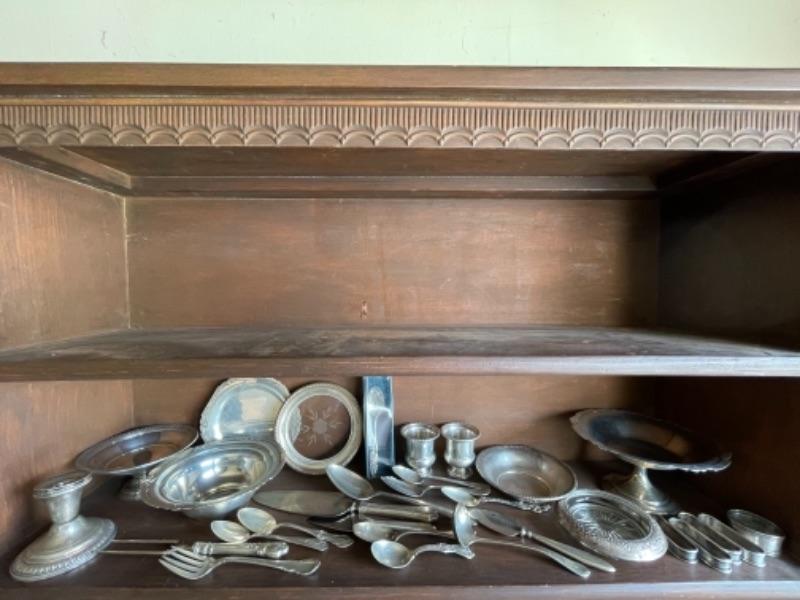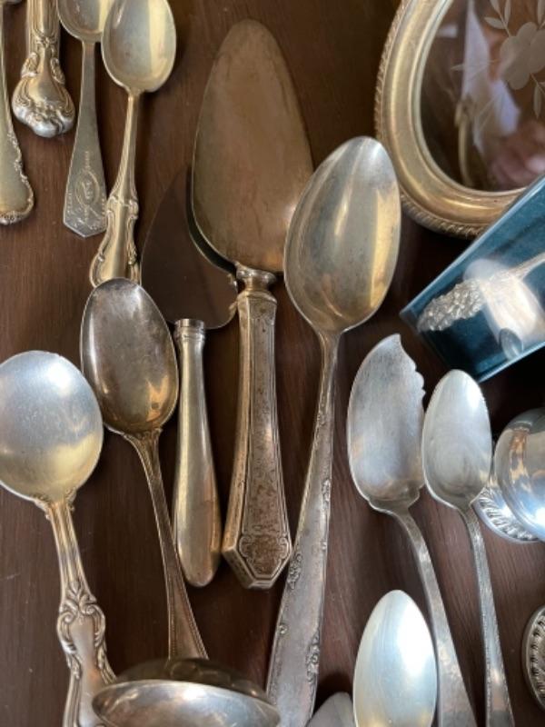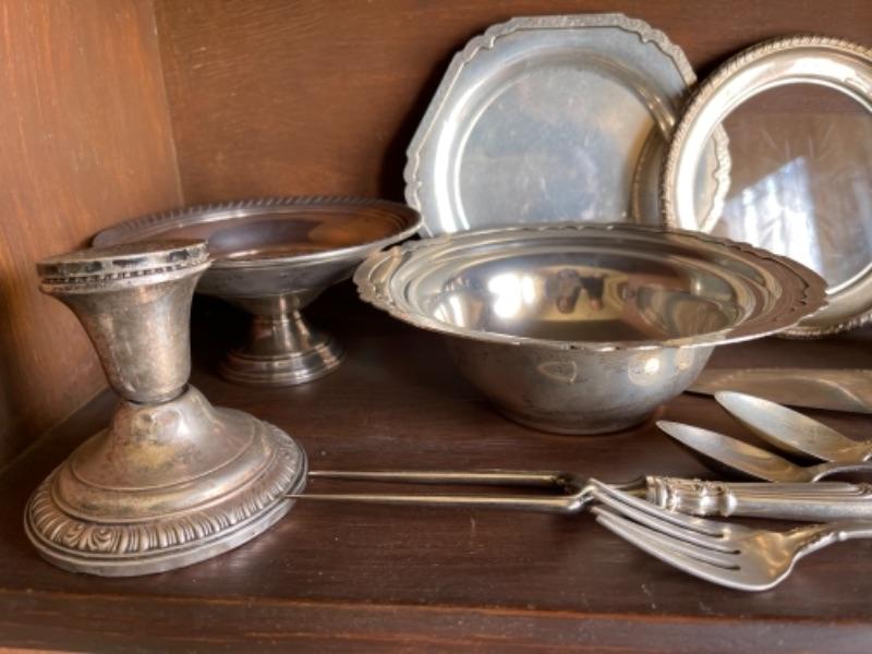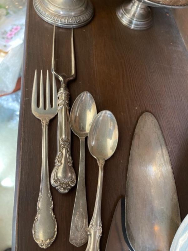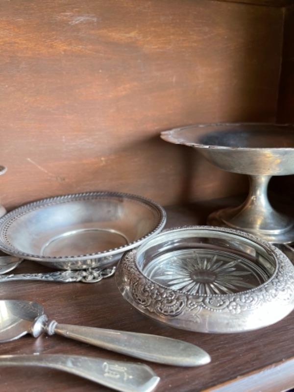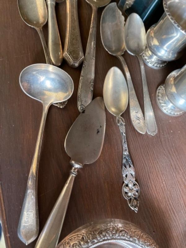Lot 85L. Thirty-one assorted sterling silver smalls, flatware, serving pieces, compotes, candle holder, spoons, napkin rings, cigarette urns, etc.--$295