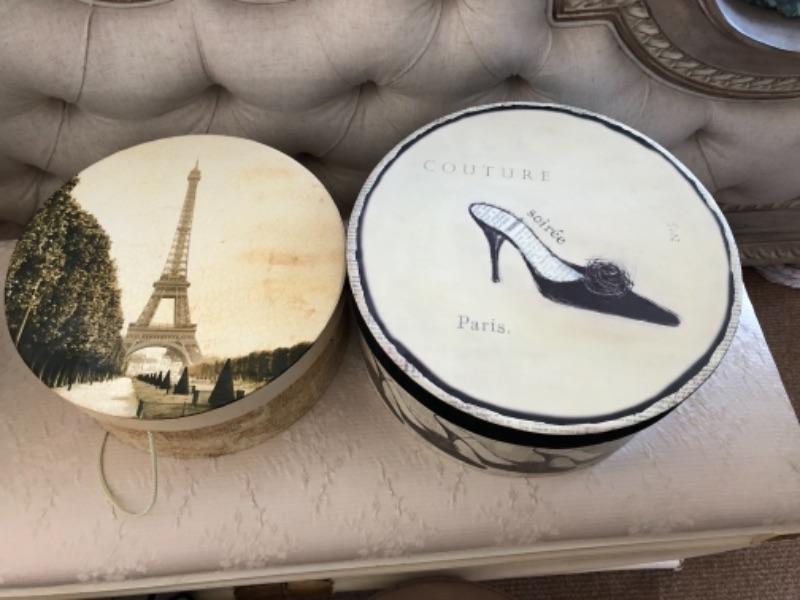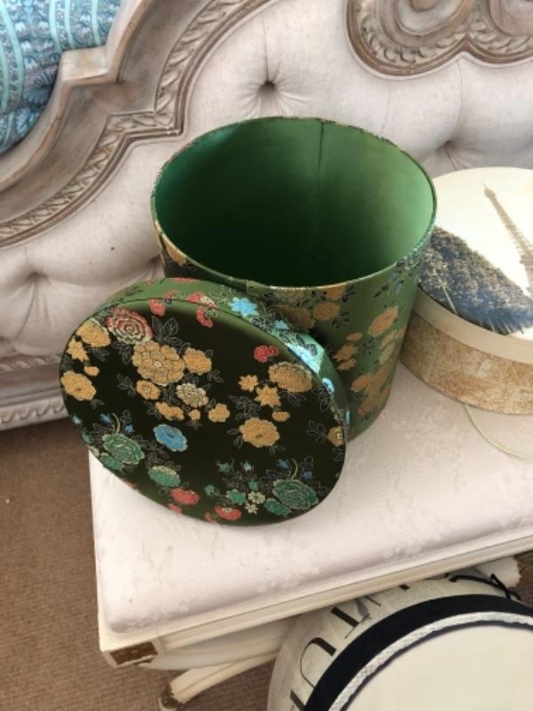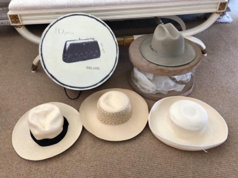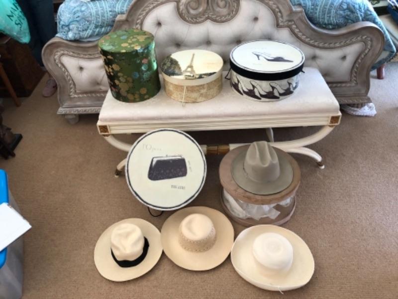 Lot 85U. Six hatboxes, 2 vintage, 3 new, with hats“”one man’s size 7 and 3 woven straw hats--$85