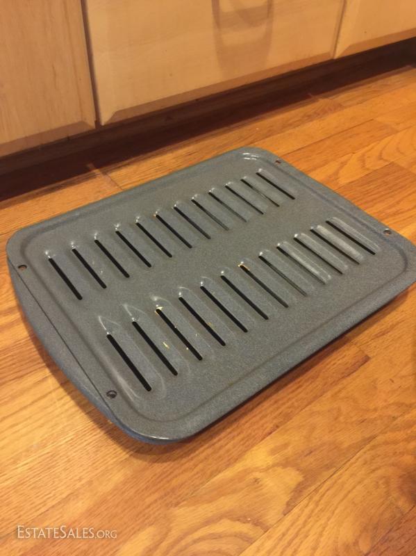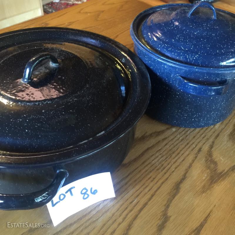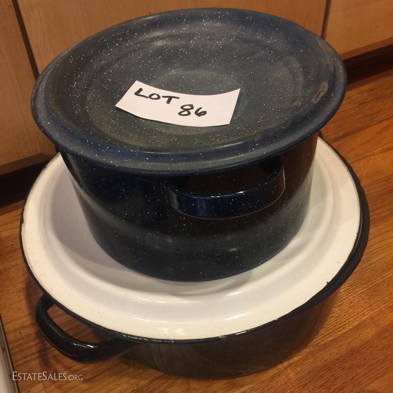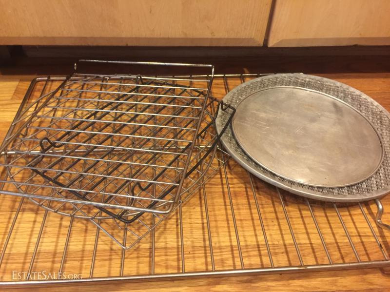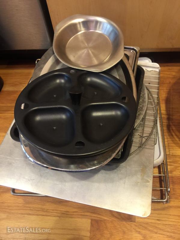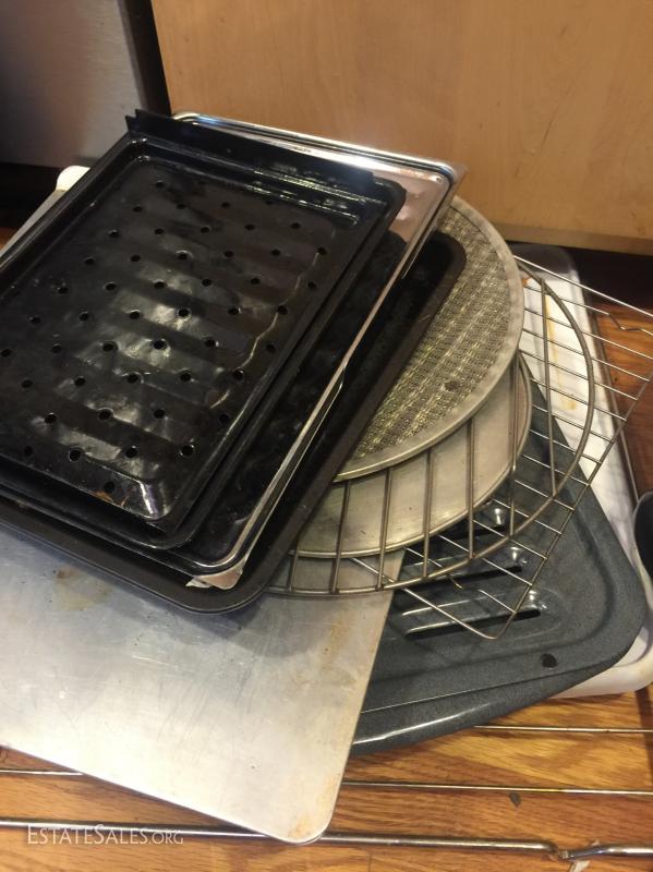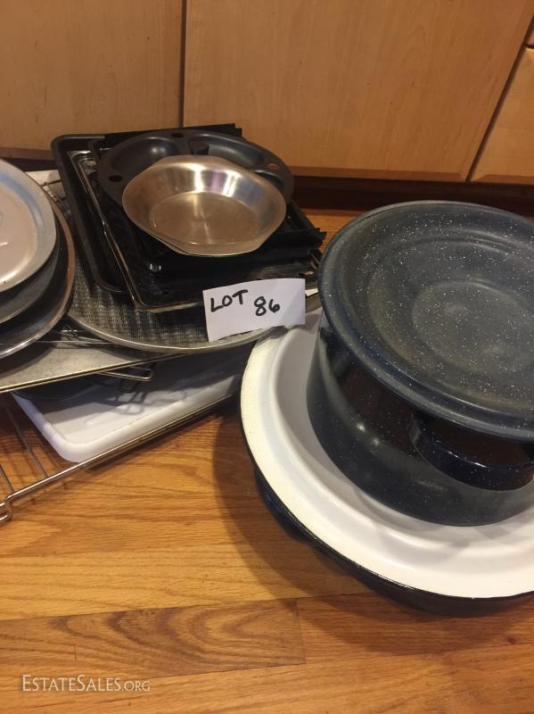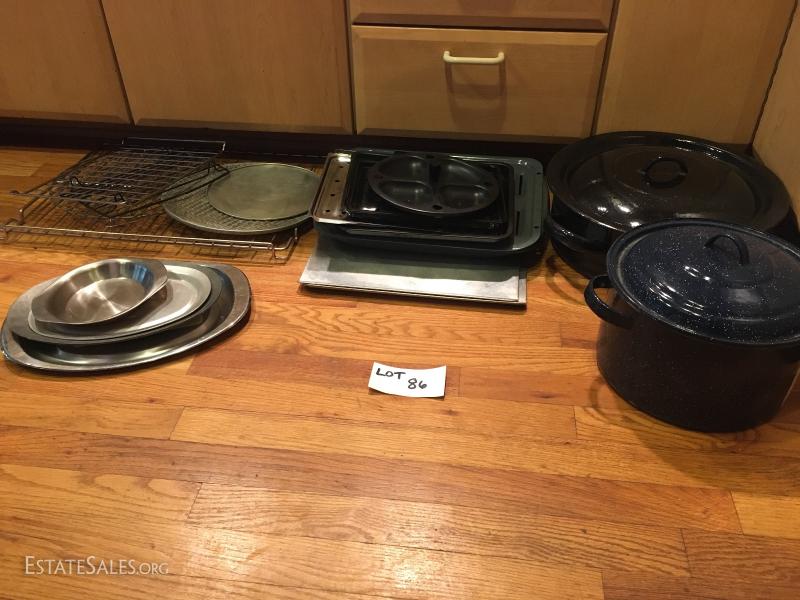 2 covered enamel pots, cookie sheets, cooling racks, various small oven pans.