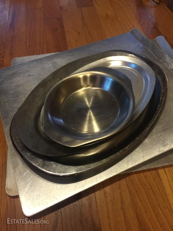 Misc kitchen cookware, pans and mid century stainless serving pieces