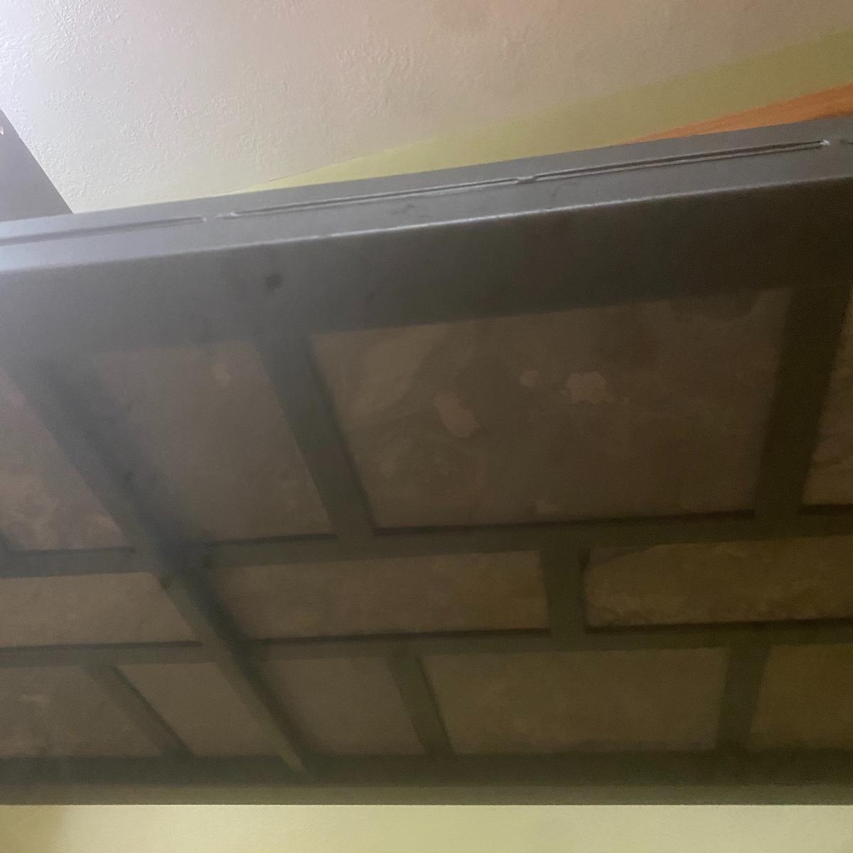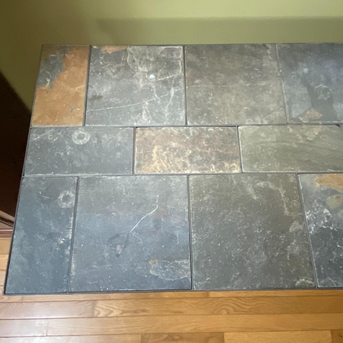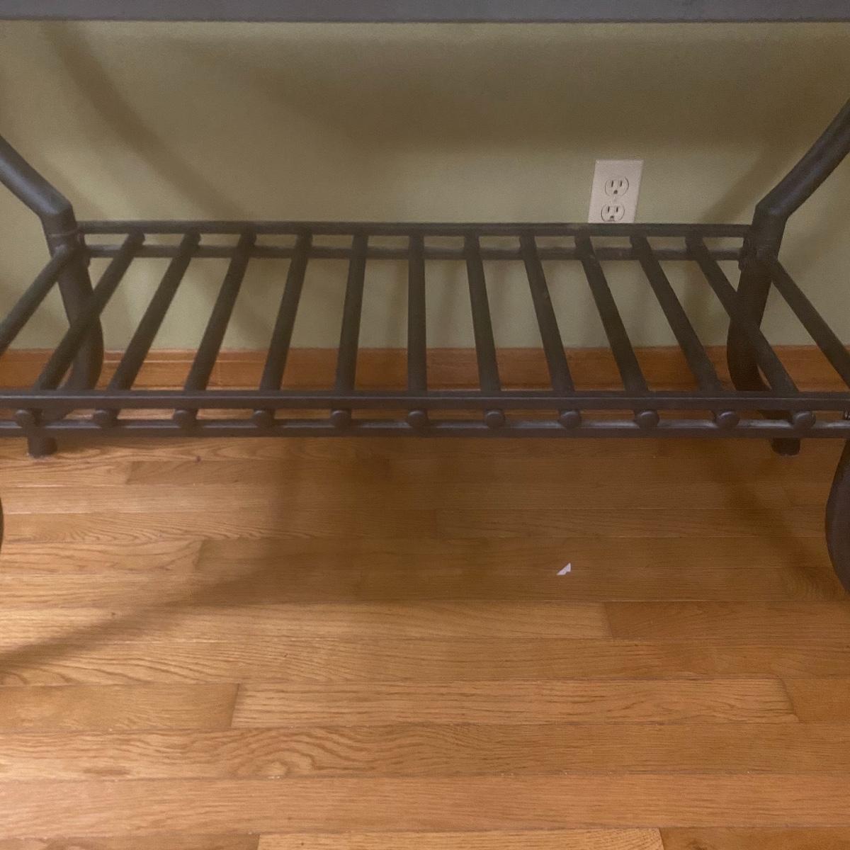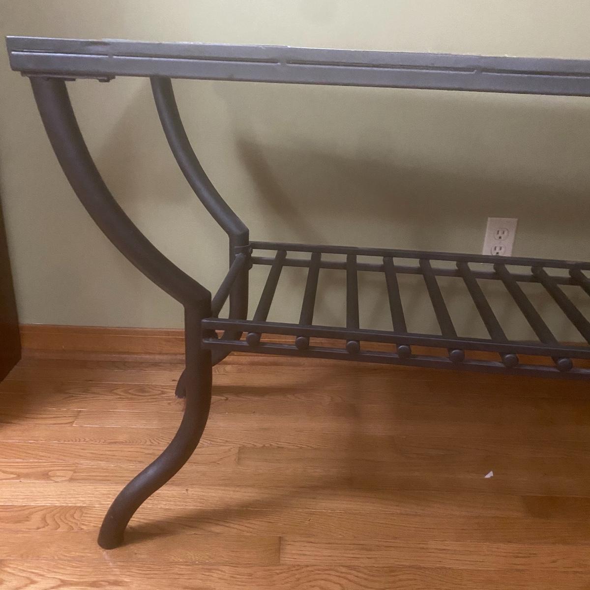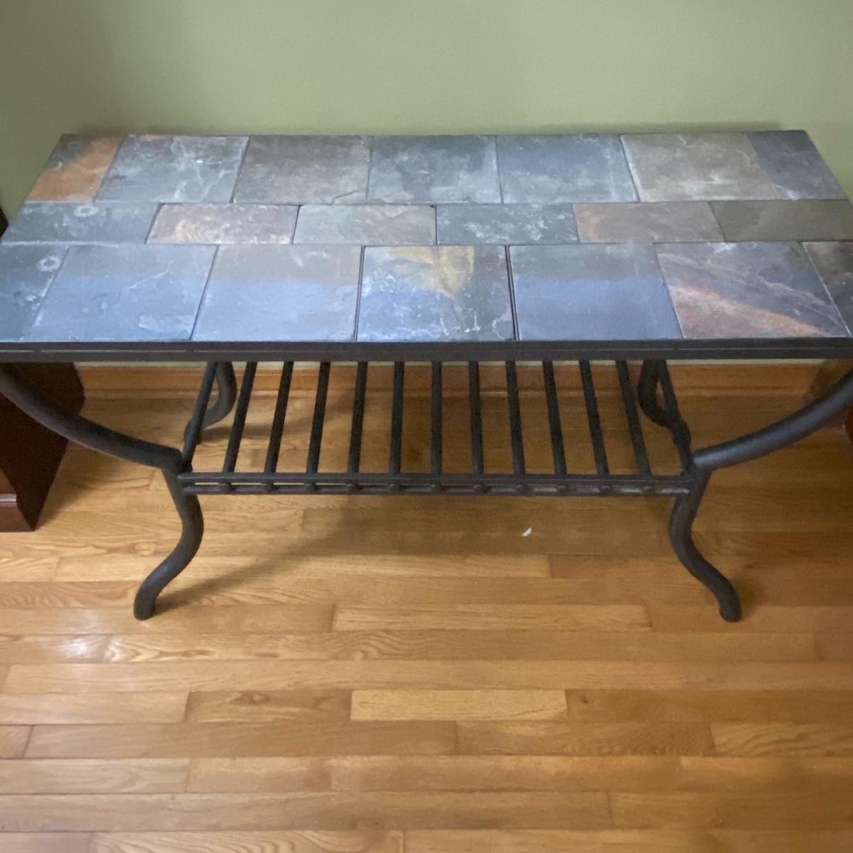 Lot includes a metal table with a stone slated top. Table measures 48”x20”x29”. Table has a bottom storage rack and curved metal feet. Each stone slab can pop out, table fits together like a perfect puzzle. See photos. Local pickup only.