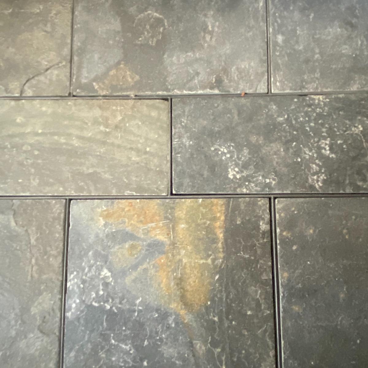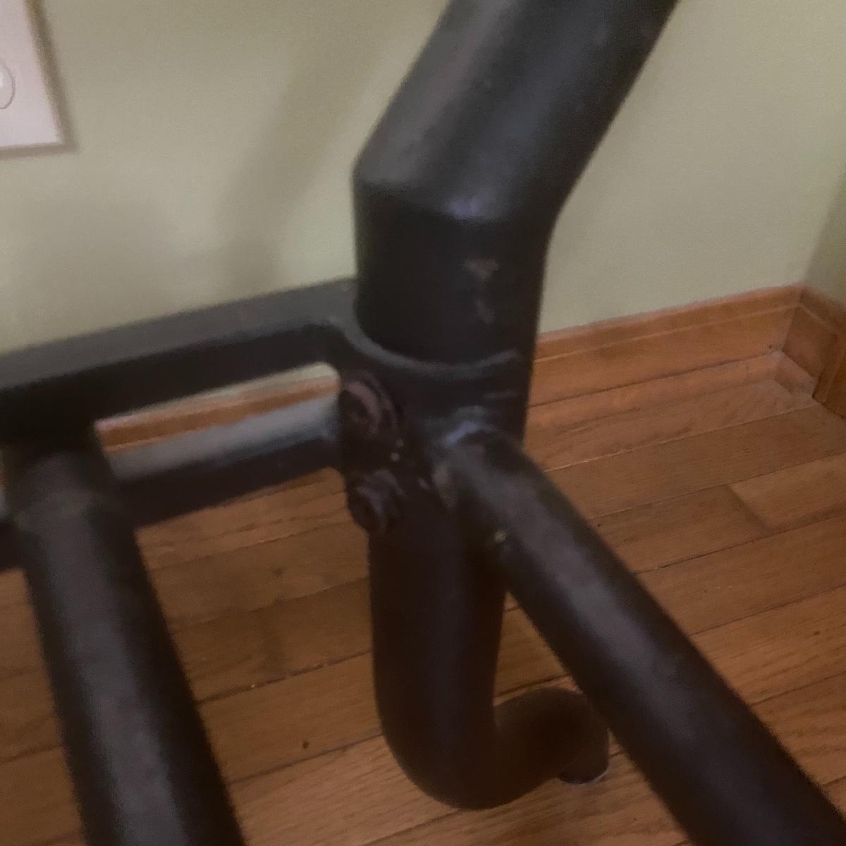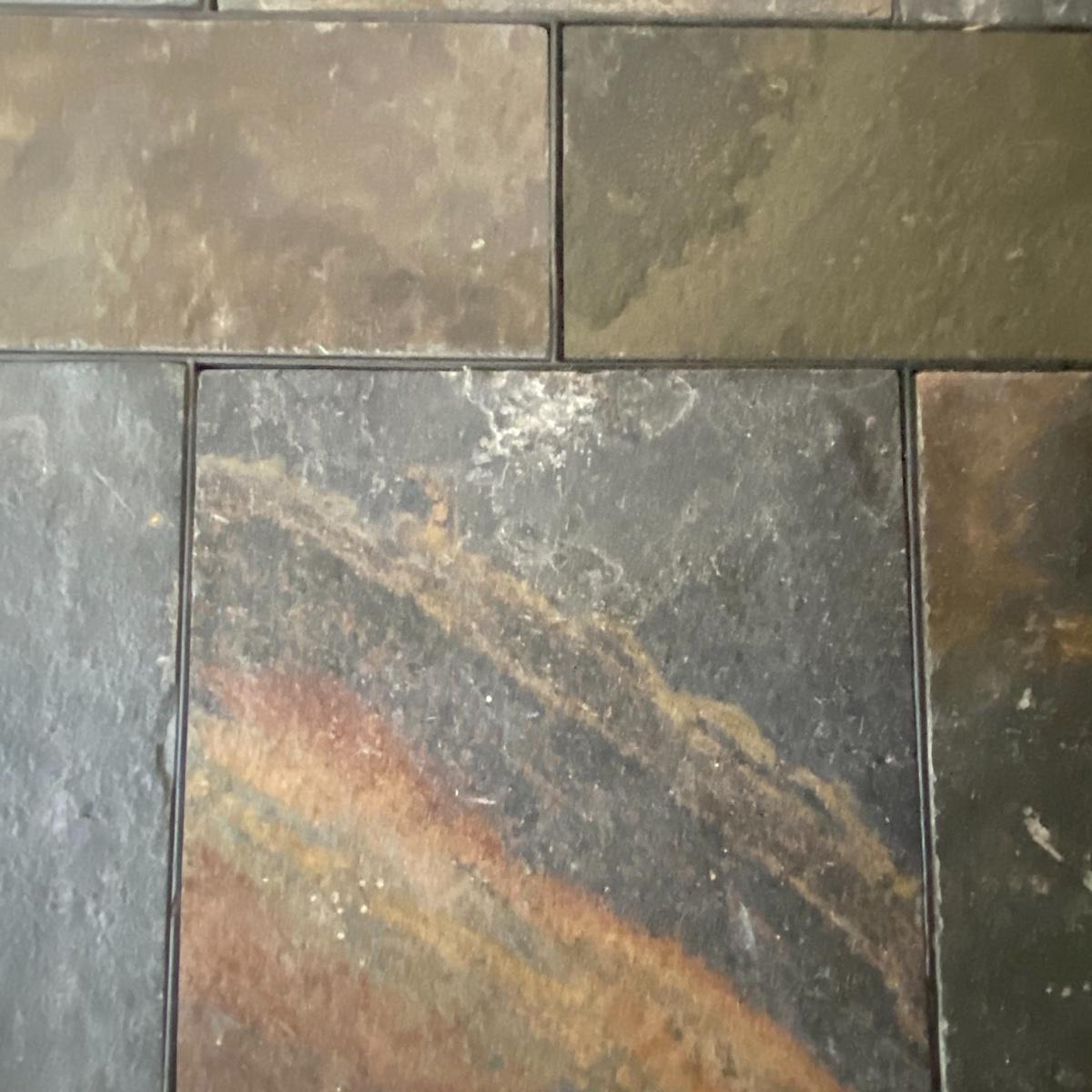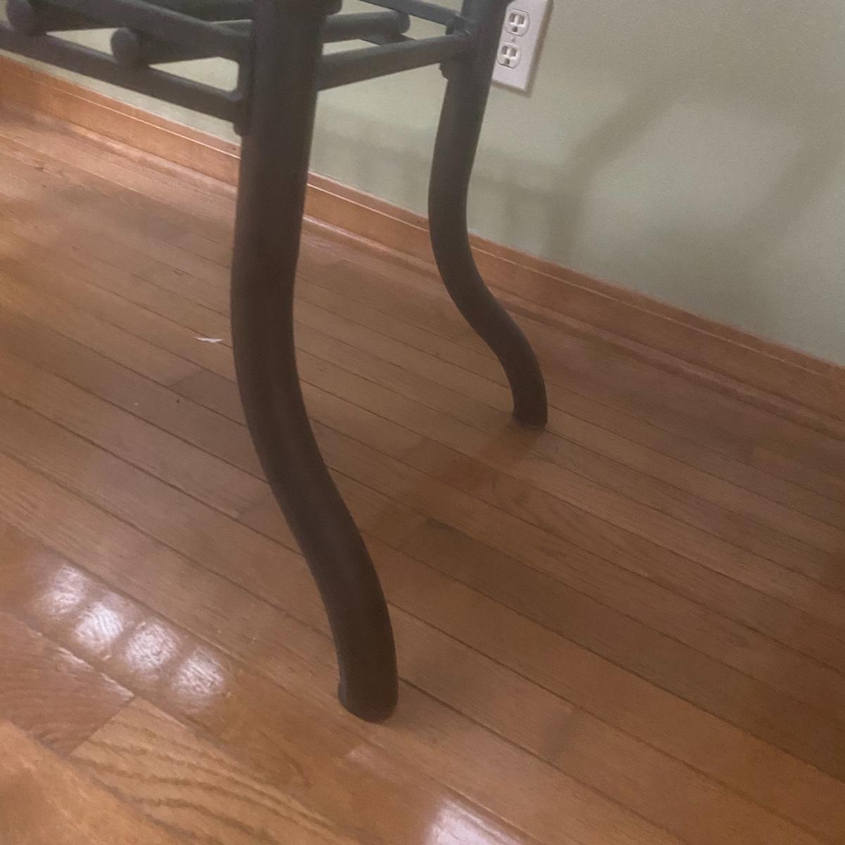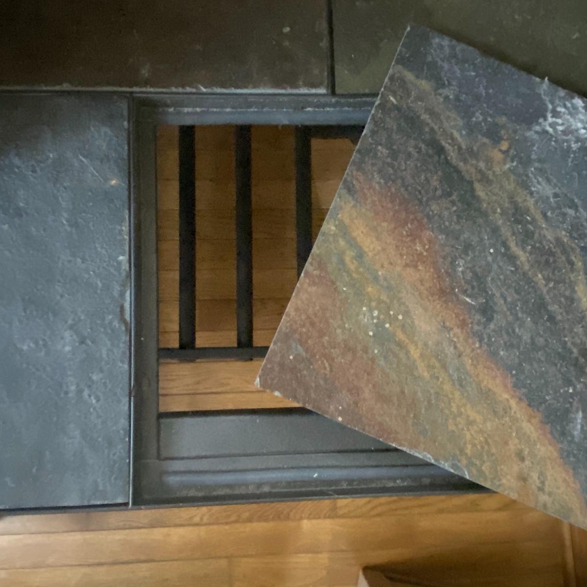 Lot includes a metal table with a stone slated top. Table measures 48”x20”x29”. Table has a bottom storage rack and curved metal feet. Each stone slab can pop out, table fits together like a perfect puzzle. See photos. Local pickup only.