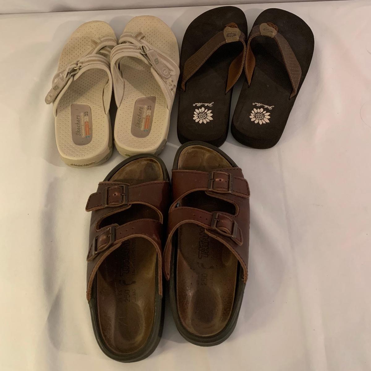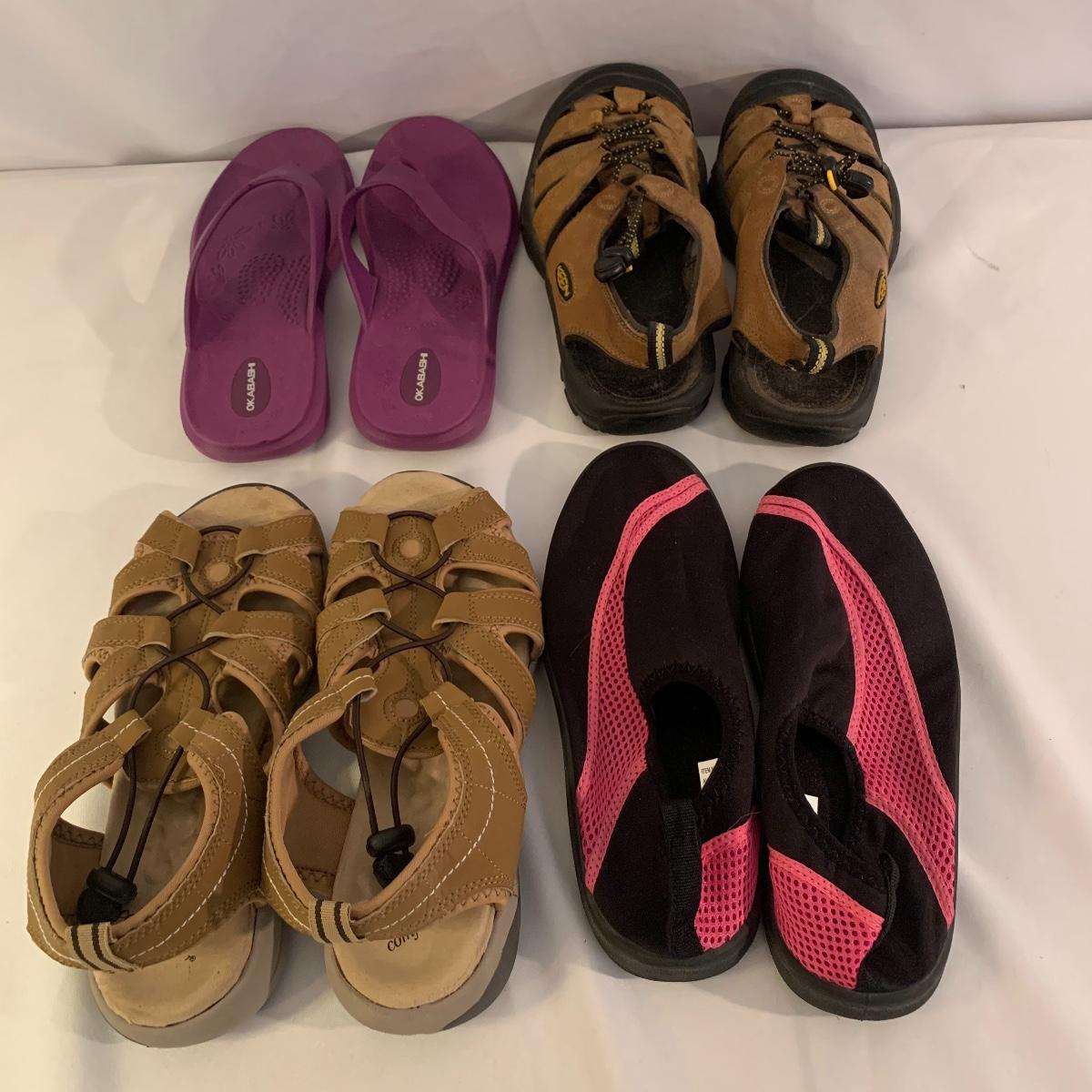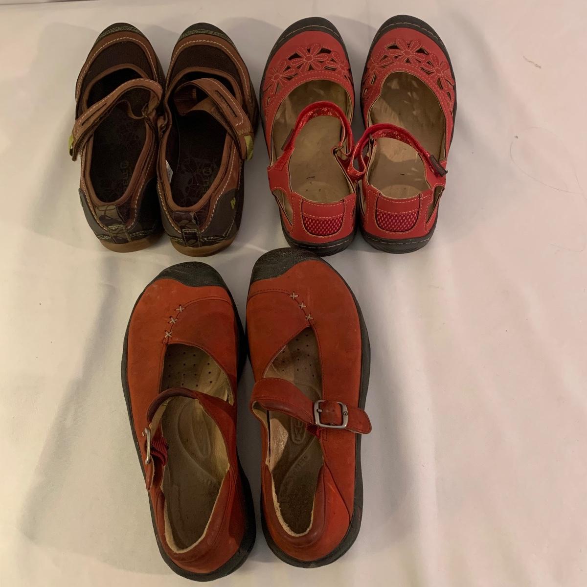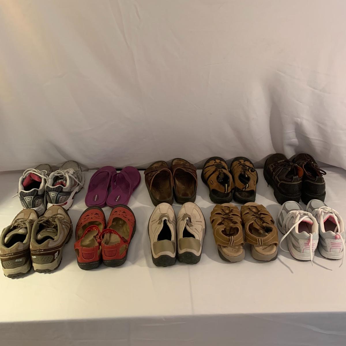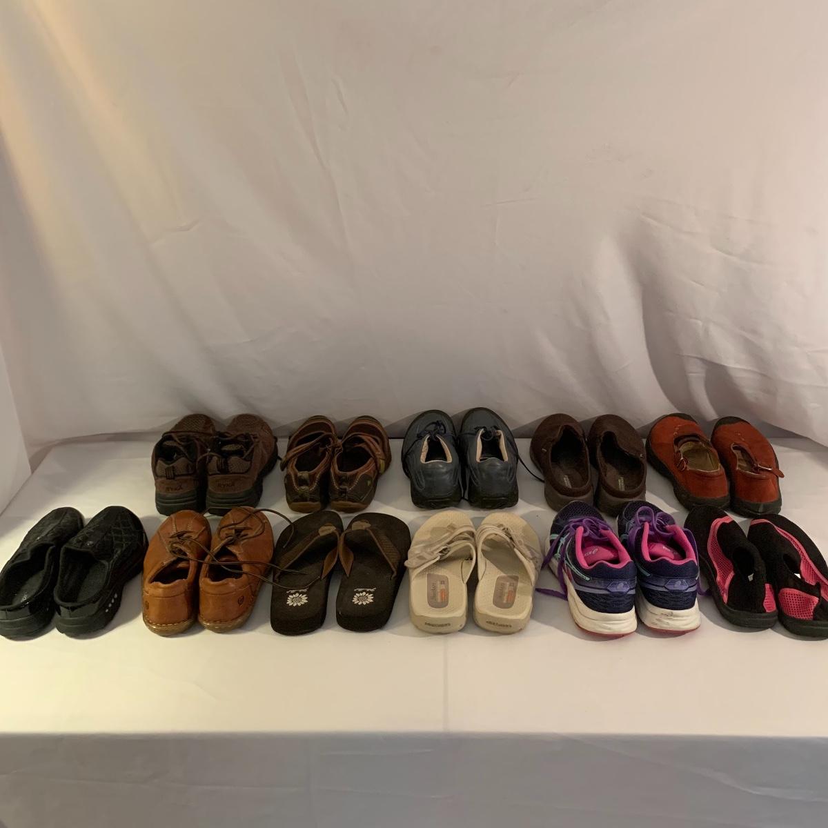 This lot includes a large variety of shoes from sneakers to water shoes. The sizes range between a women’s 7-9. Some of the brands included are Mudd, Keen, New Balance, Saucany, Born, Birkenstock, and more. The lot also includes a pair of Algeria shoes new in box. The Mudd chunky sole oxfords are a size 9. The Keen sandals are a women’s 8-8.5. The new balances are a size 8. The Birkenstock’s are a size 8. Shipping available.