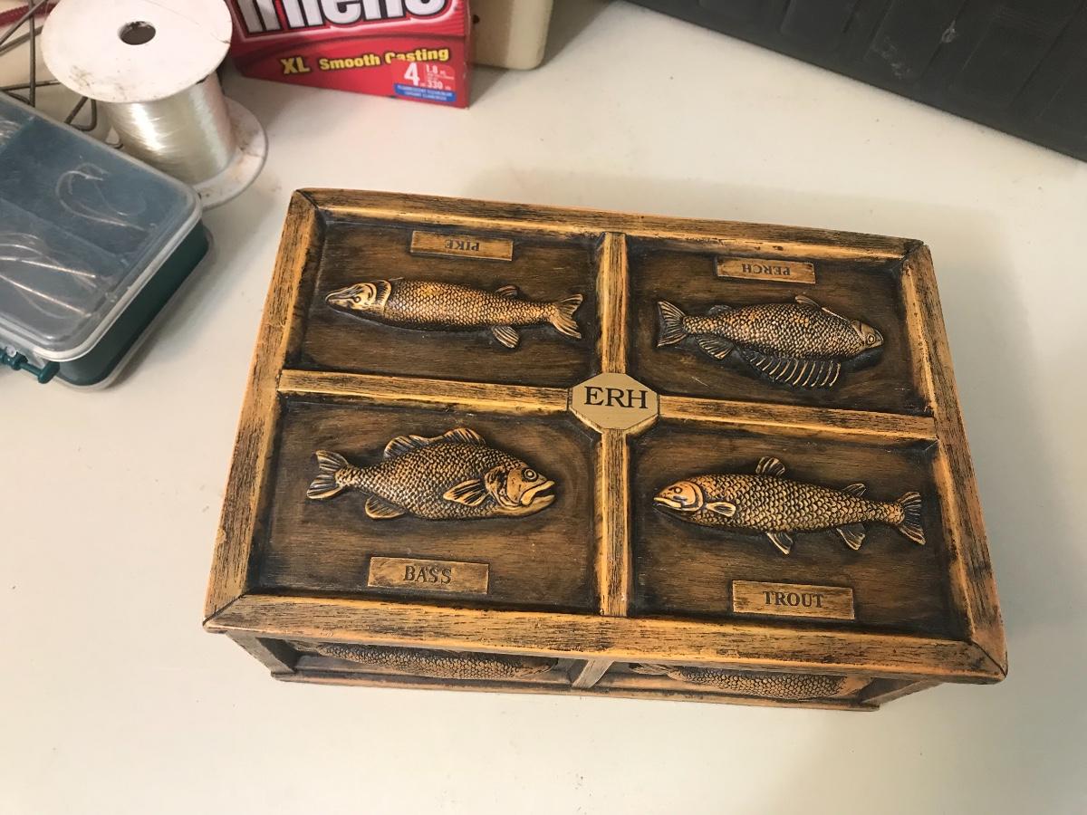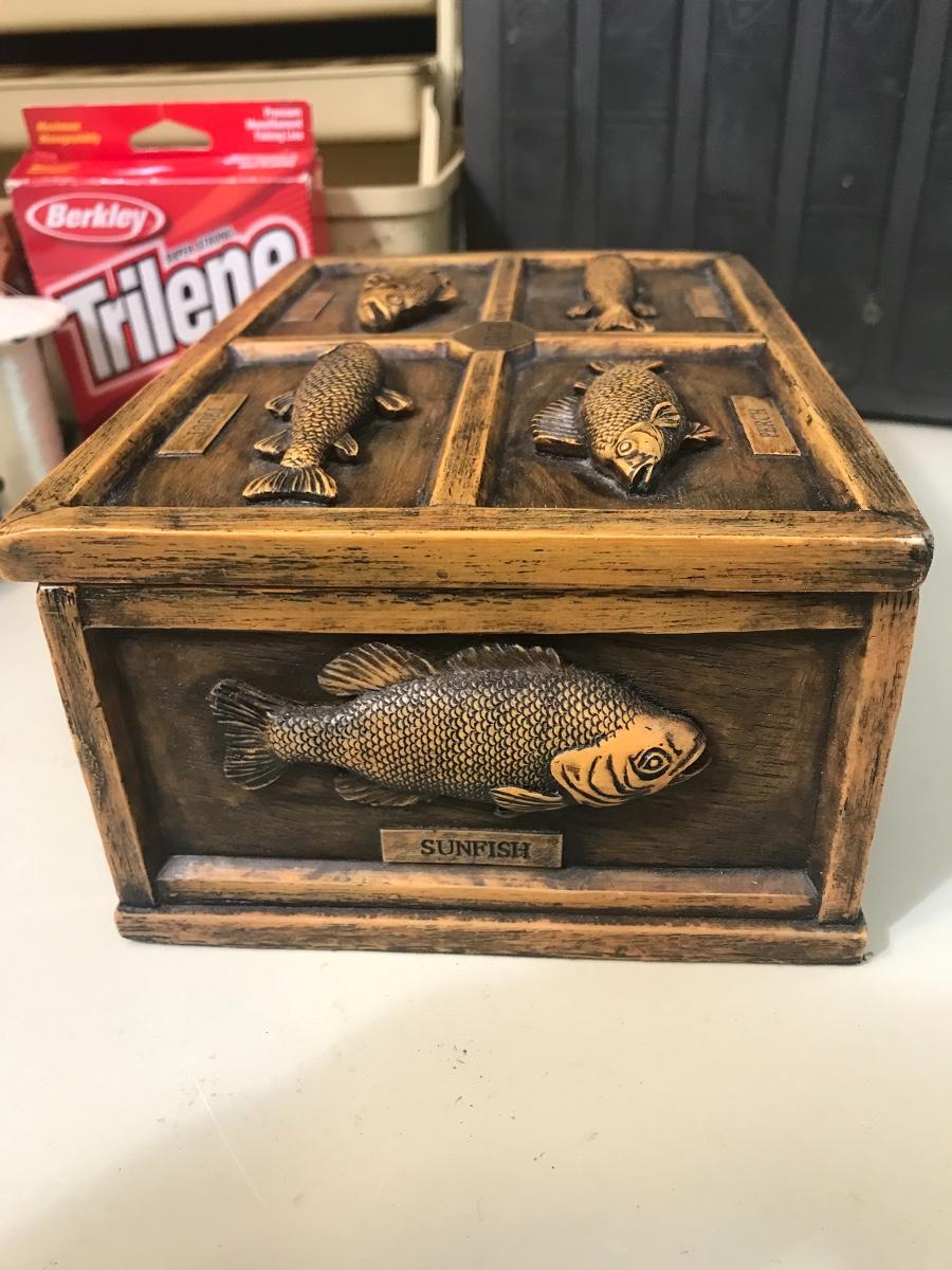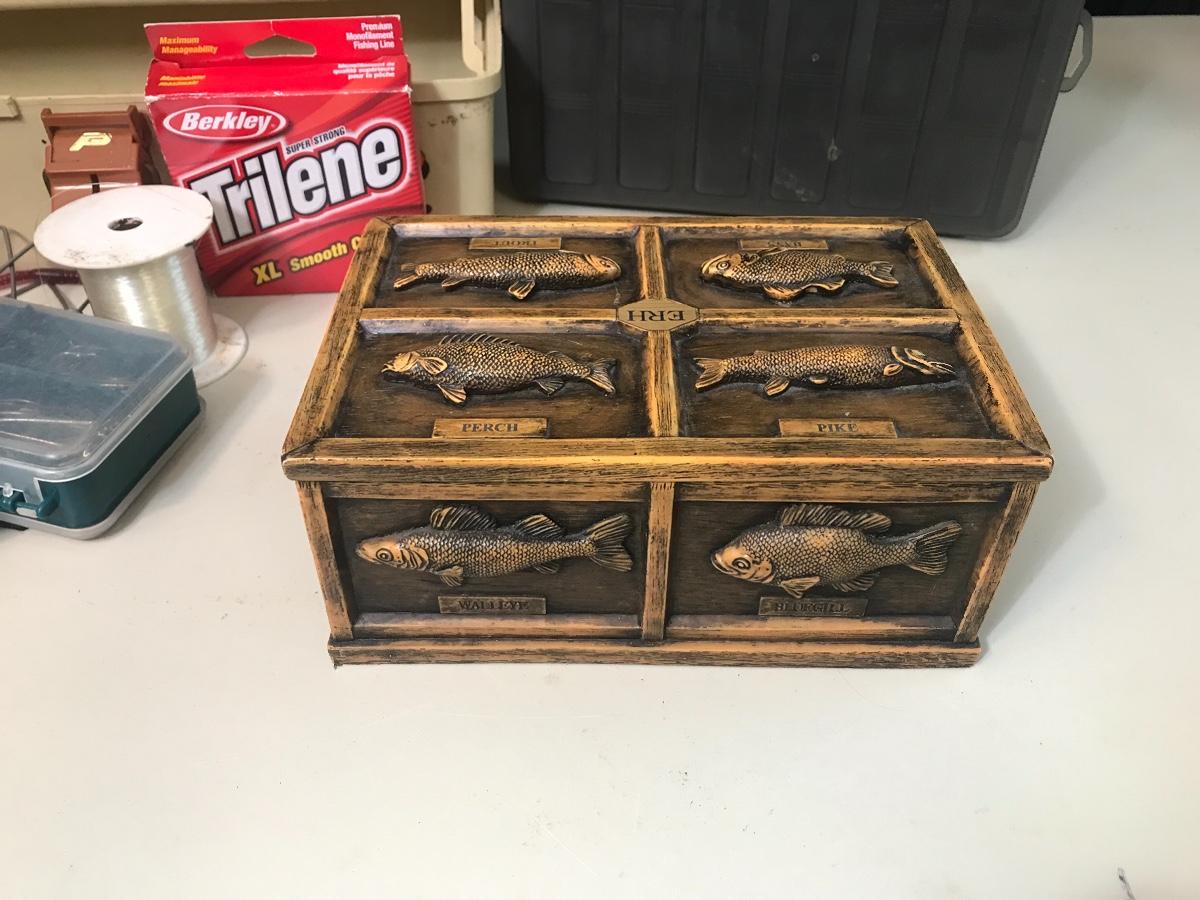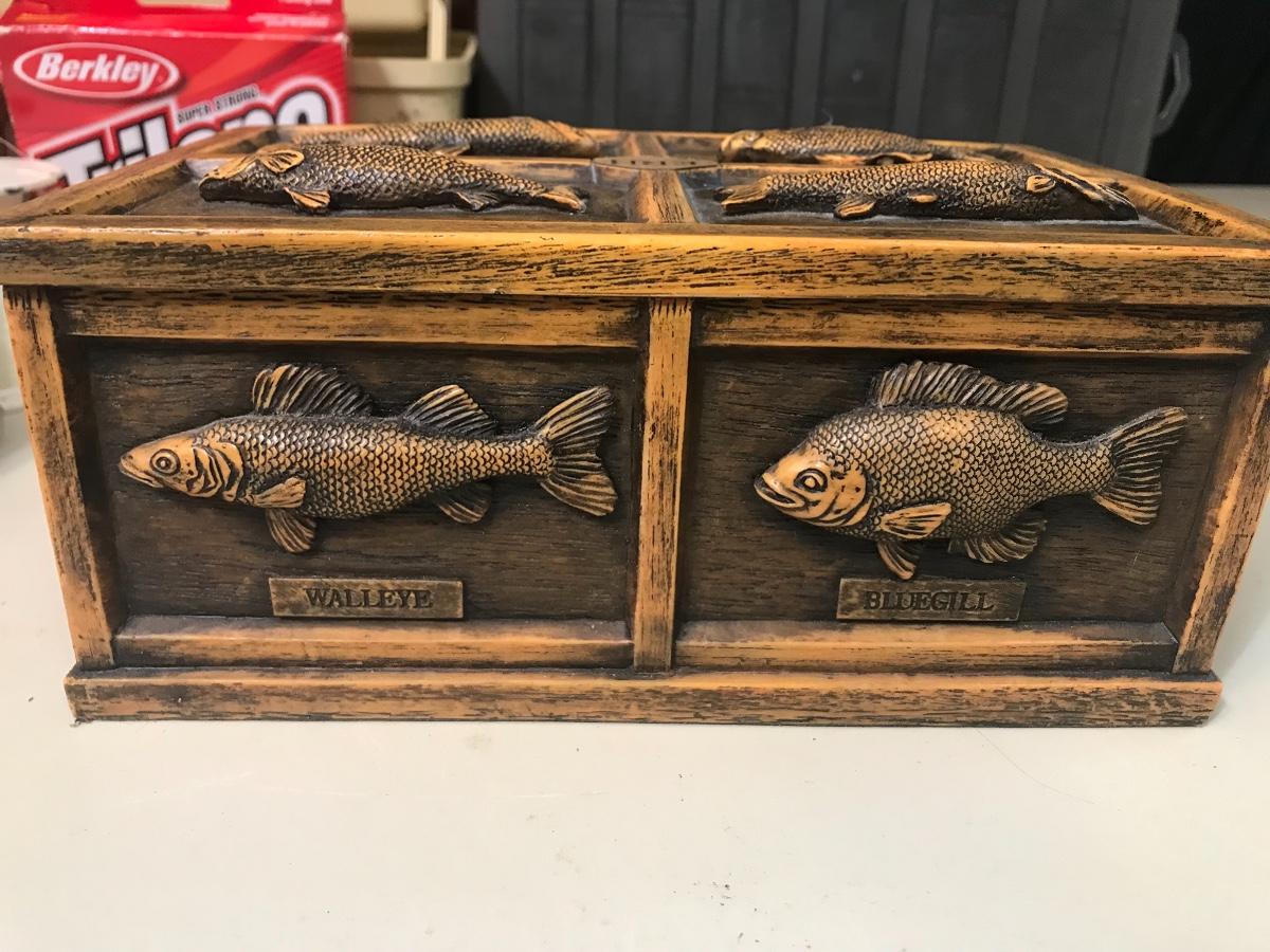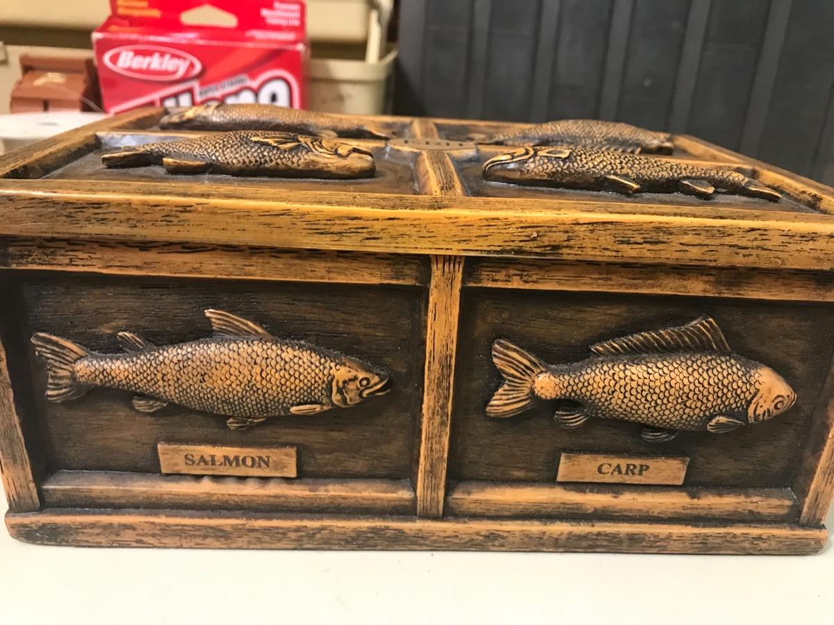 Fishing Gear And Decor- Tackle Boxes, Reels & More - Heavy ceramic decorative fish species box and trinket dish.