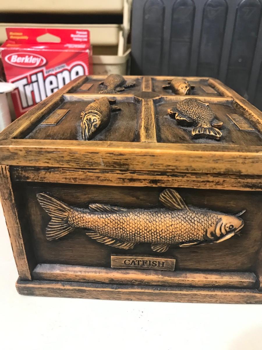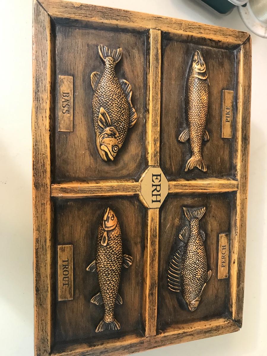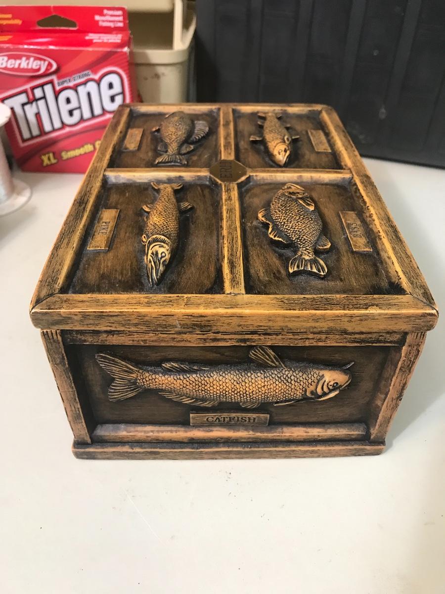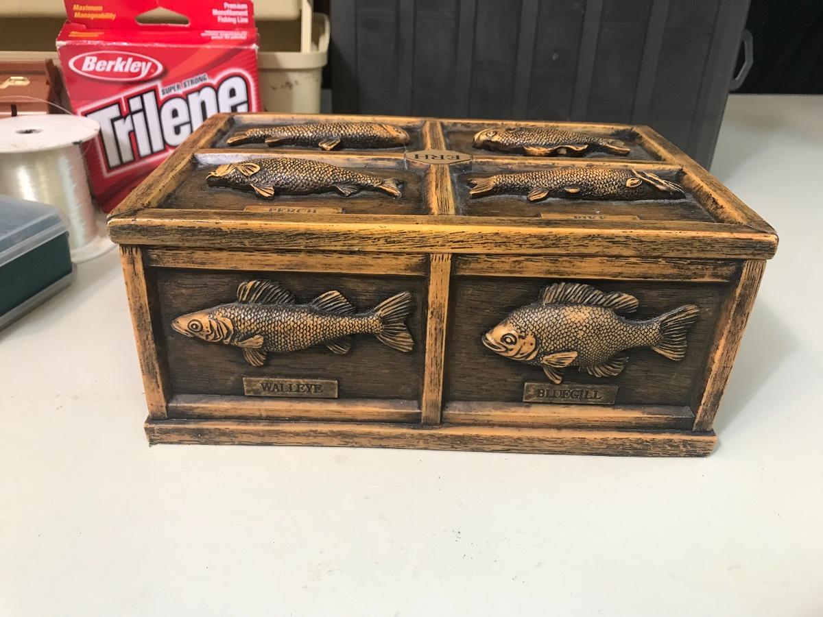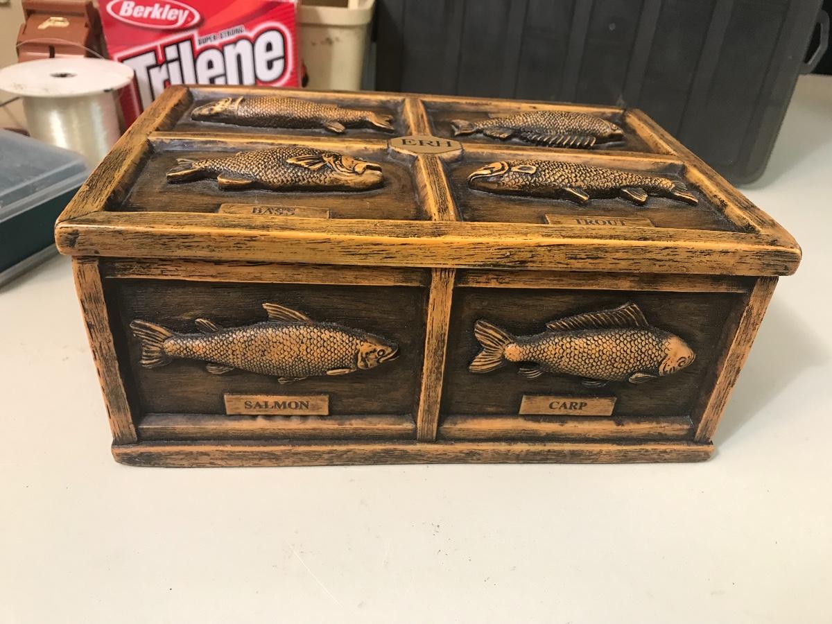 Fishing Gear And Decor- Tackle Boxes, Reels & More - Heavy ceramic decorative fish species box and trinket dish.