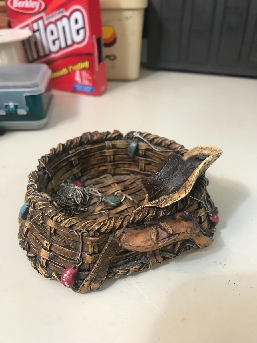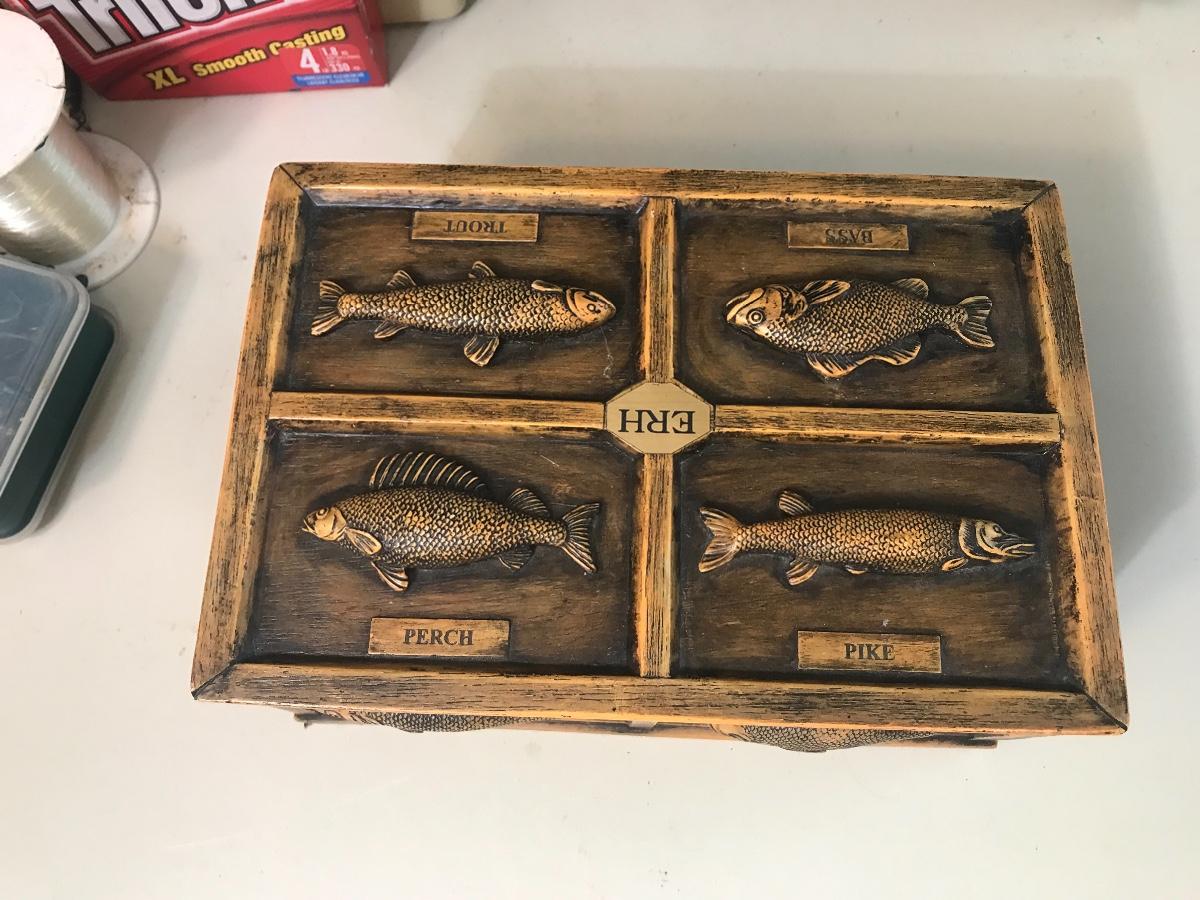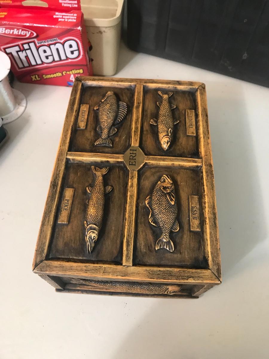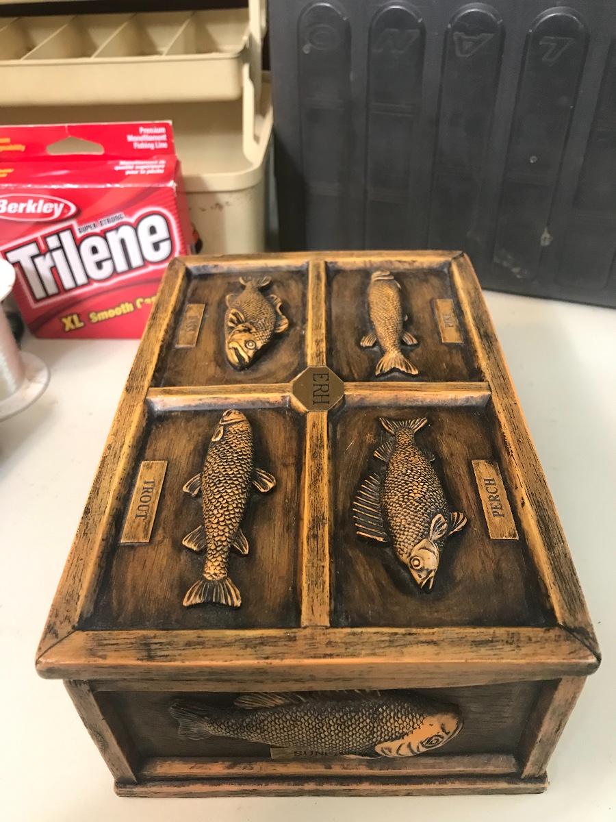 Fishing Gear And Decor- Tackle Boxes, Reels & More - Heavy ceramic decorative fish species box and trinket dish.