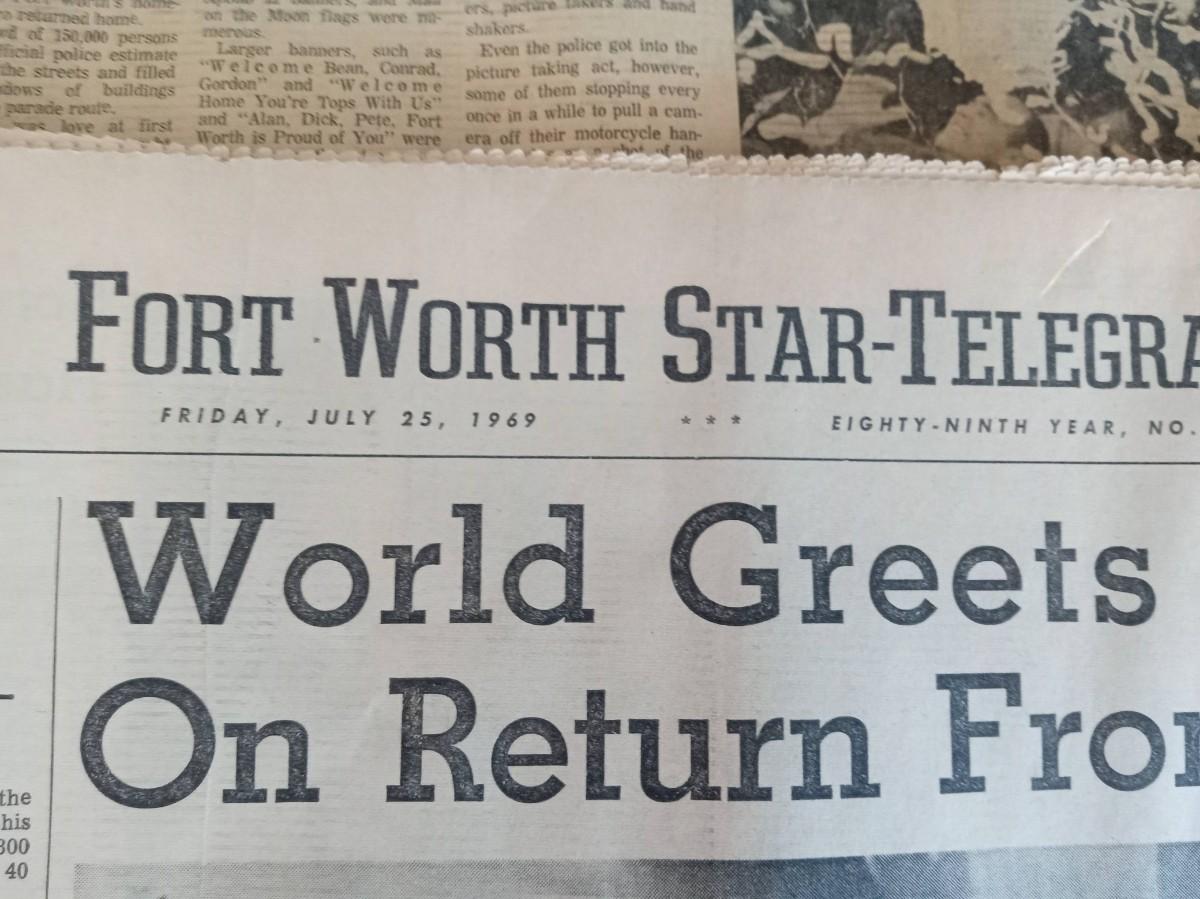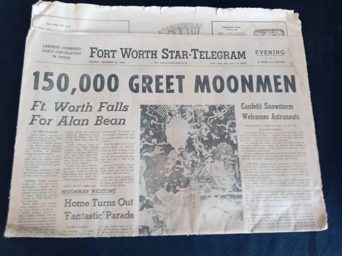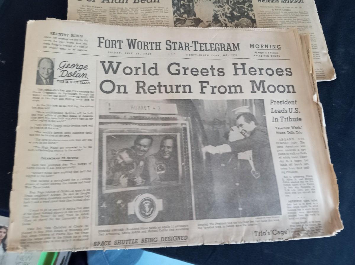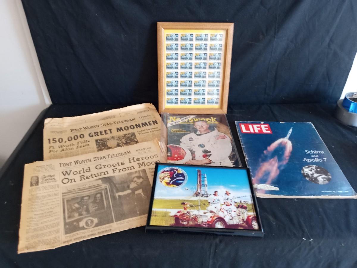 1968 LIFE MAGAZINE, 1969 NEWSWEEK, FULL SHEET OF POSTAGE STAMPS "FIRST MAN ON THE MOON", 2 FORT WORTH NEWSPAPERS FROM 1969