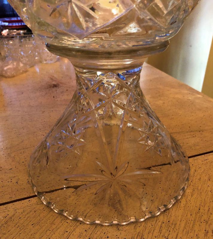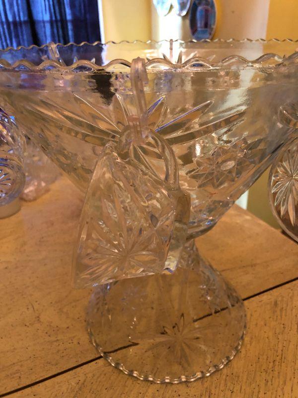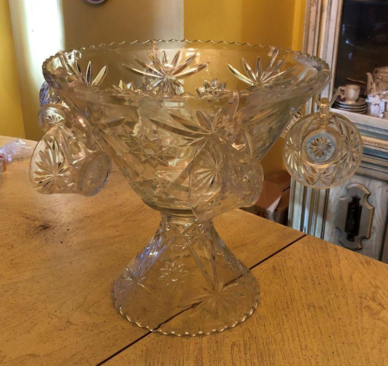 This pattern was made by Anchor Hocking beginning in the 1960s until the early 2000s. It is in excellent condition and has the base, the bowl, 6 cups, 6 plastic hooks, and a plastic ladle (the ladle isn't shown in the pictures).