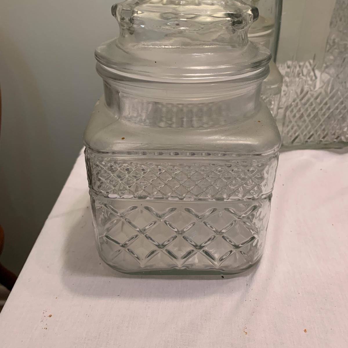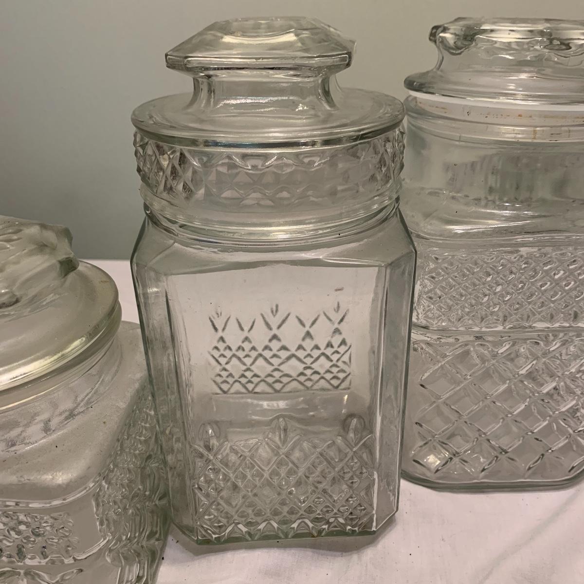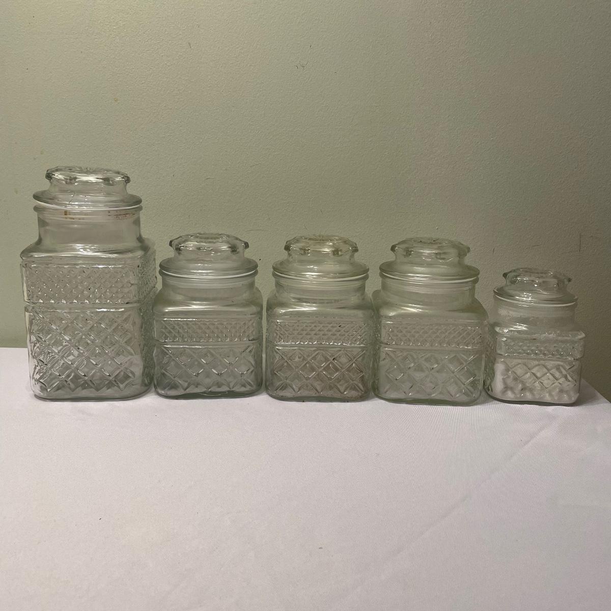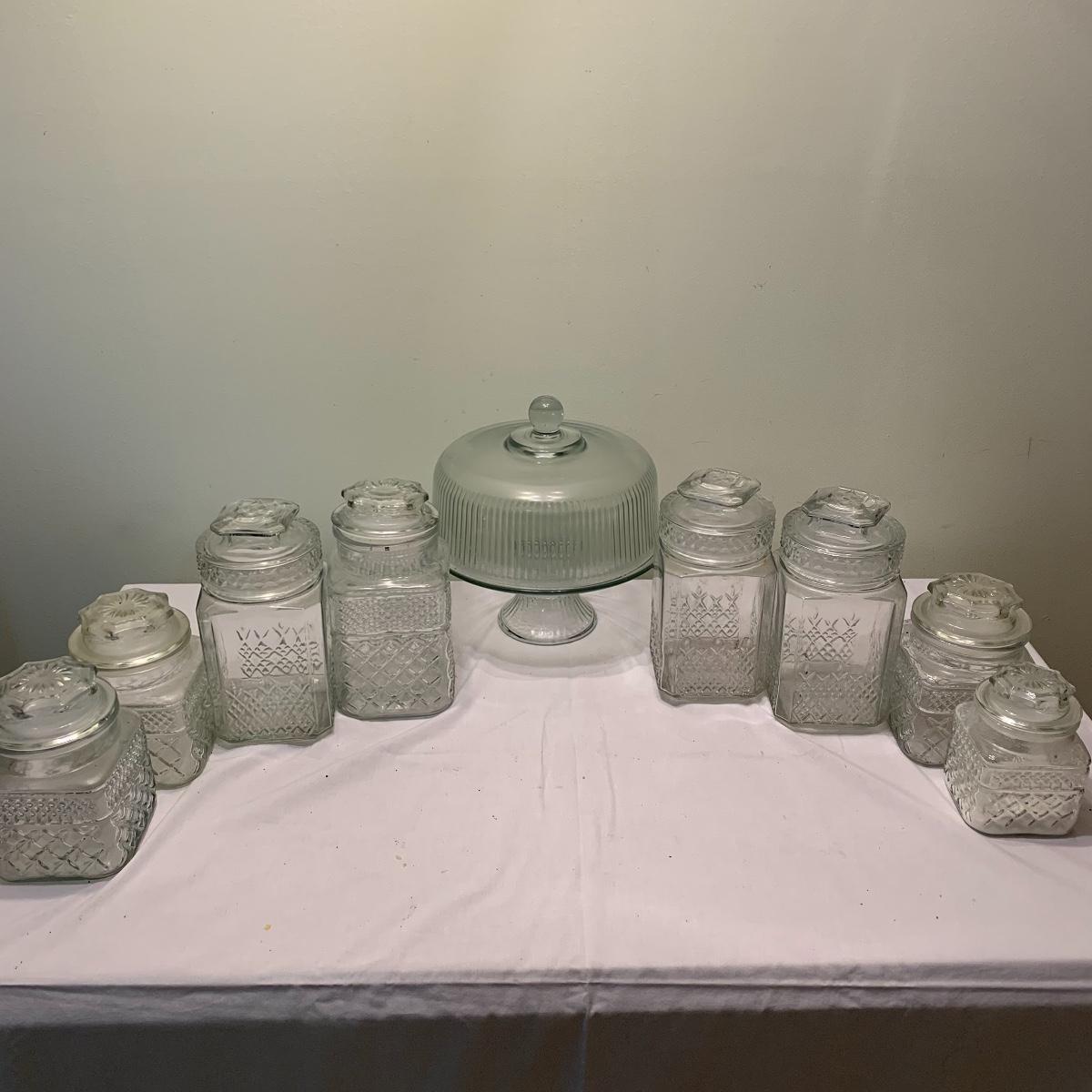 Meet your kitchen storage needs here! This lot includes two sets of matching glass canisters of different sizes. One set has three identical canisters and the other has five matching canisters of various sizes. All are in good condition but could use a good cleaning. Also included is a beautiful 11”d x 4.5” cake stand and a 4” tall clear lid. Shipping available.