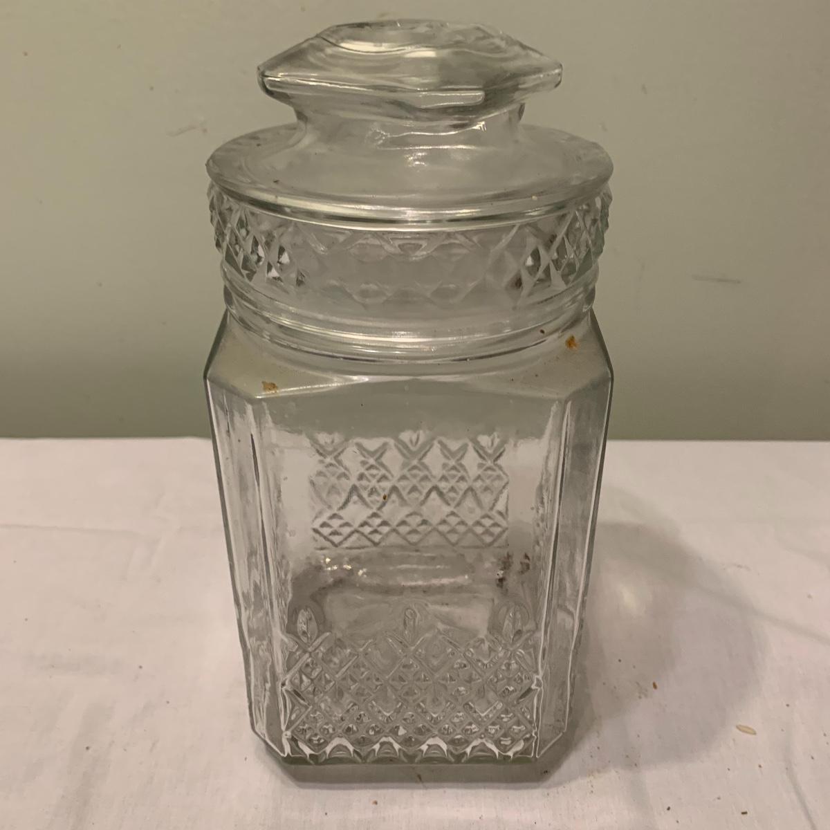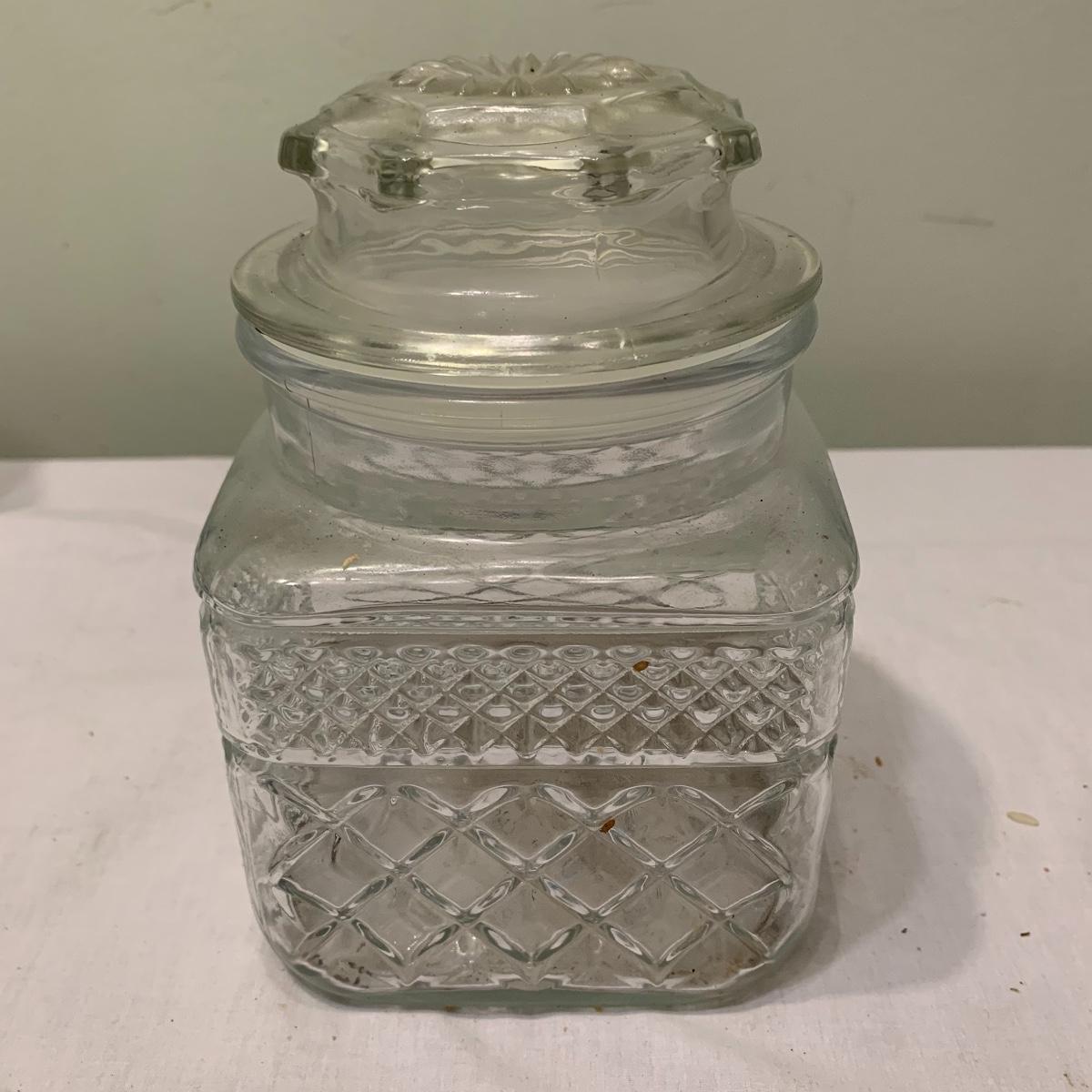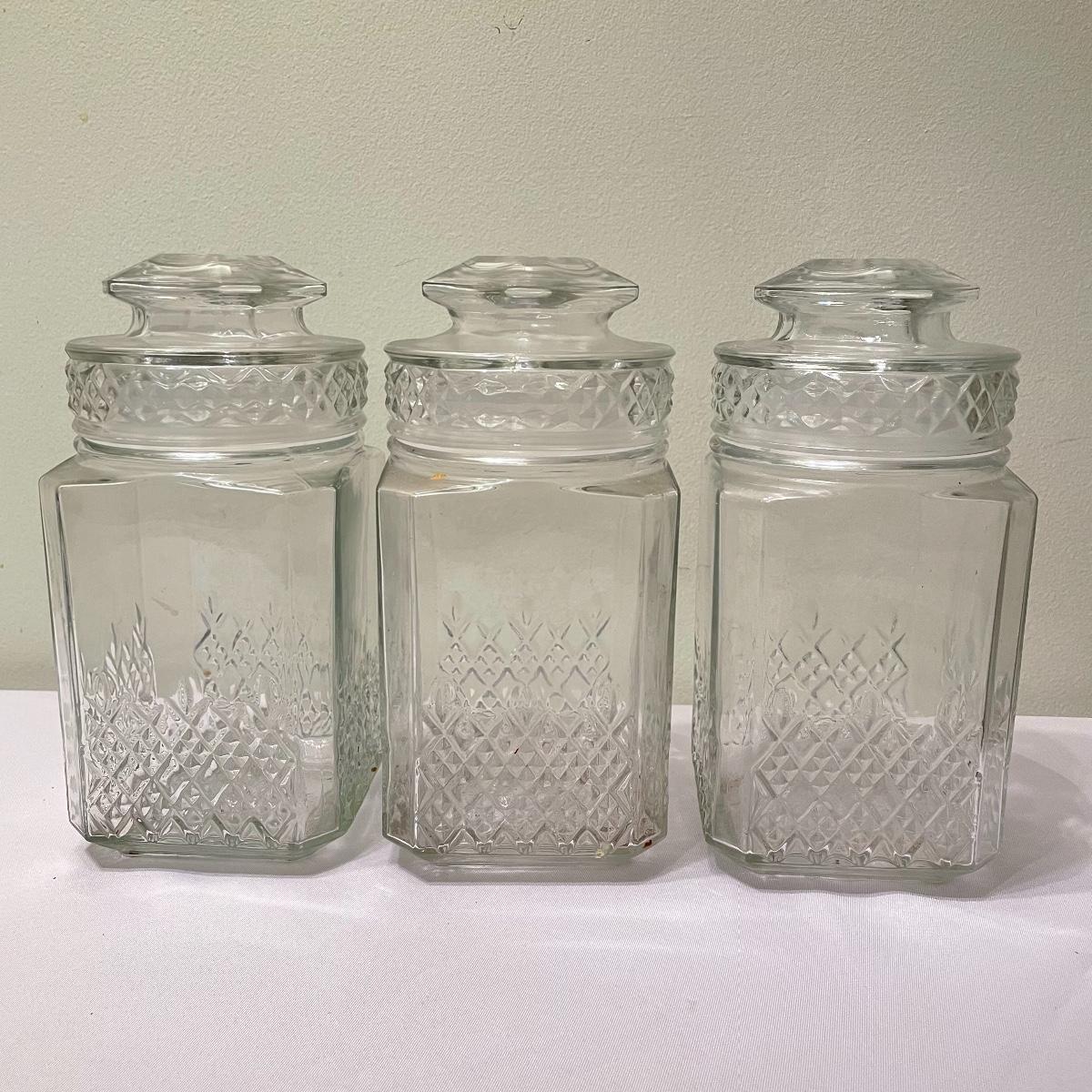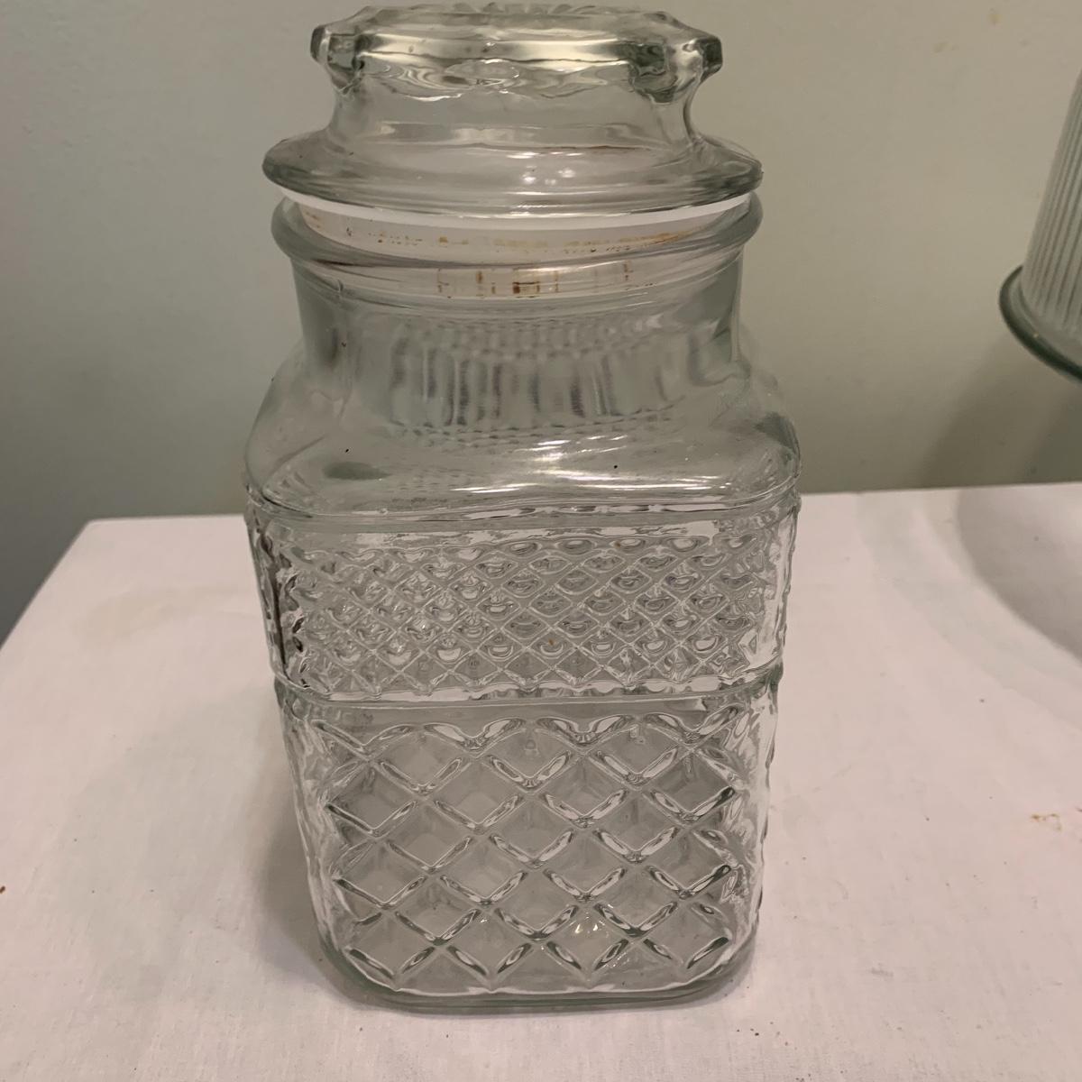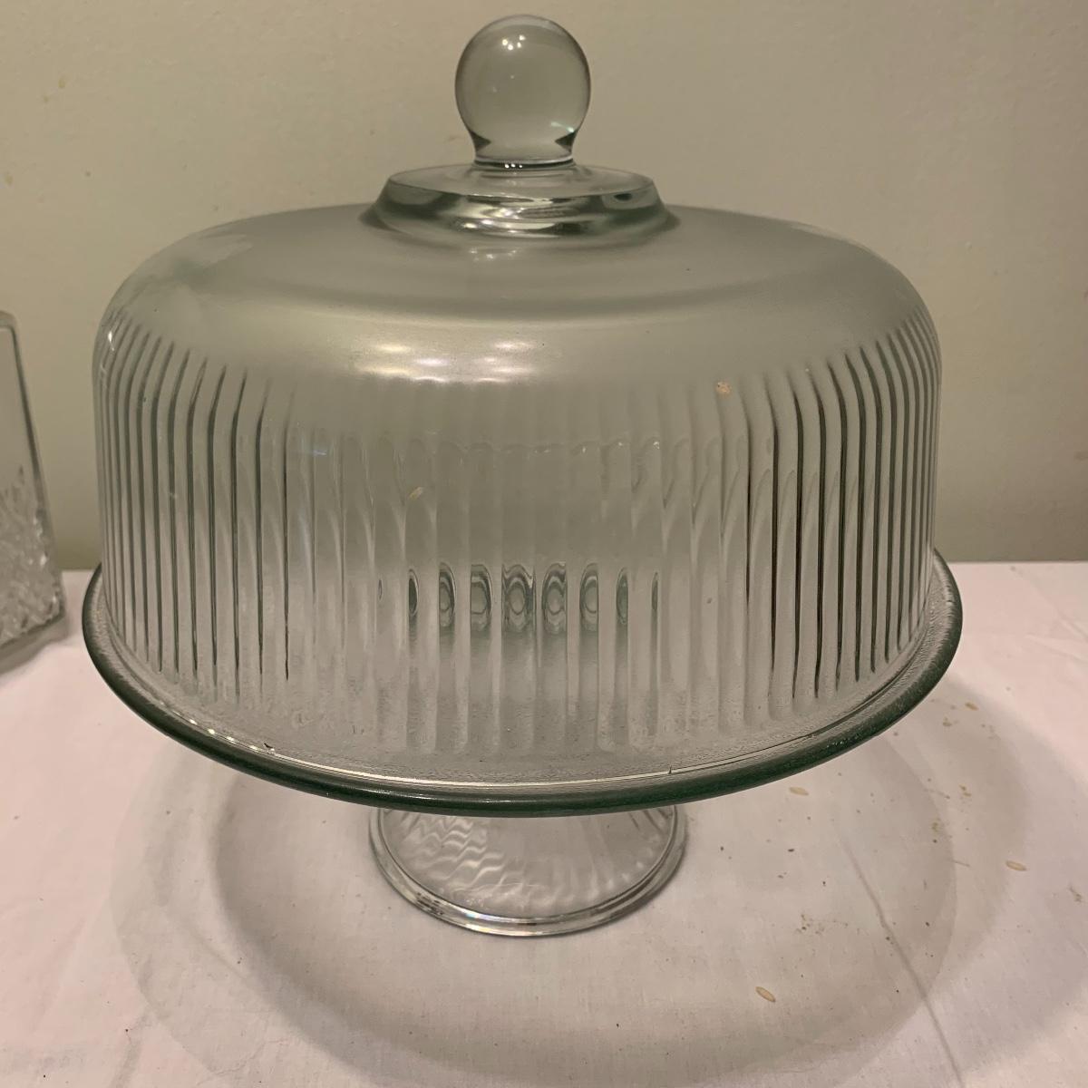 Meet your kitchen storage needs here! This lot includes two sets of matching glass canisters of different sizes. One set has three identical canisters and the other has five matching canisters of various sizes. All are in good condition but could use a good cleaning. Also included is a beautiful 11”d x 4.5” cake stand and a 4” tall clear lid. Shipping available.