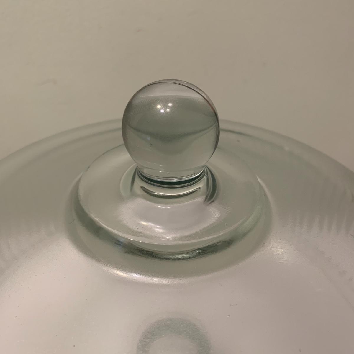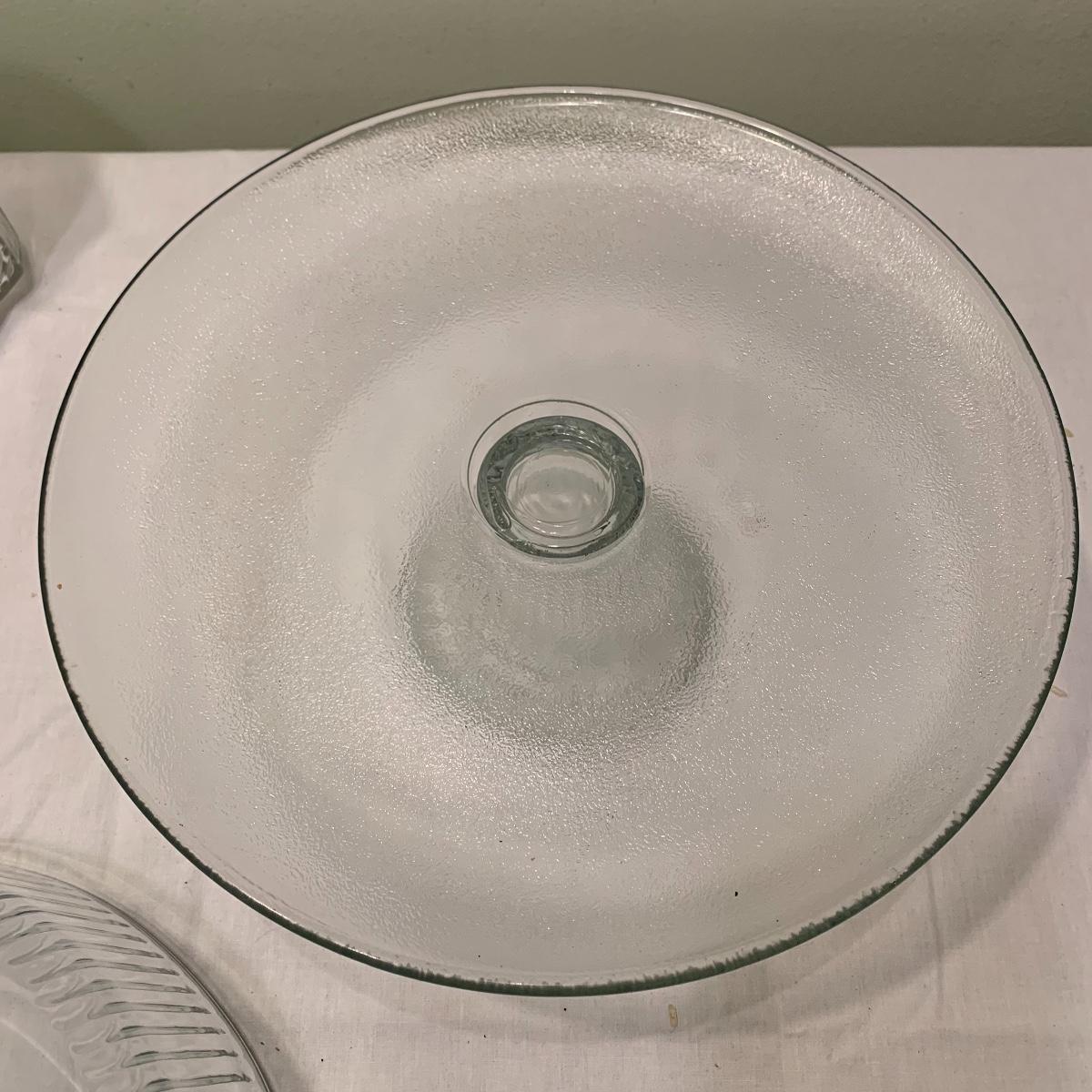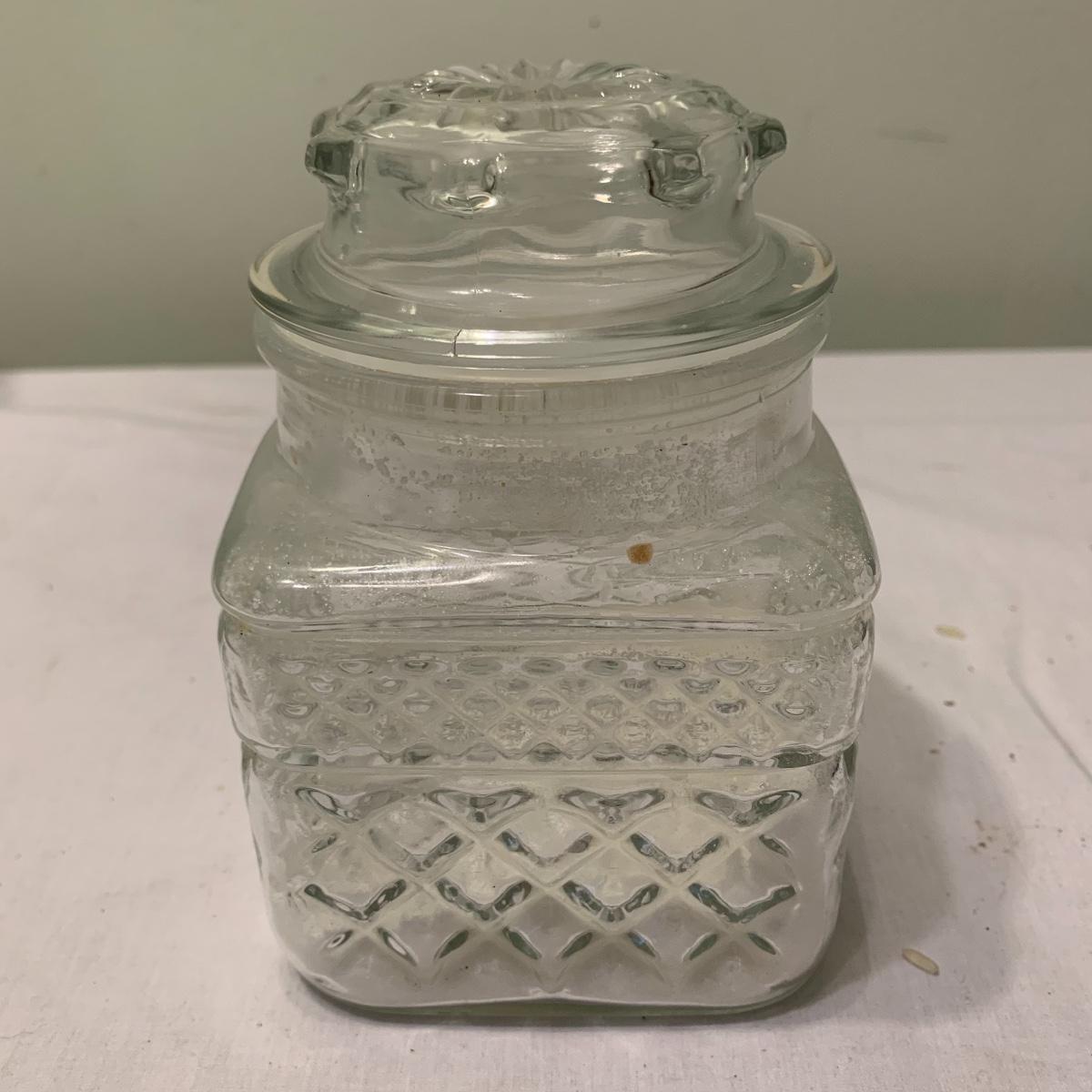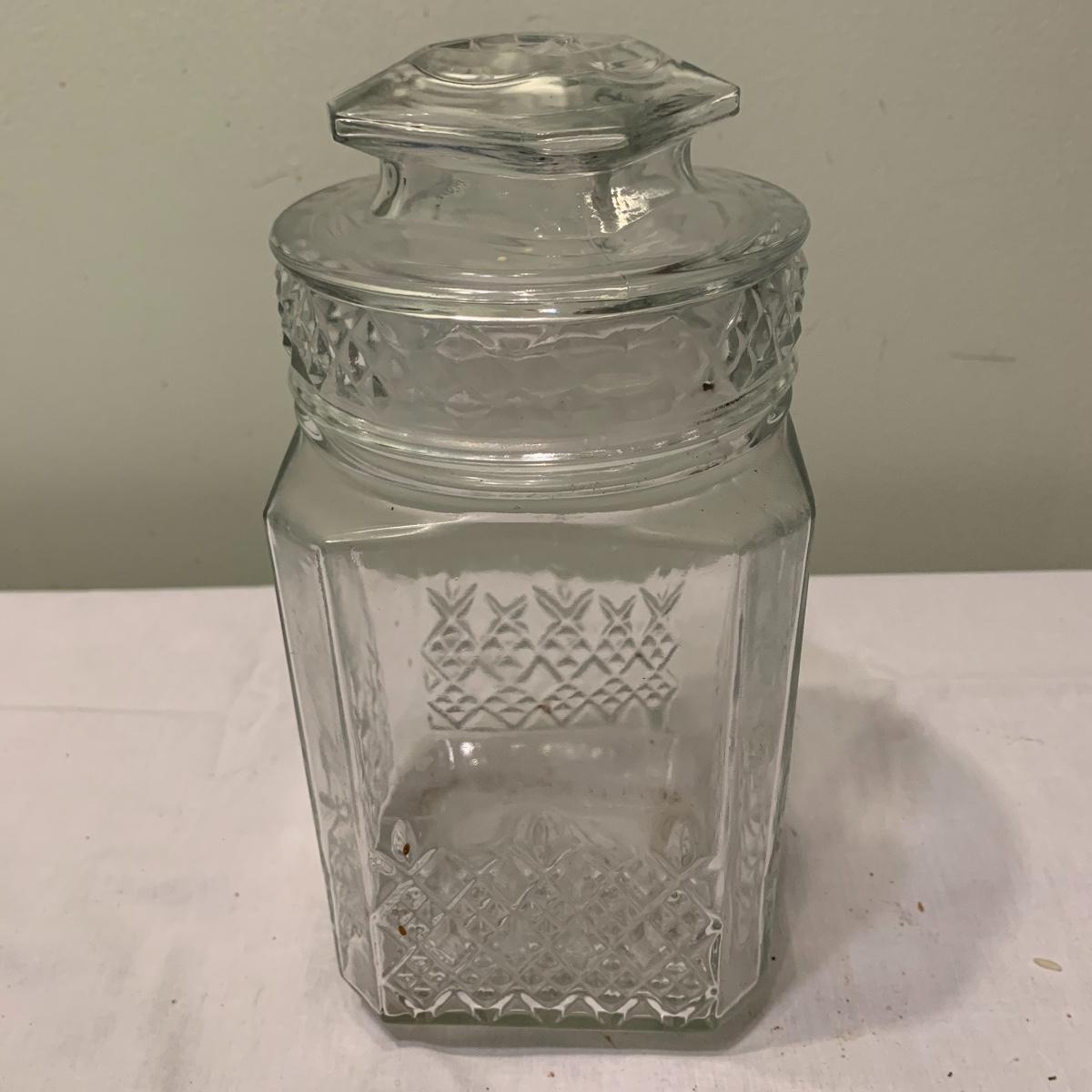 Meet your kitchen storage needs here! This lot includes two sets of matching glass canisters of different sizes. One set has three identical canisters and the other has five matching canisters of various sizes. All are in good condition but could use a good cleaning. Also included is a beautiful 11”d x 4.5” cake stand and a 4” tall clear lid. Shipping available.