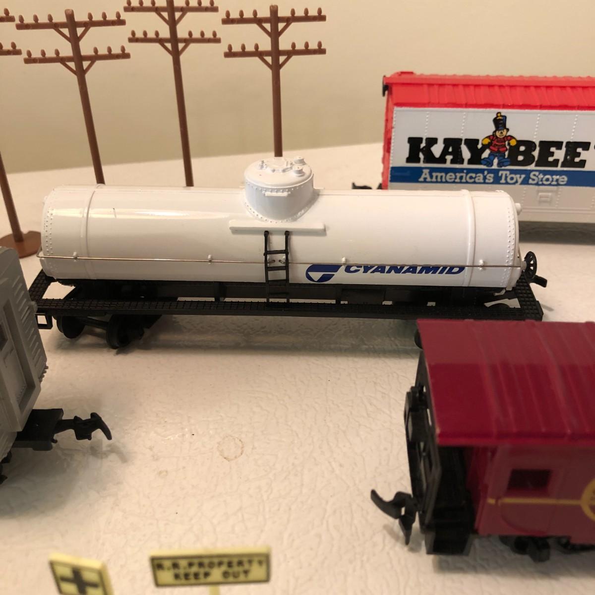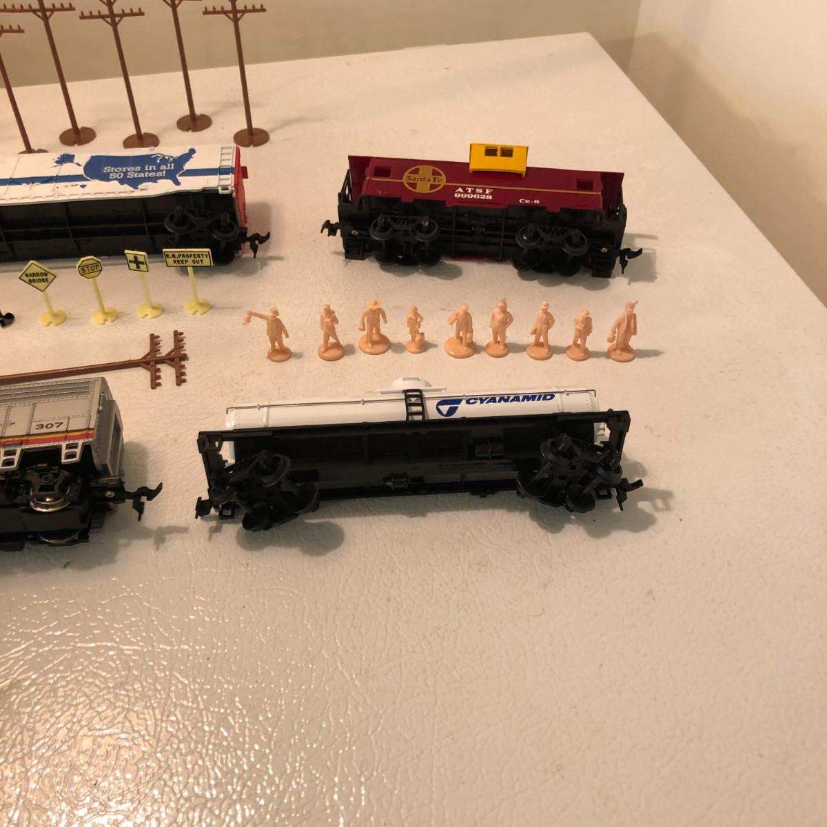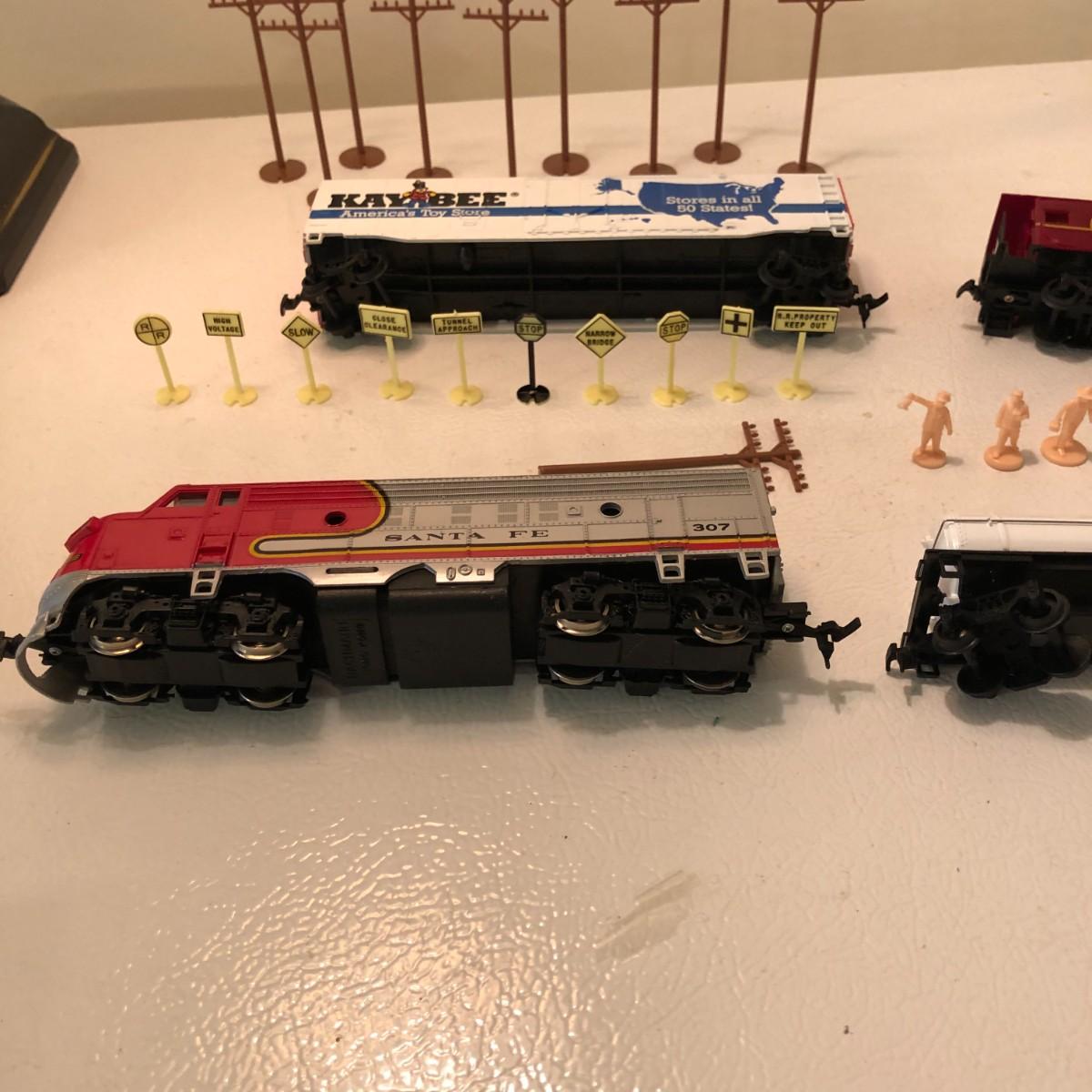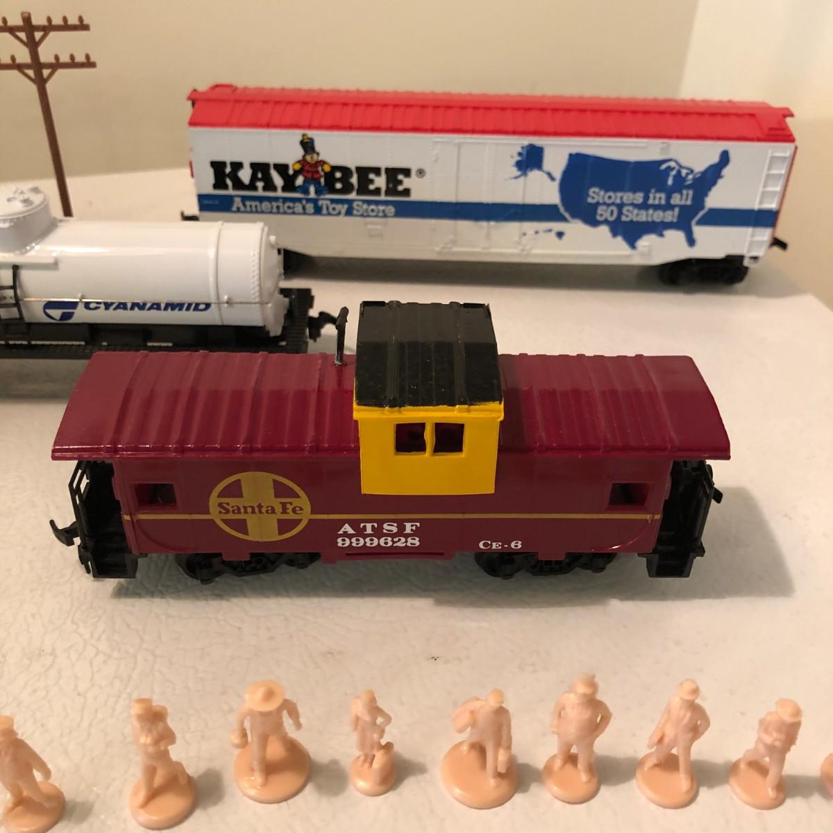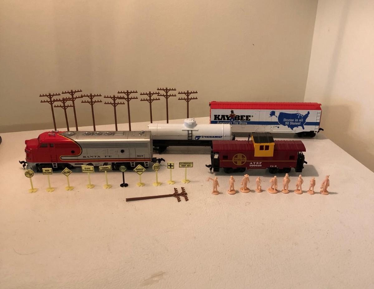 This lot includes a Santa Fe 307 Electric Train engine, Kaybee toys boxcar, Cyanamid tank car, and the Santa Fe Caboose, as well as some accessories.