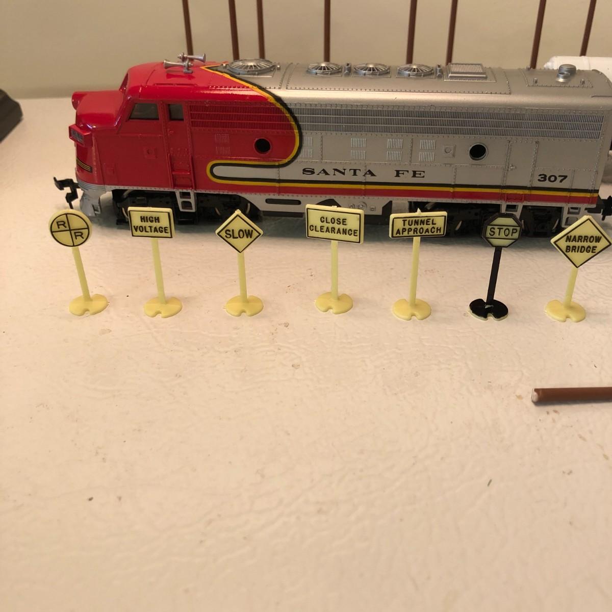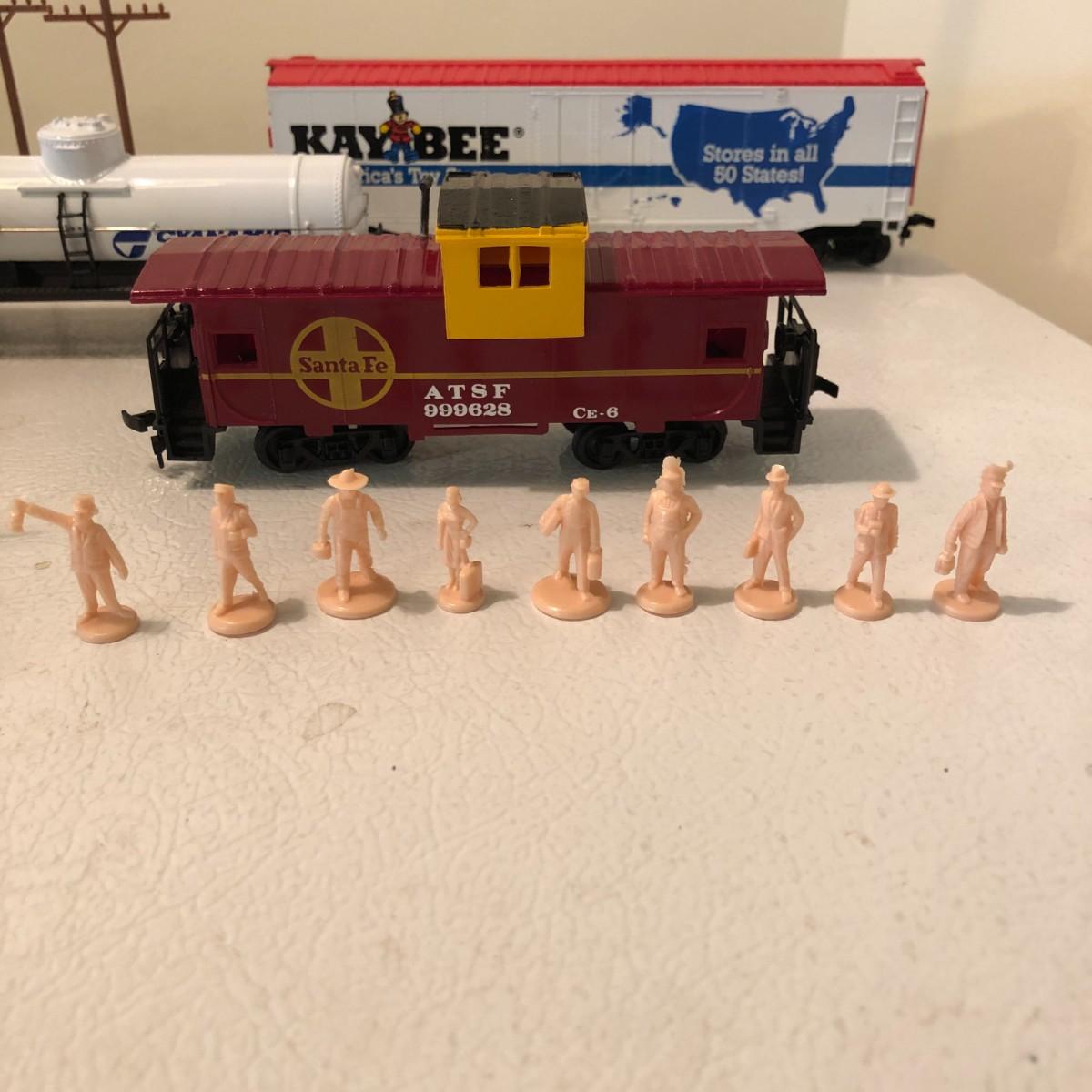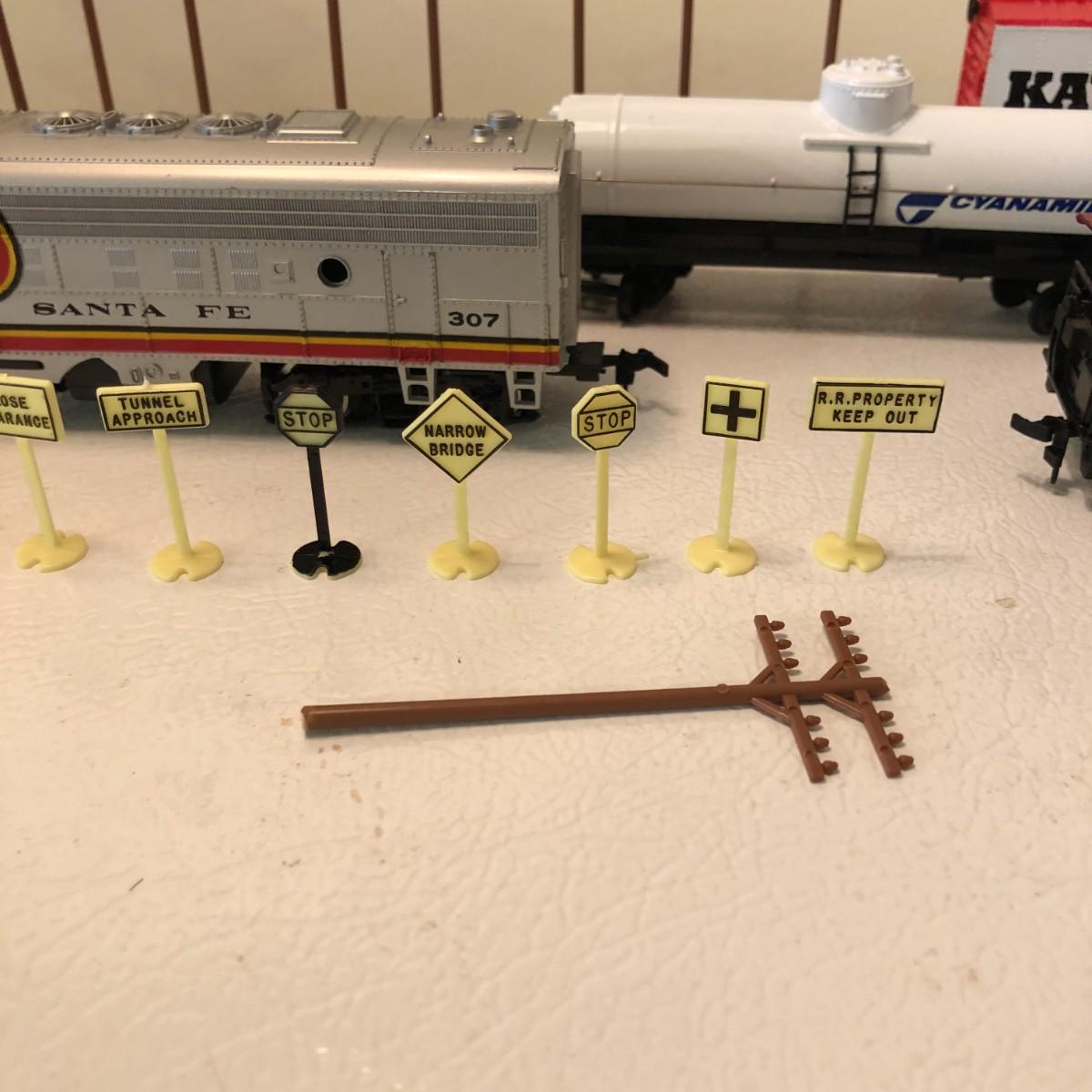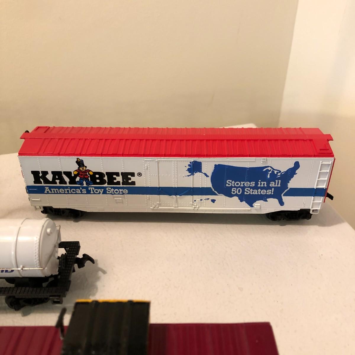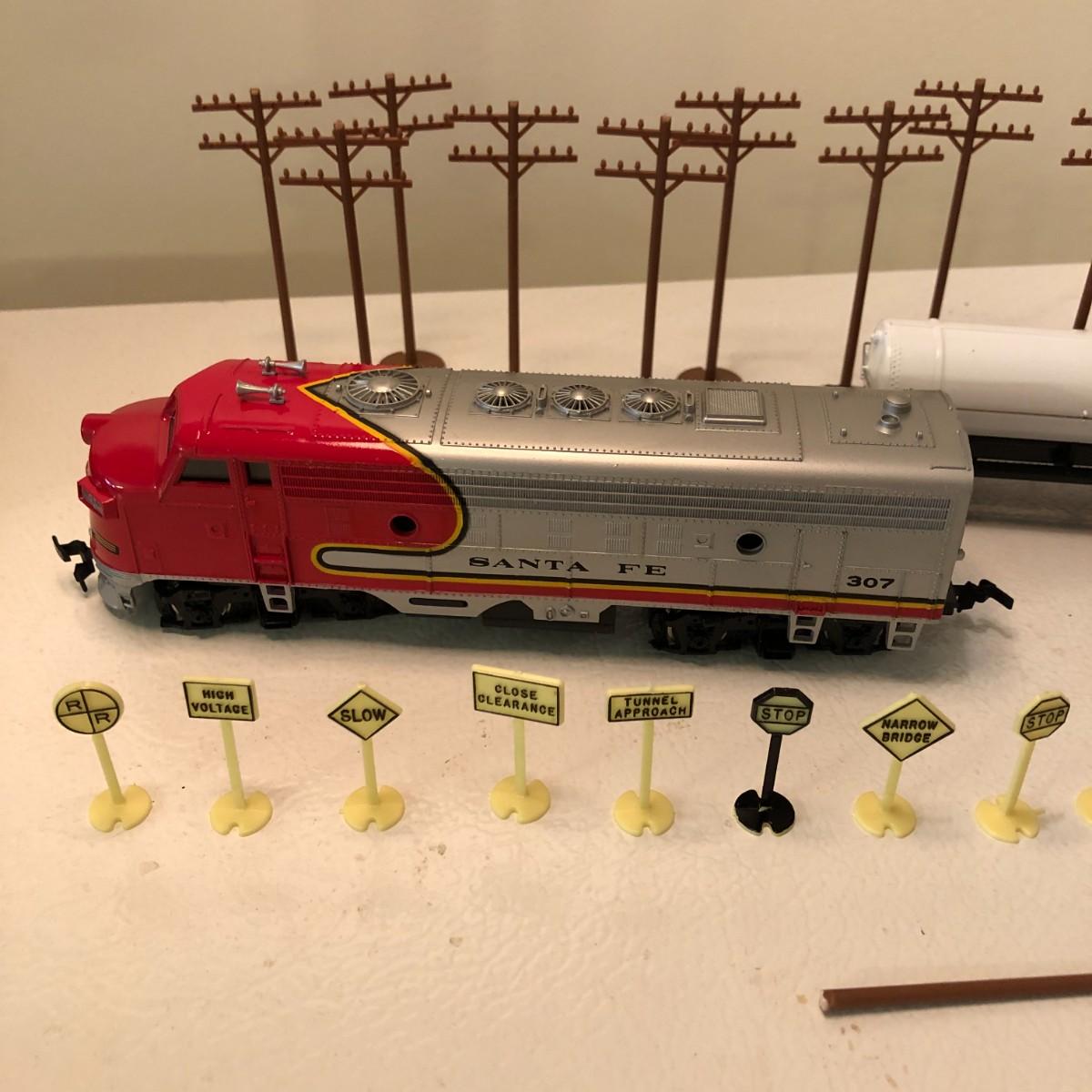 This lot includes a Santa Fe 307 Electric Train engine, Kaybee toys boxcar, Cyanamid tank car, and the Santa Fe Caboose, as well as some accessories.