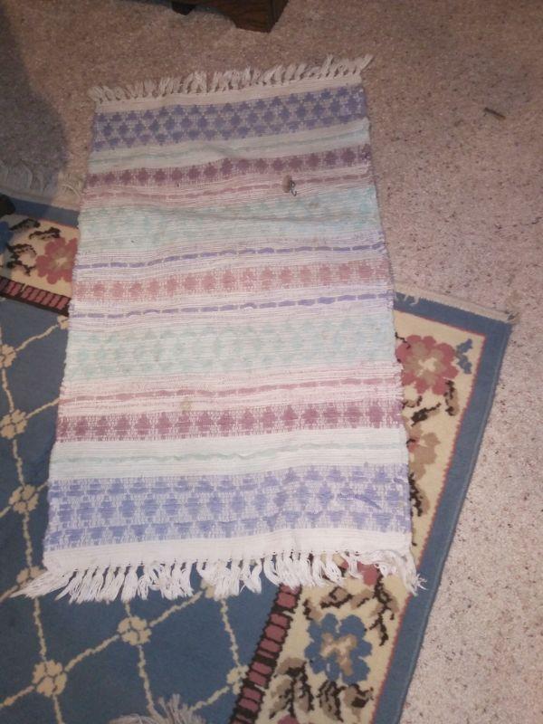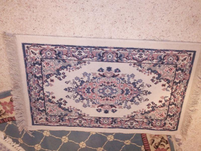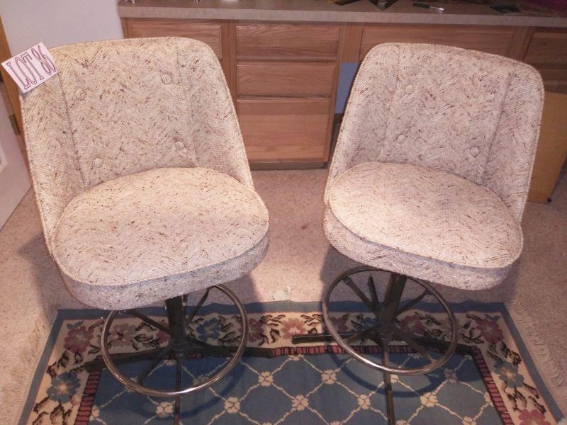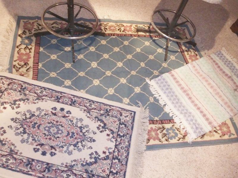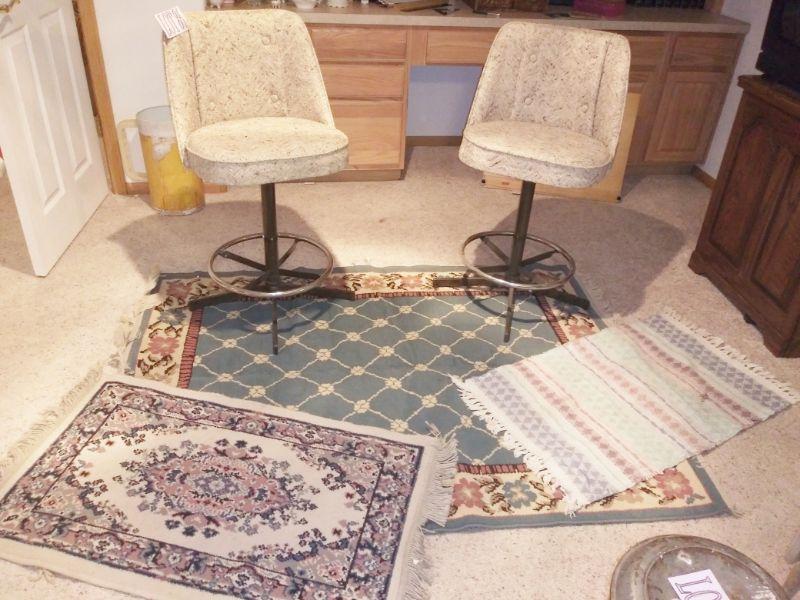 2 UPHOLSTERED BAR STOOLS & 3 RUGS