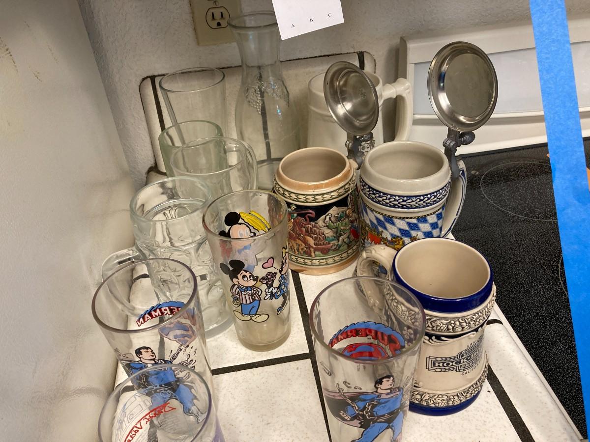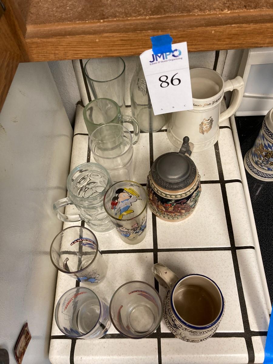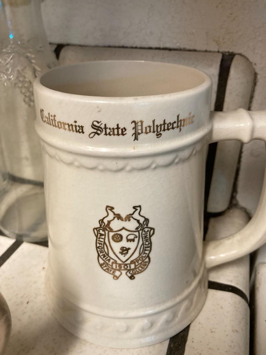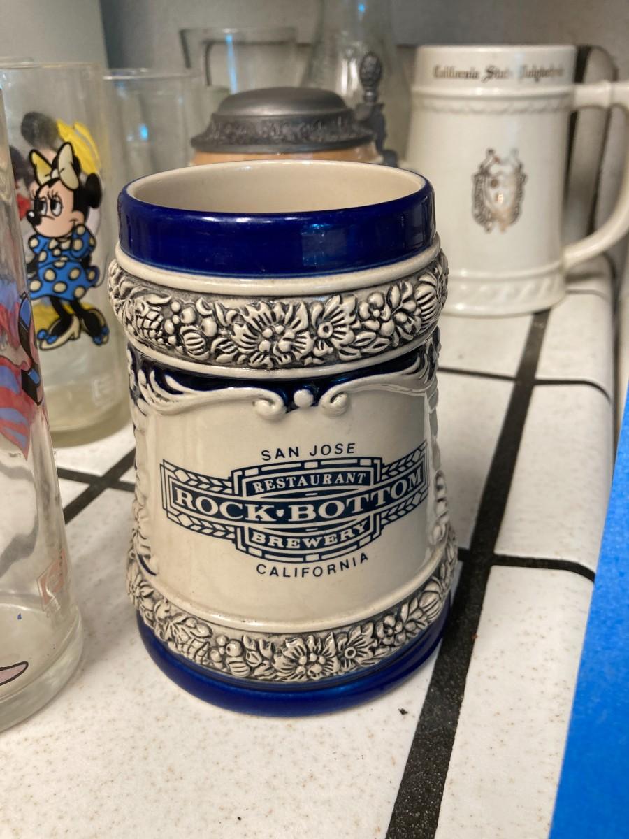 Novelty glasses. Rock Bottom Brewery (Campbell CA) branded glass steins and stoneware stein. Handabreit stoneware steins from Western Germany with hinged lids. Assorted other glassware as shown. Cal Poly branded stein.