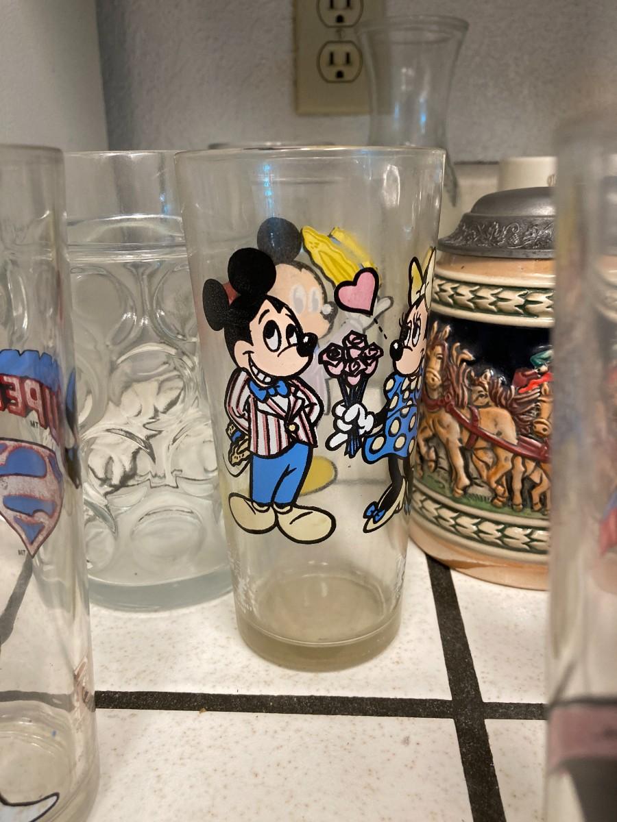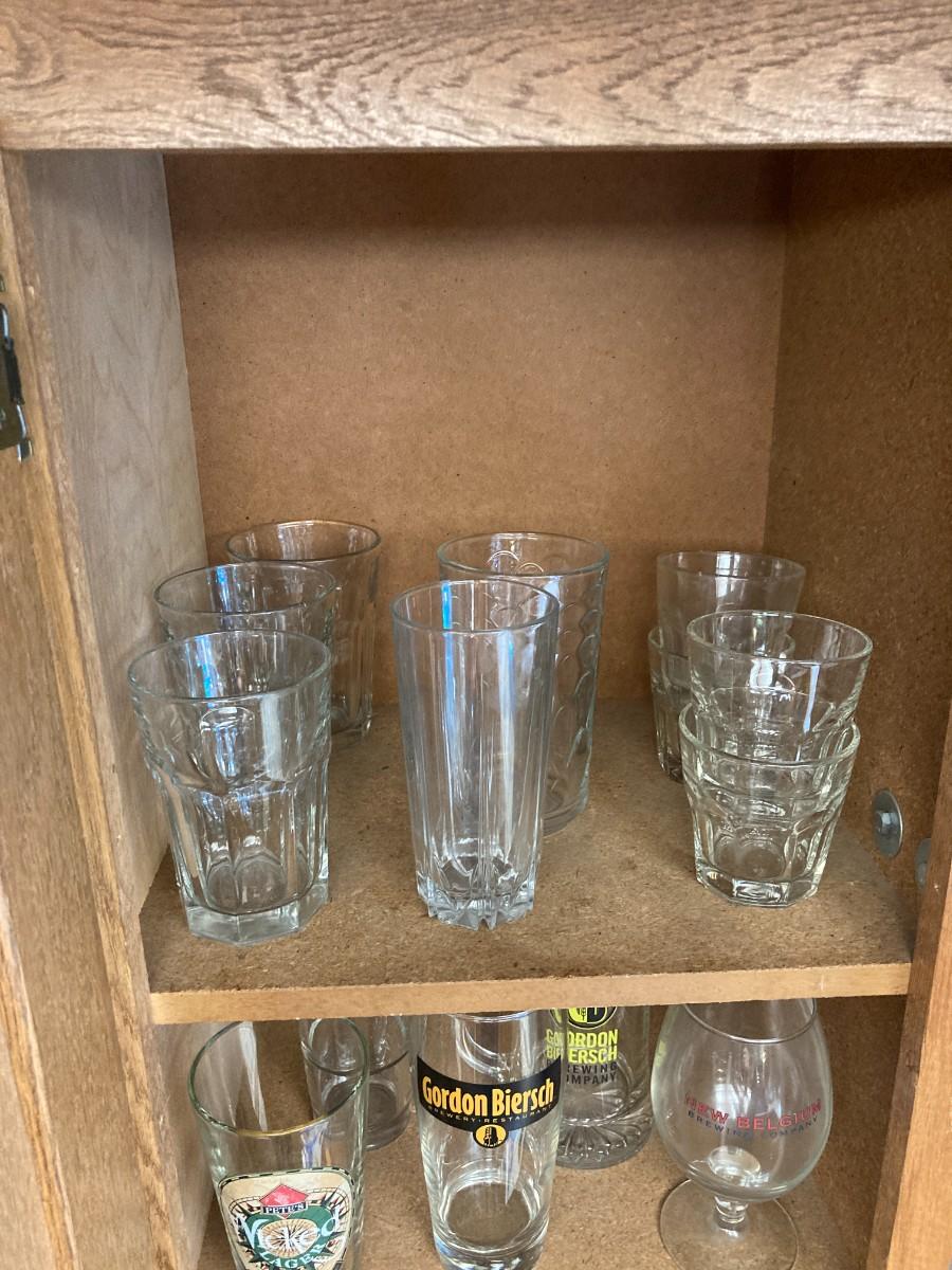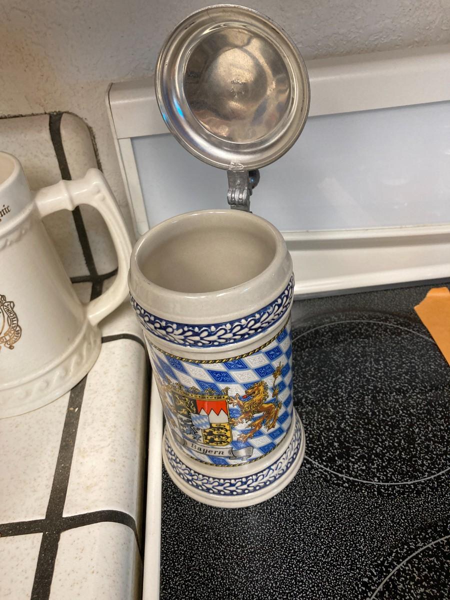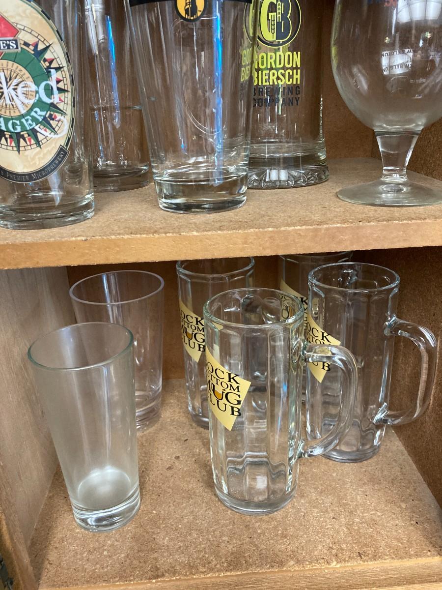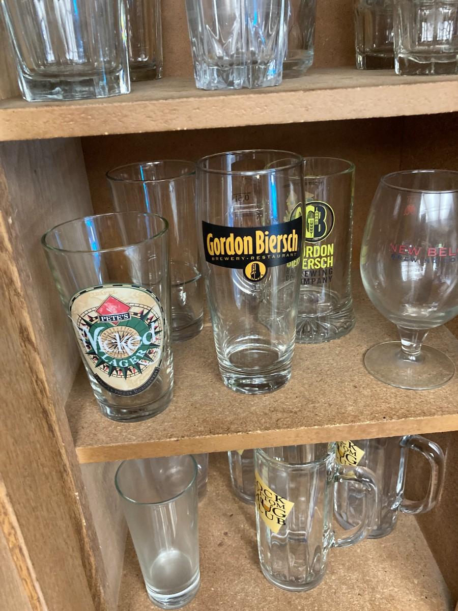 Novelty glasses. Rock Bottom Brewery (Campbell CA) branded glass steins and stoneware stein. Handabreit stoneware steins from Western Germany with hinged lids. Assorted other glassware as shown. Cal Poly branded stein.
