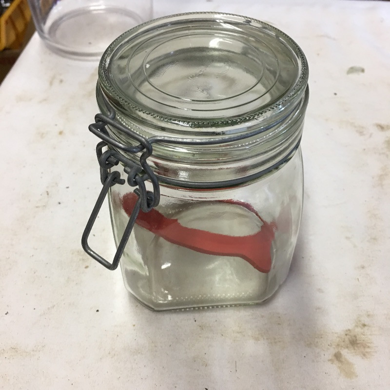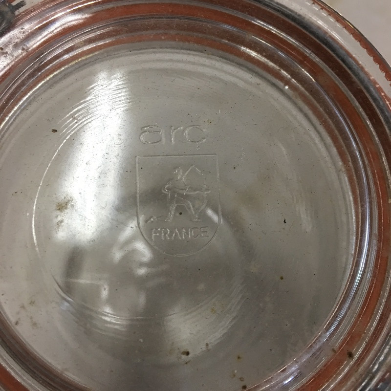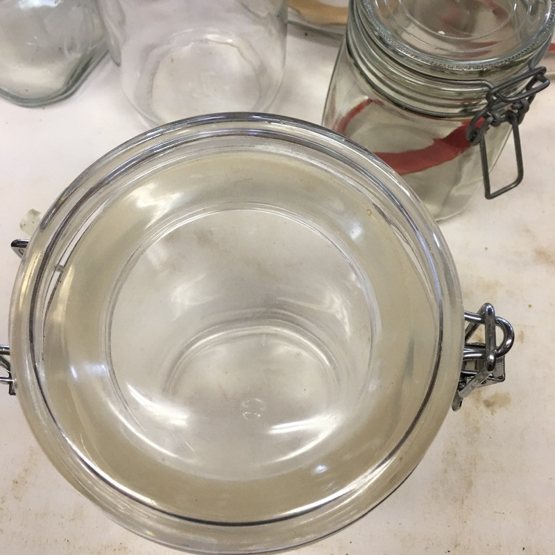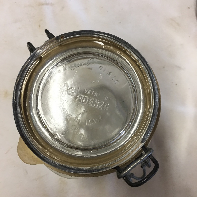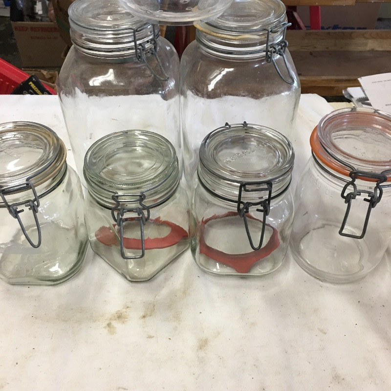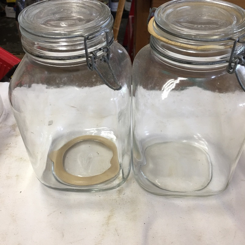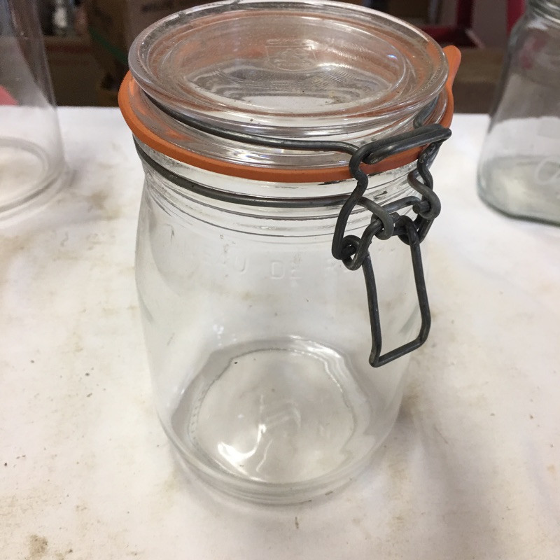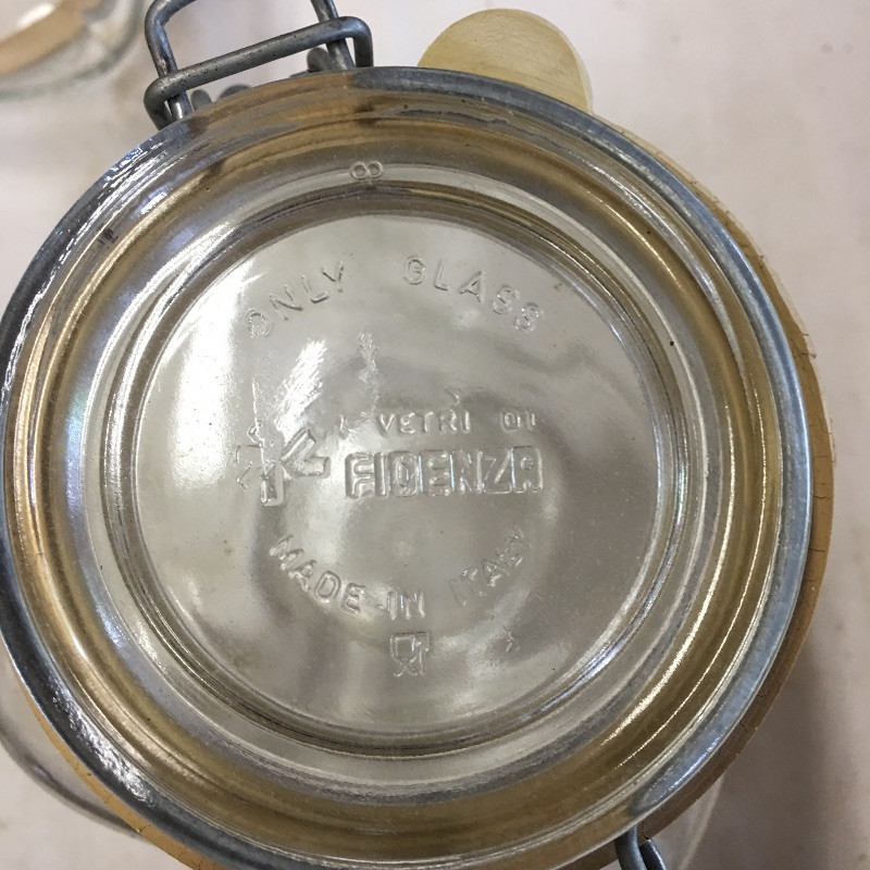 Seven glass containers with swing top lids and one plastic container. Containers include three Fidenza, two French and one English container. Largest container measures 5.5” x 5.5” x 10”.