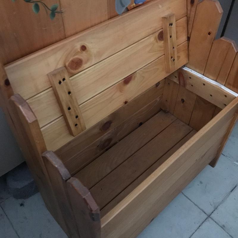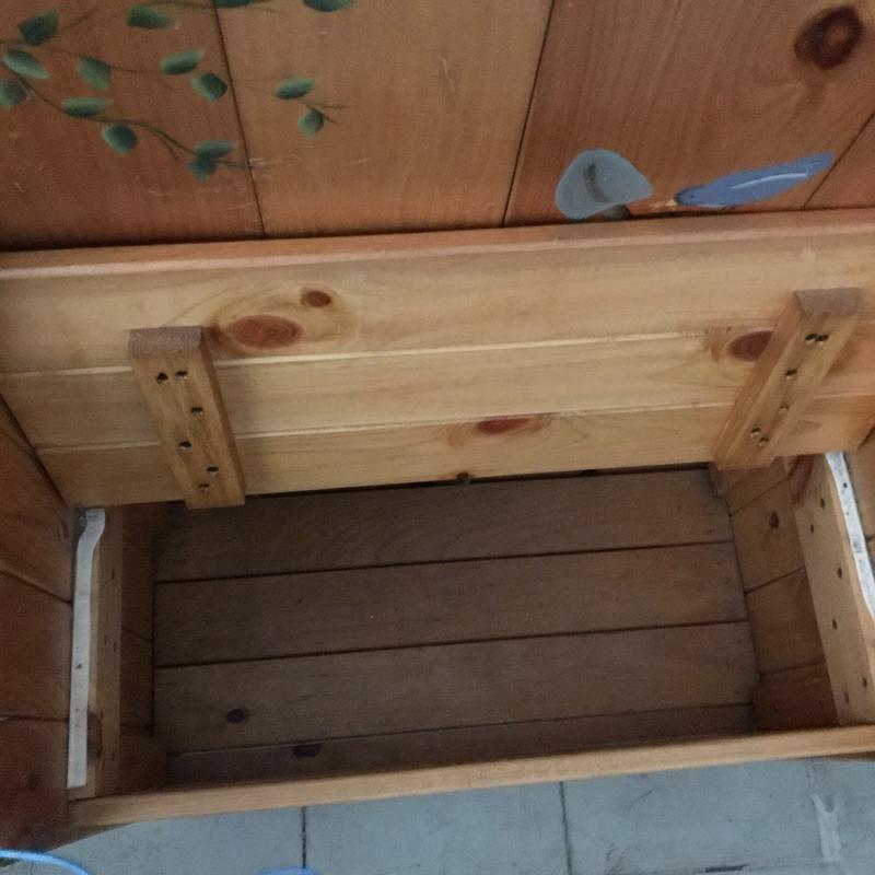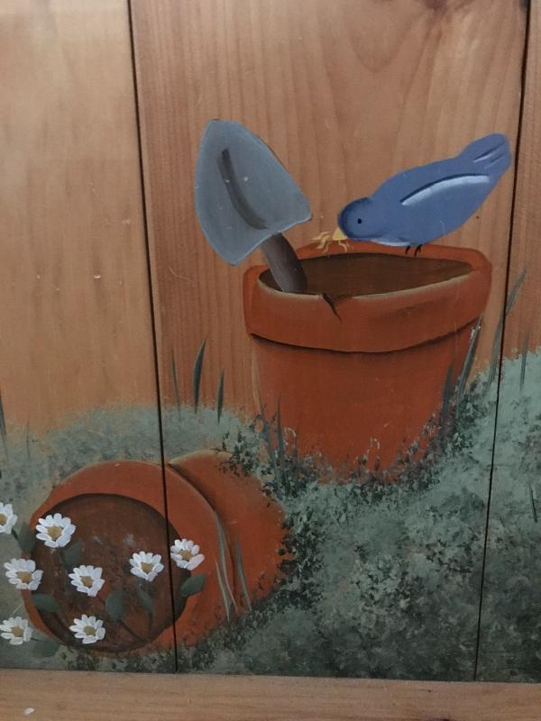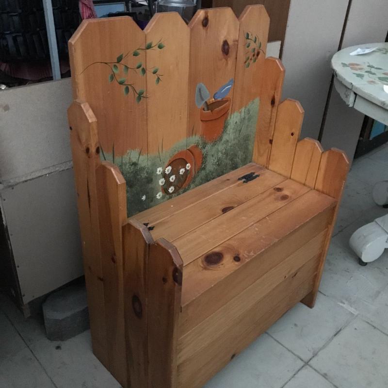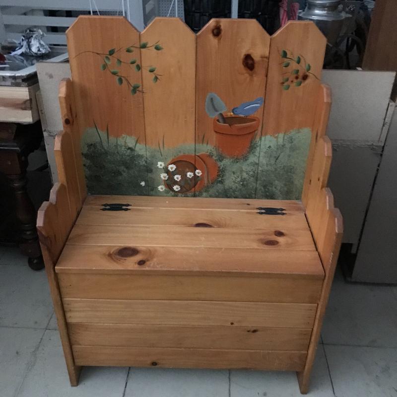 Wooden storage bench. Painted garden scene on seat back. Seat bottom opens for storage. Great multi-functional piece for your home. Measures 27” x 14” x 38”h. No shipping. Local pick up only in Maggie Valley.