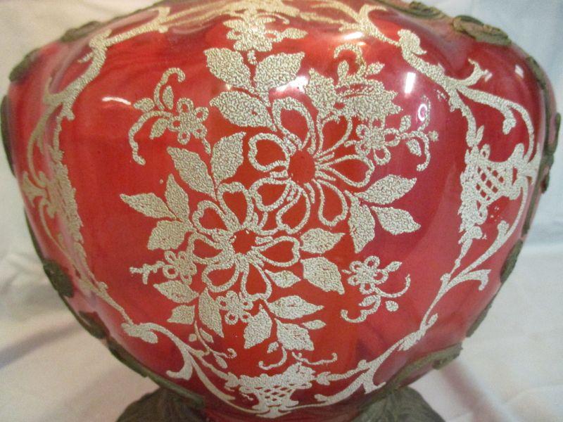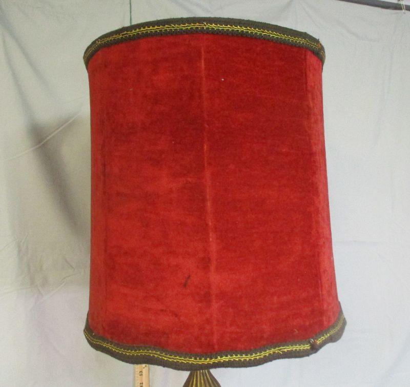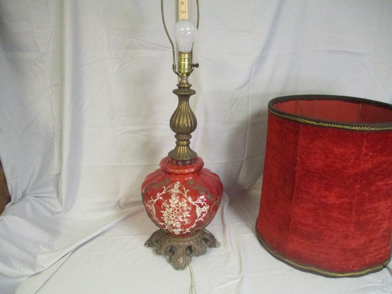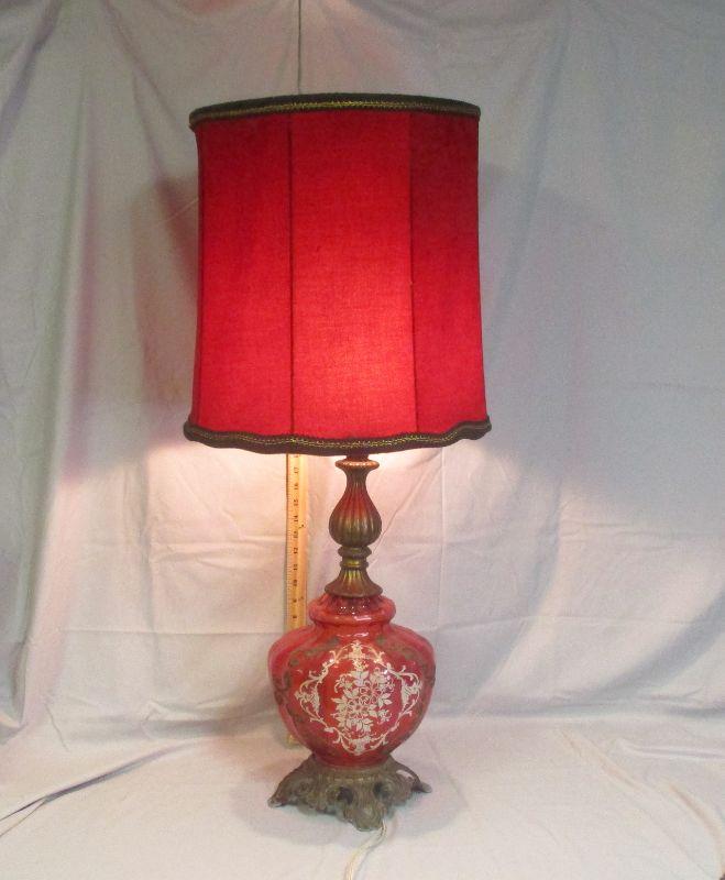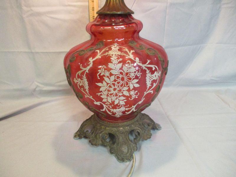 This is a GORGEOUS lamp - the pictures don't do it justice! It has a cranberry glass base with a gold and white painted design sitting on a brass foot. The neck of the lamp is also metal. It is 31.5" from the base to the top of the finial, with the lampshade on it it 37.5" tall. The lamp uses a three-way bulb and matches Lot 87.