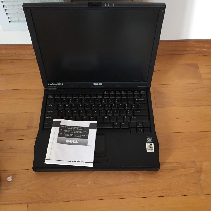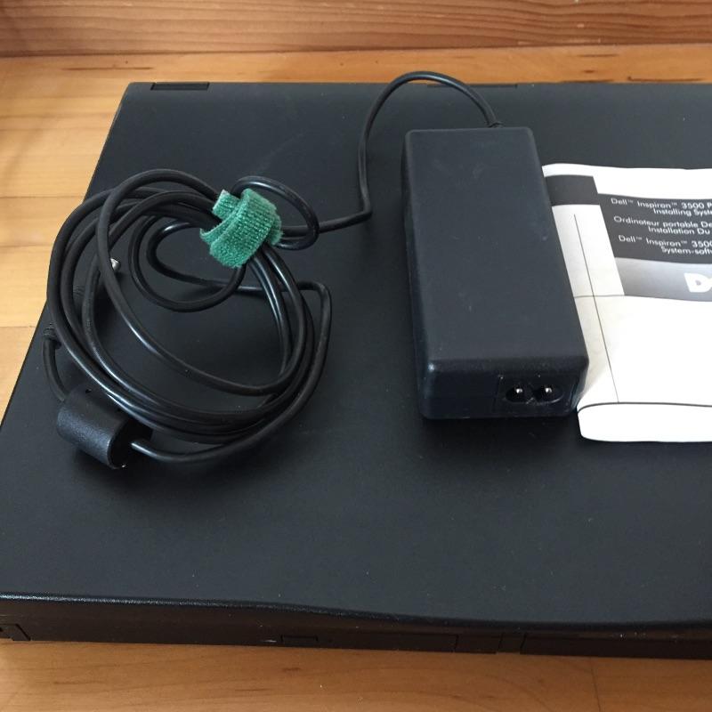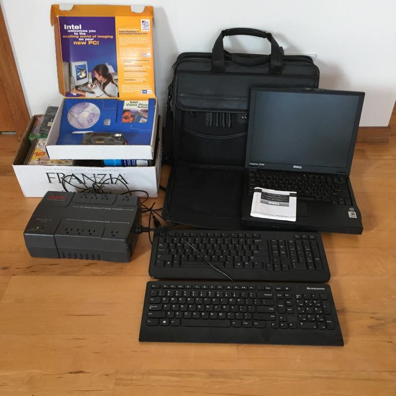 This Dell Inspiron 3500 Lap-top comes with its own faux leather laptop bag and manual but it is missing one of the two cables needed for power. Therefore we are unable to confirm that it works. Also in this lot is an APC battery backup surge protector that powers on and seems to work, an Advantix Kodak Camera new in packaging, two keyboards and blank CD’s.
