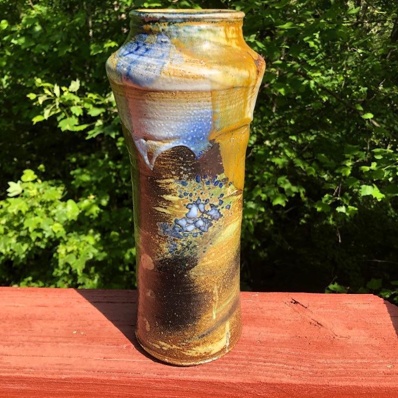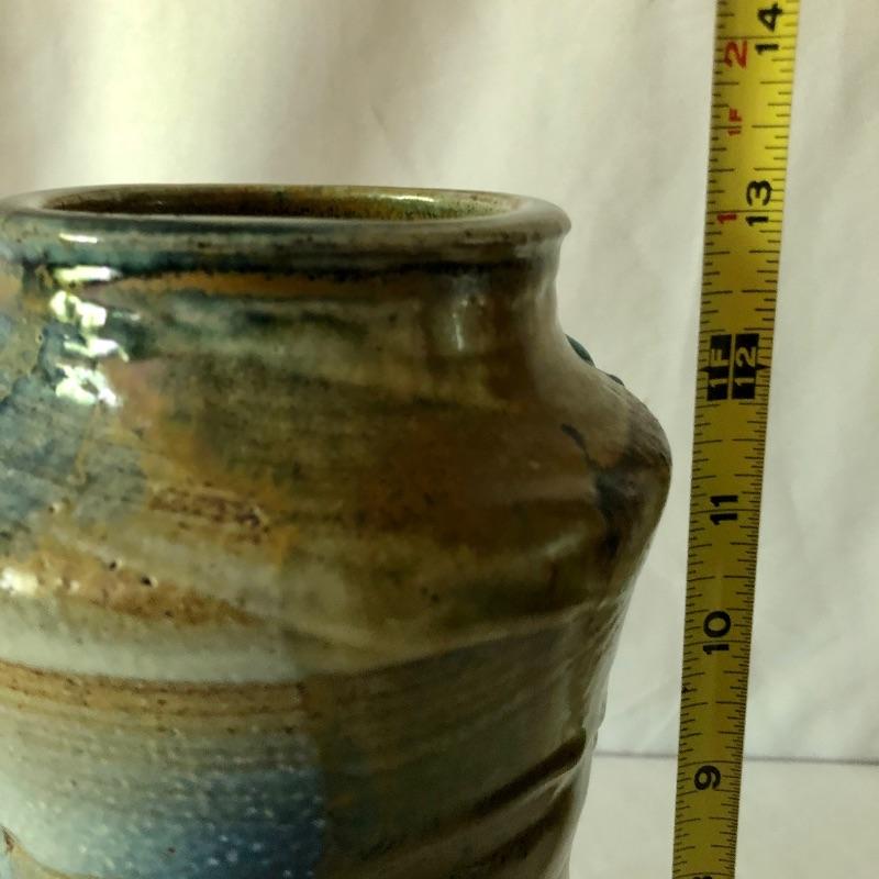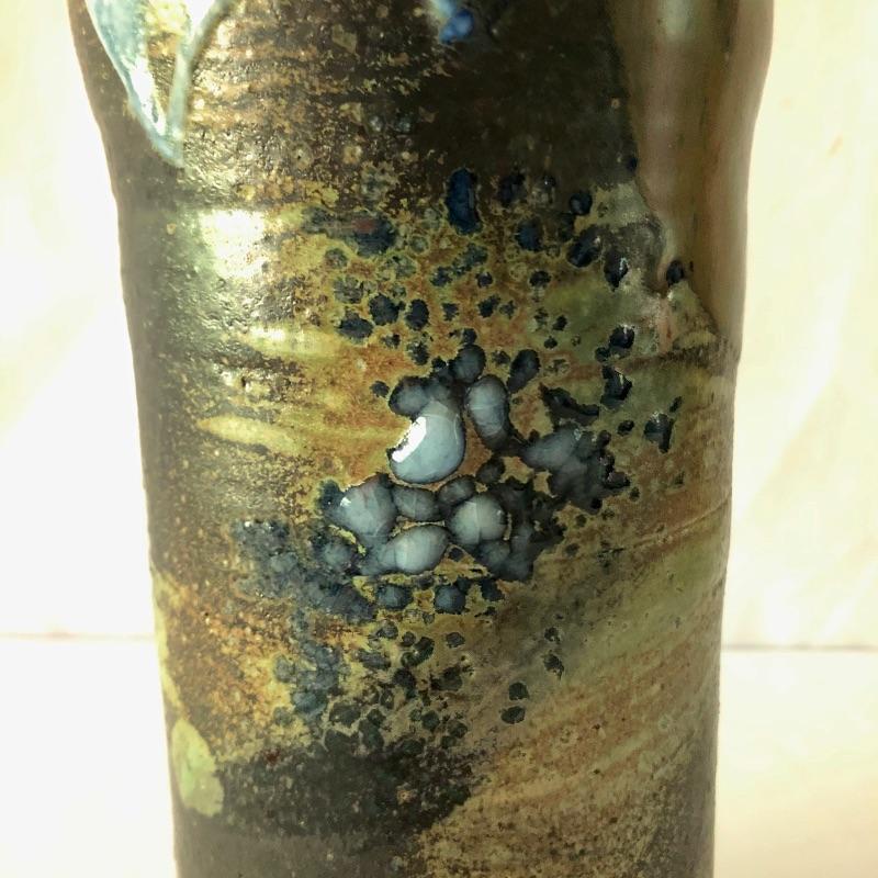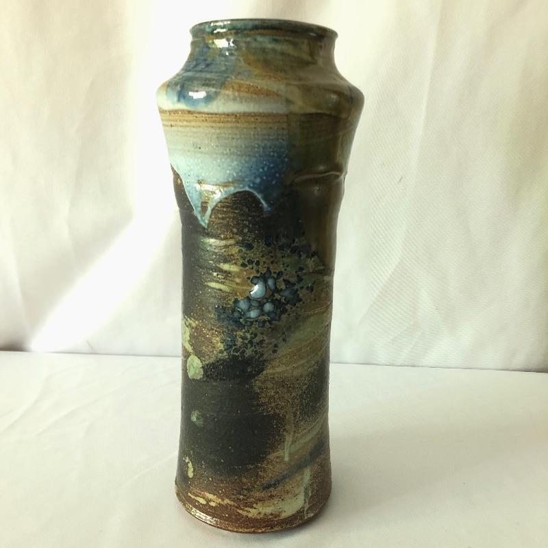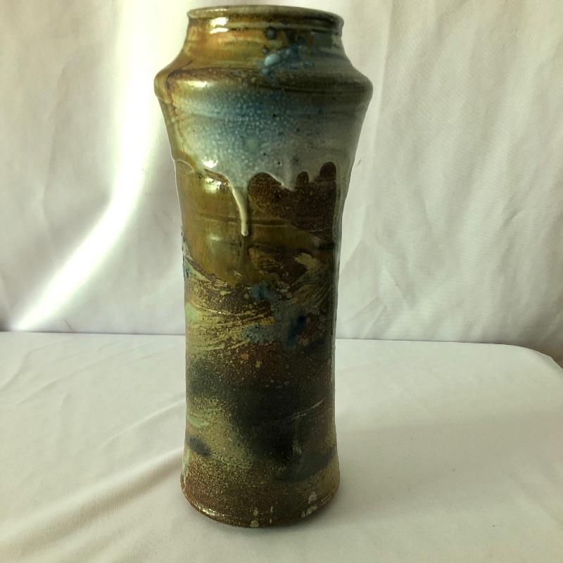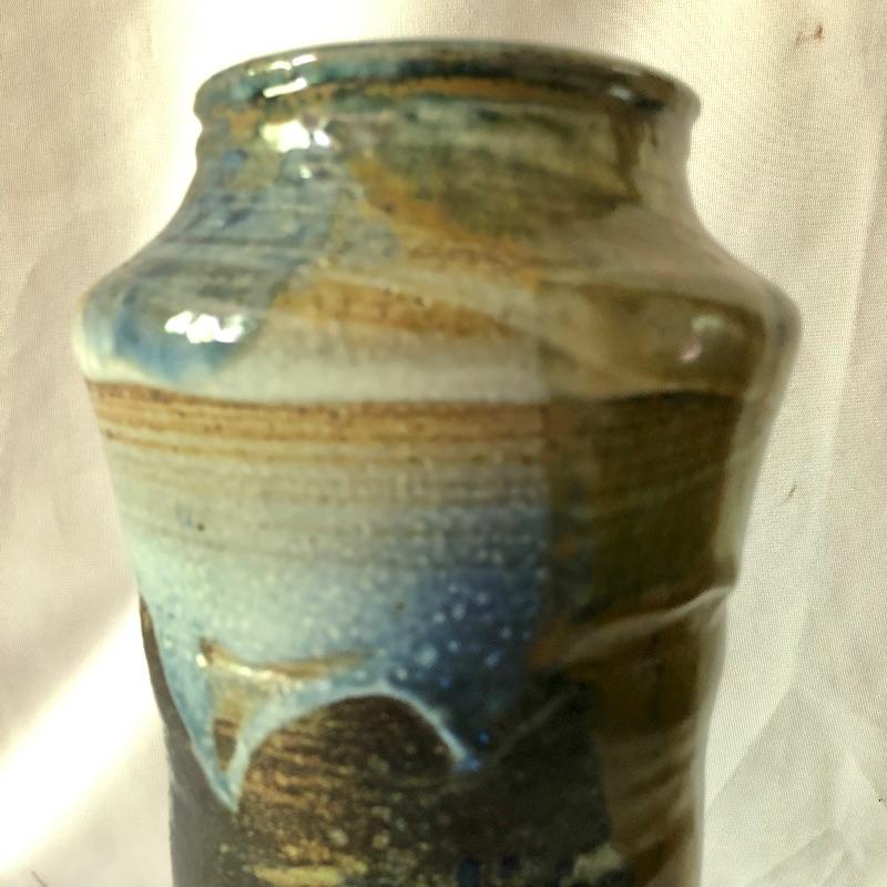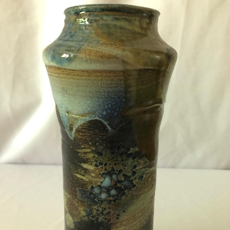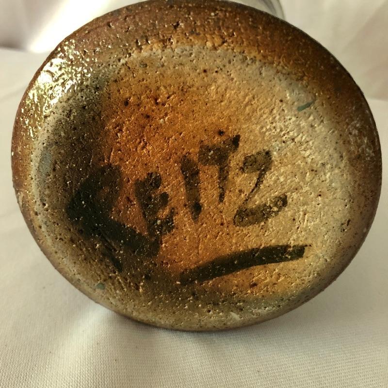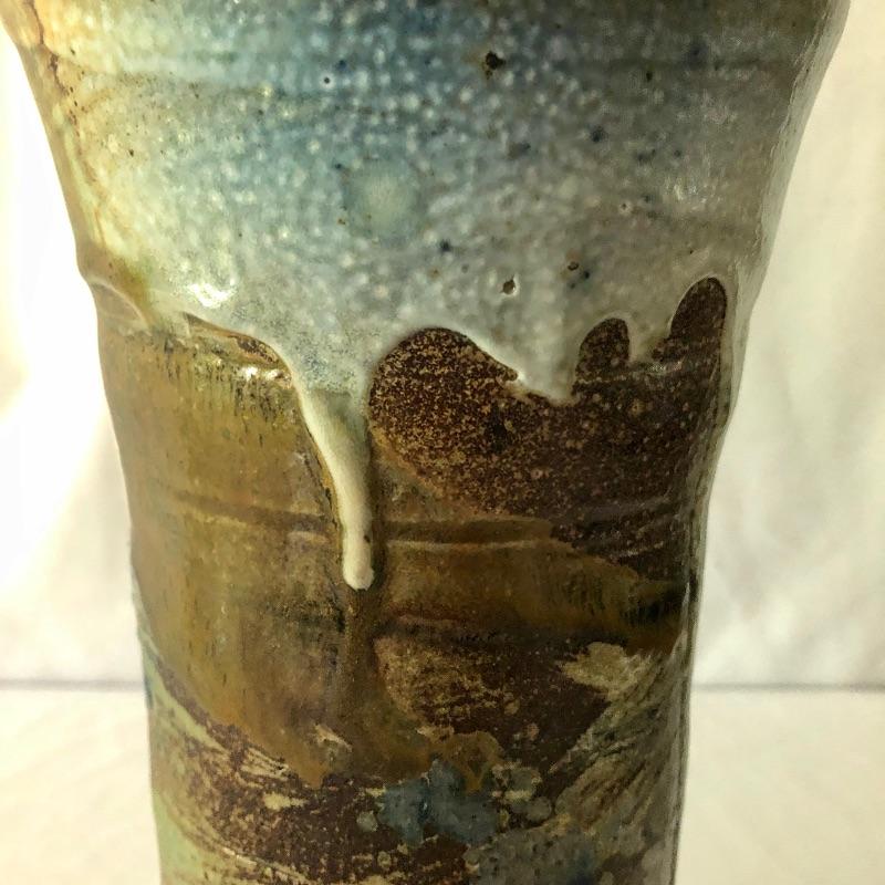 This stunning vase by potter Don Reitz is a beauty! Reitz has used a combination of glazing techniques with this piece that includes an area of melted glass as an accent. Reitz was a very well known potter who mostly used a salt glazing technique.