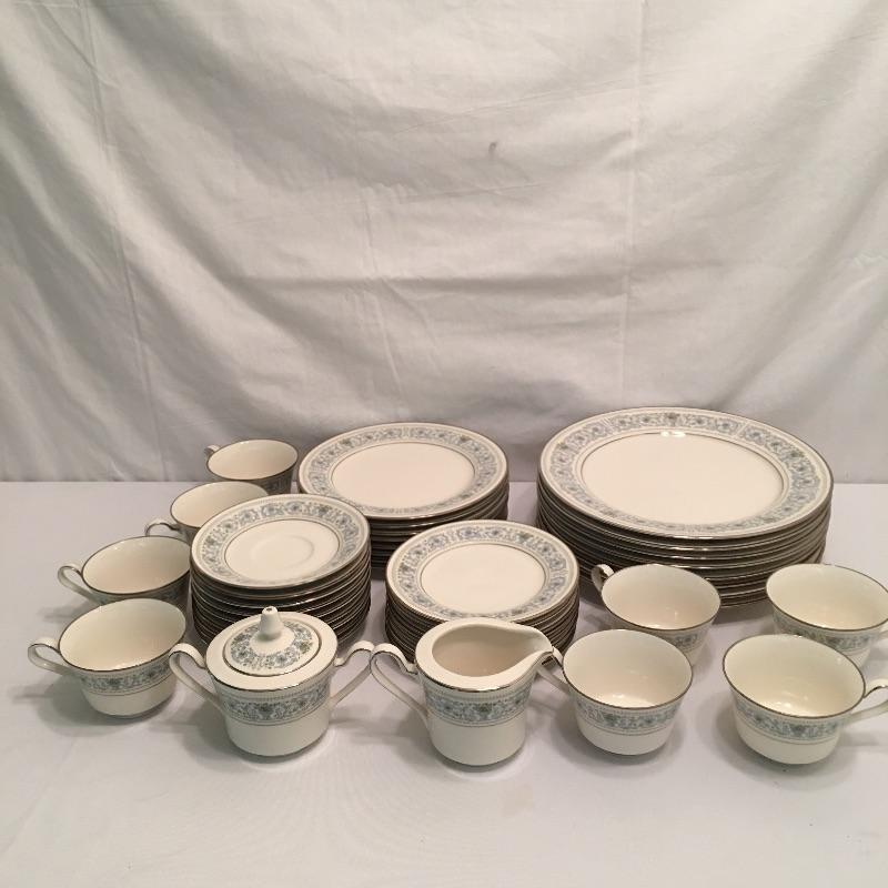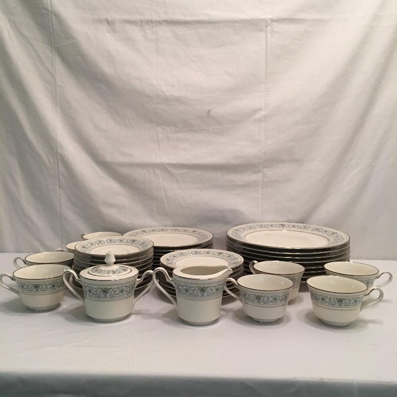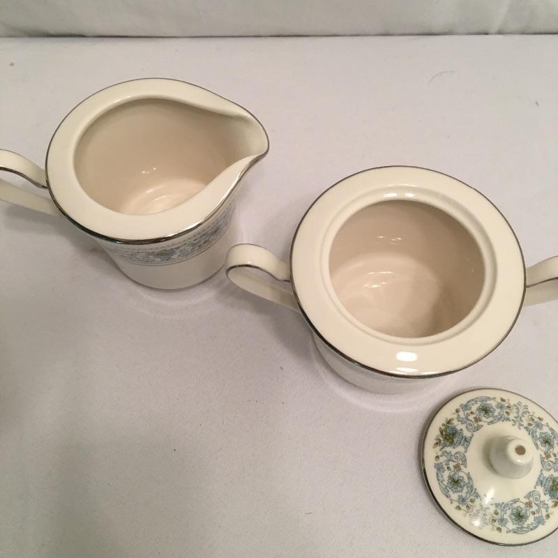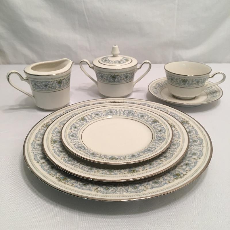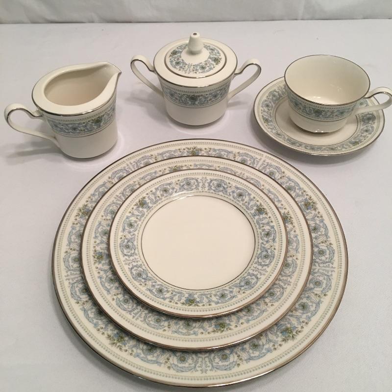 This is the prettiest of designs in this dinnerware set for eight. Eight each of dinner plates, side plates, cups and saucers with an extra saucer as well. In addition there is a creamer and sugar bowl. The set is Montelone and its a pretty blue floral design.