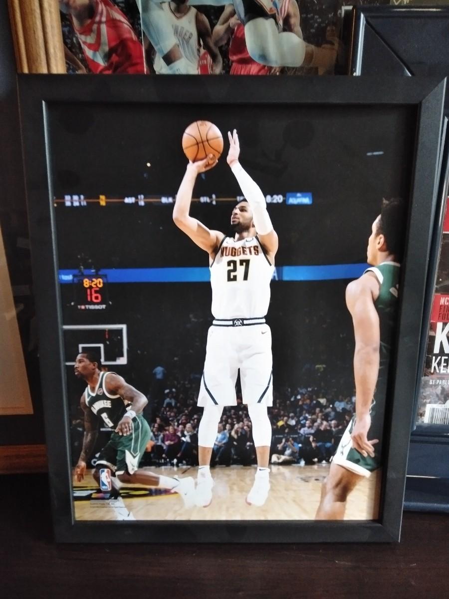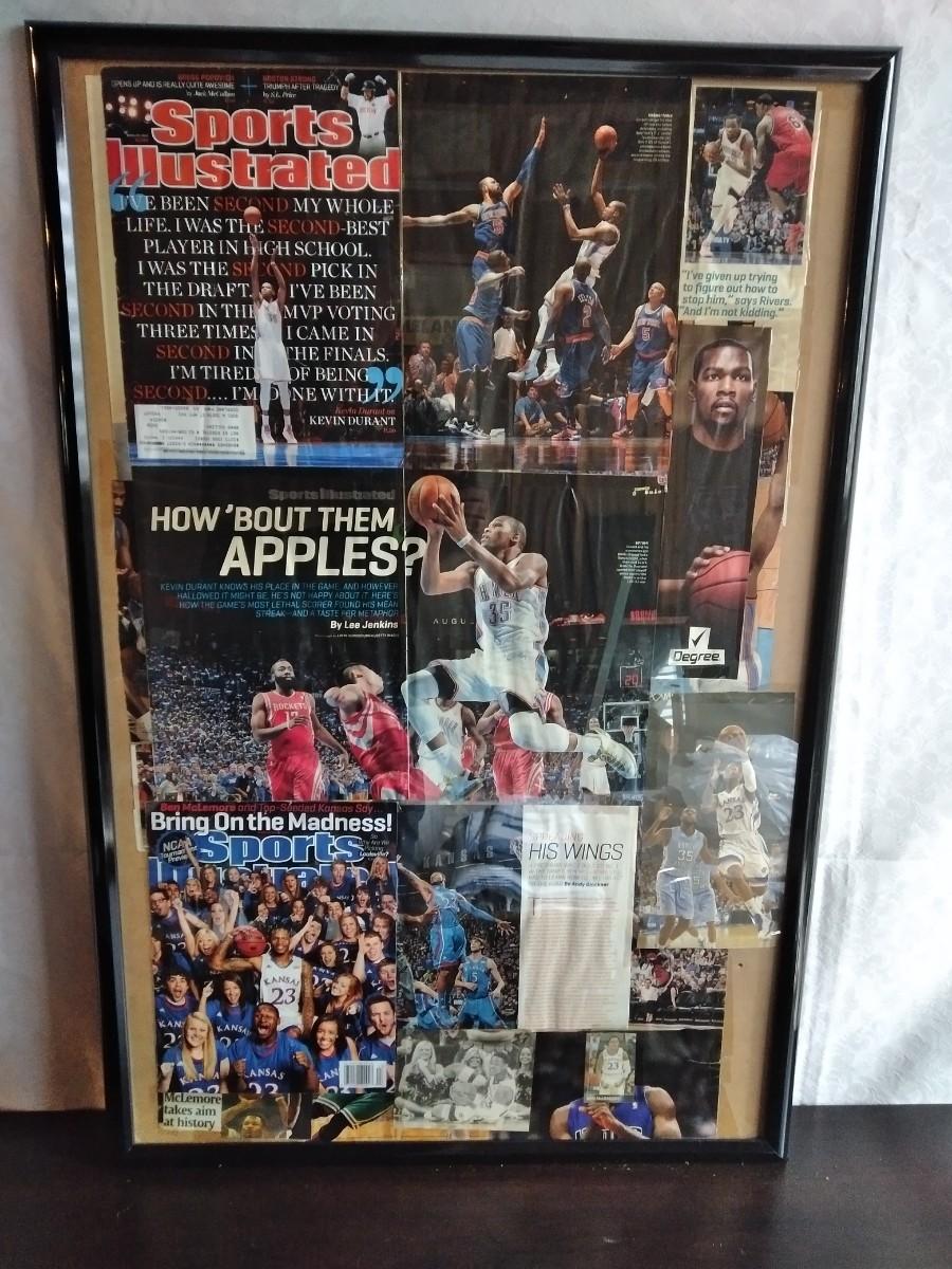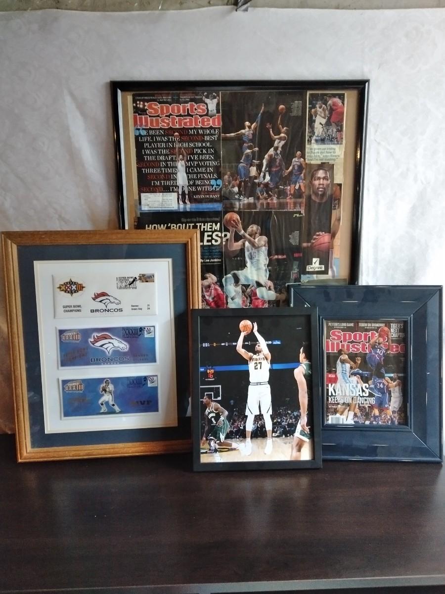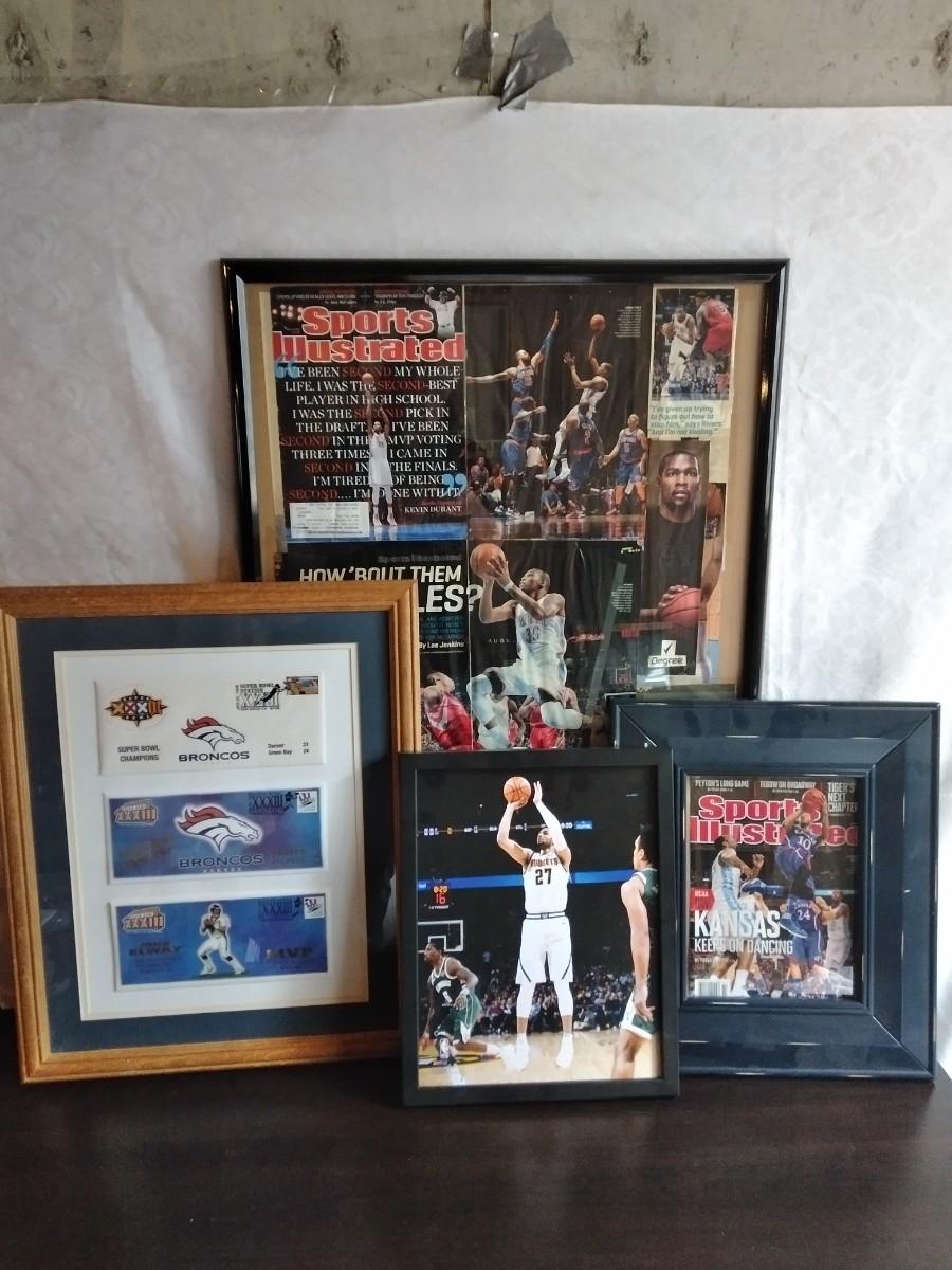 FOUR FRAMED SPORTS PICTURES, BASKETBALL, AND FOOTBALL.