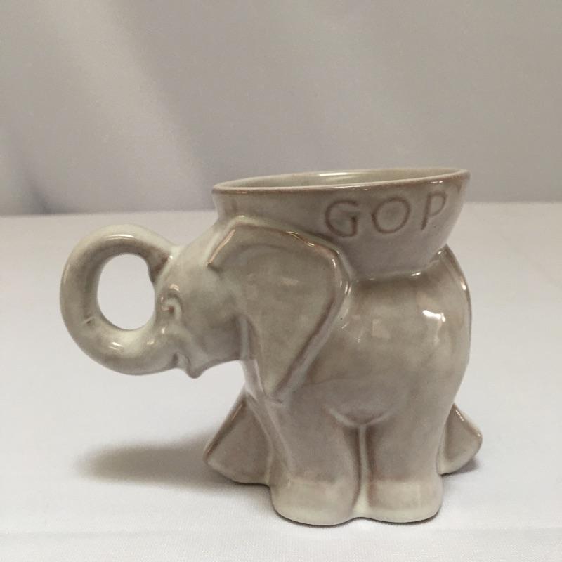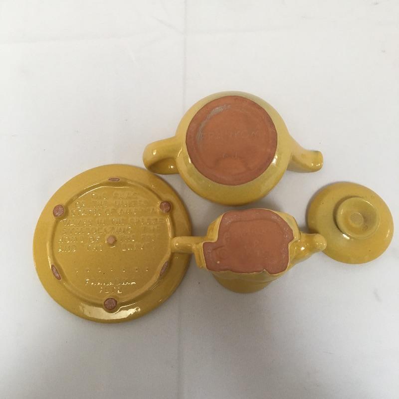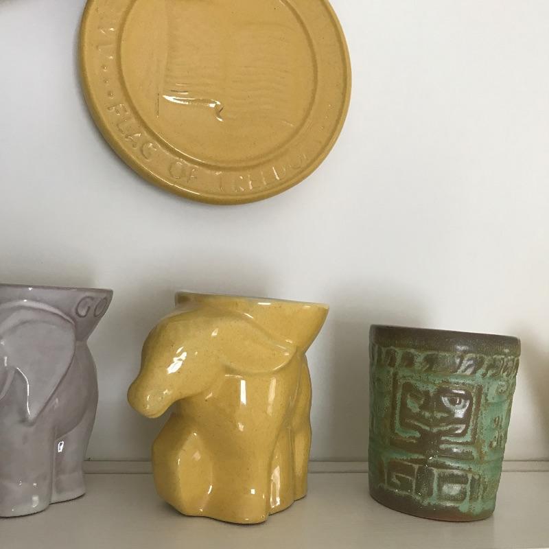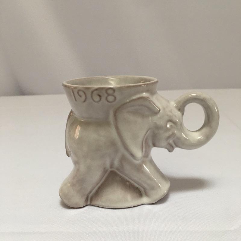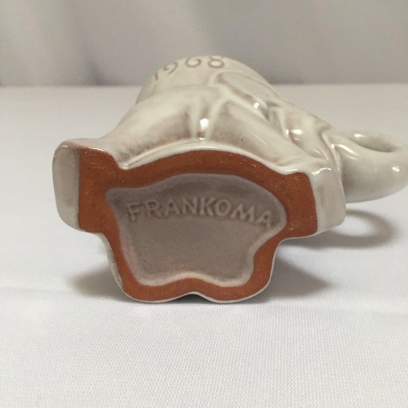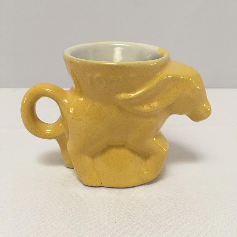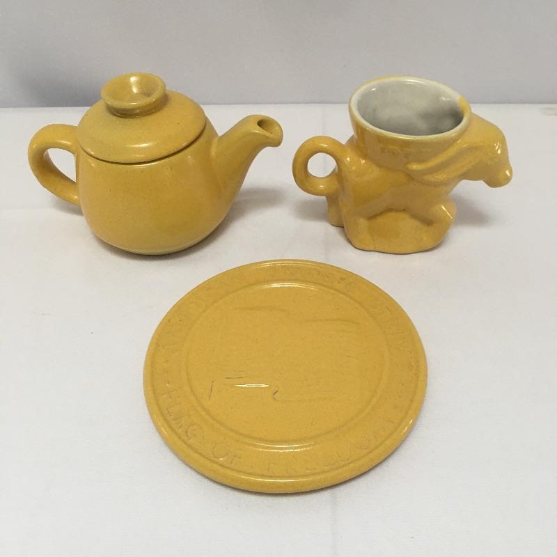 Frankoma pottery includes yellow trivet, teapot with lid, and Donkey. Lot also includes a Frankoma grey Elephant 1968 GOP mug and a green mug.