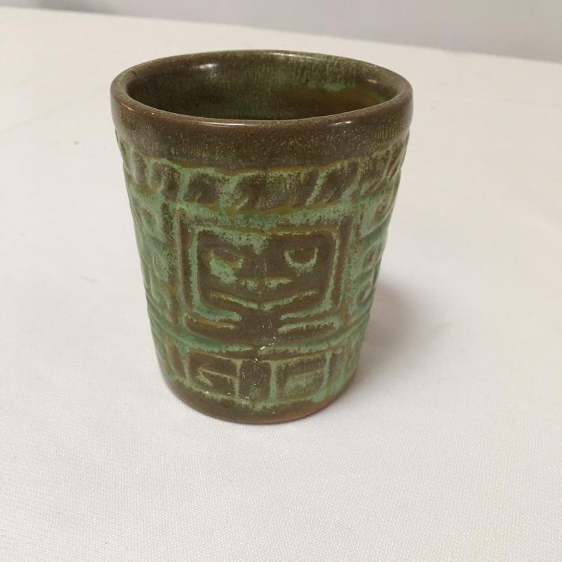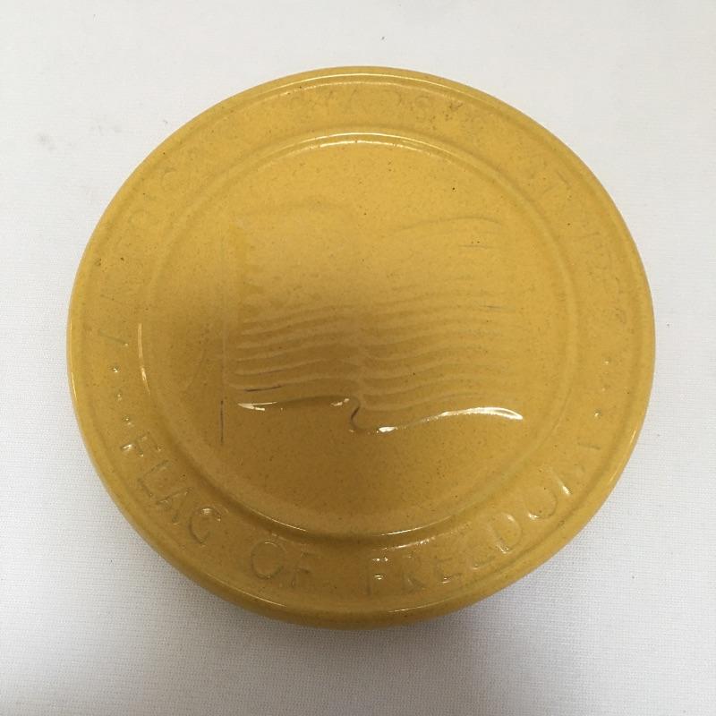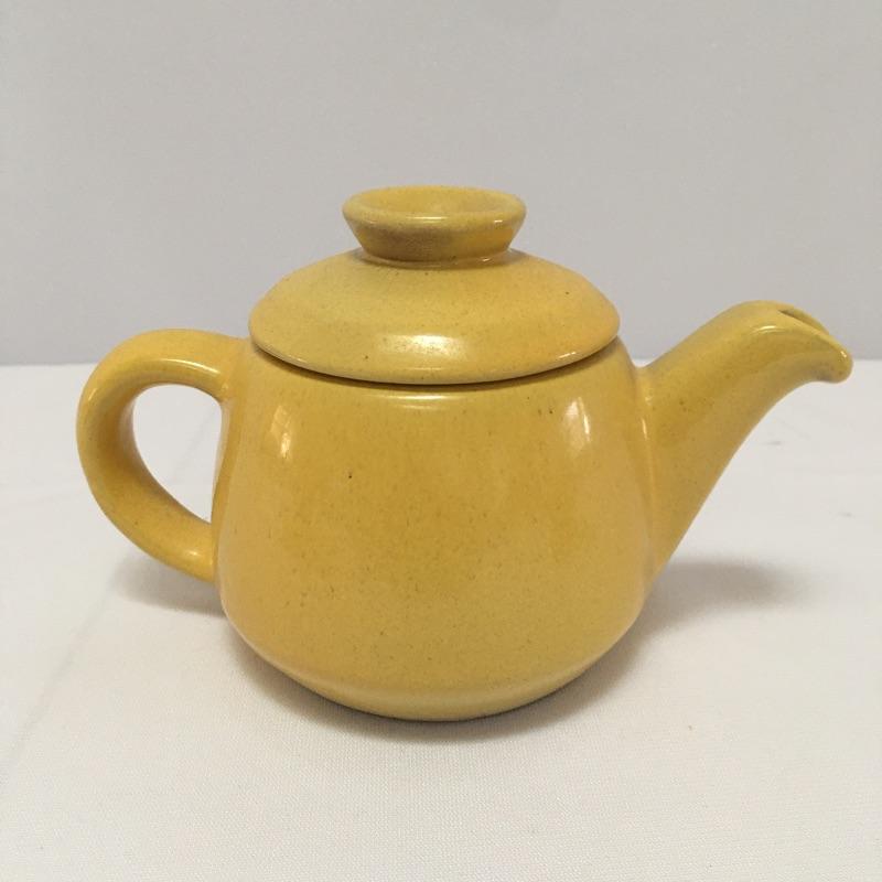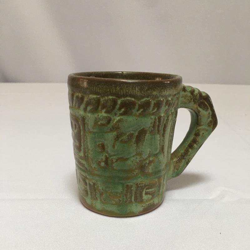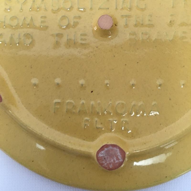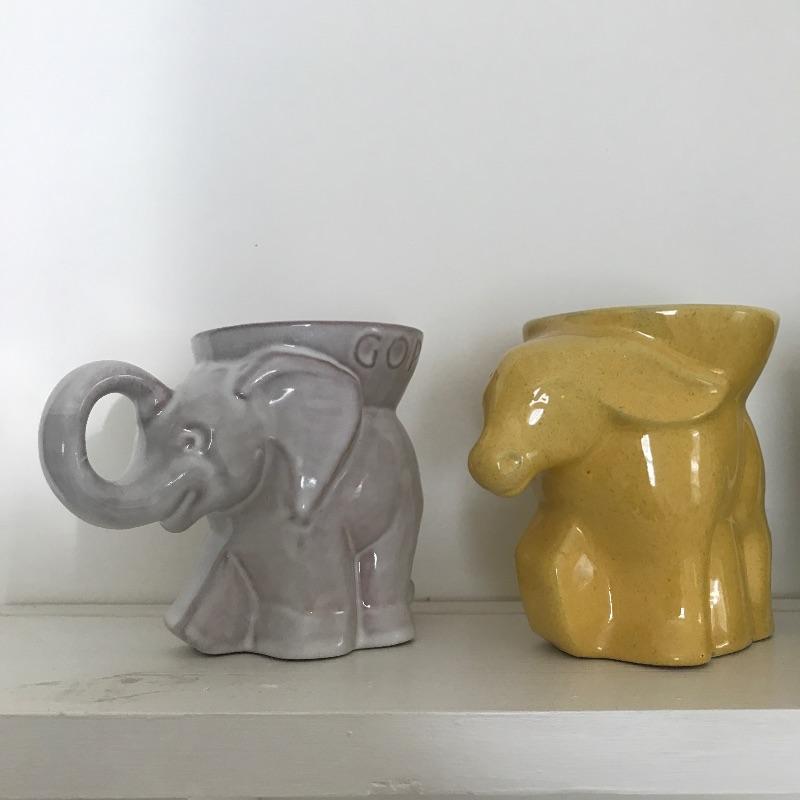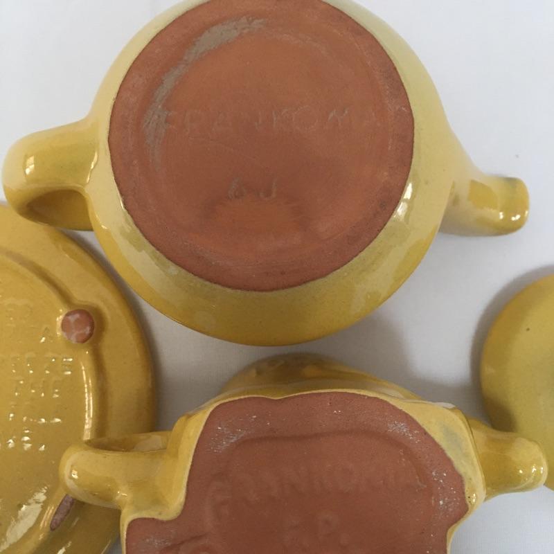 Frankoma pottery includes yellow trivet, teapot with lid, and Donkey. Lot also includes a Frankoma grey Elephant 1968 GOP mug and a green mug.