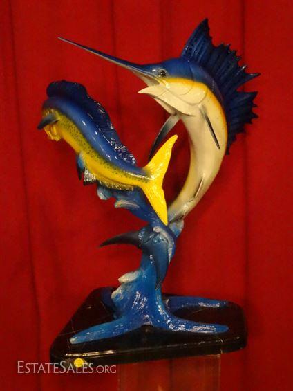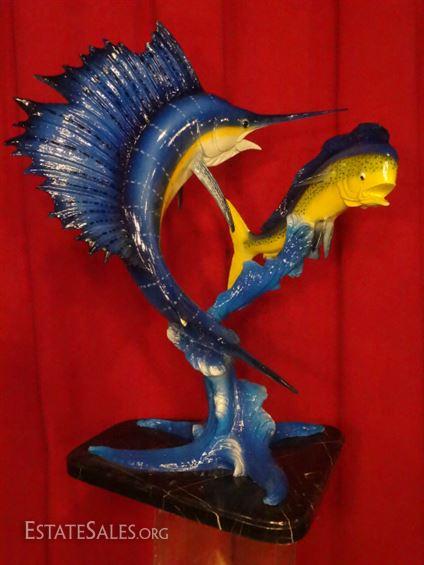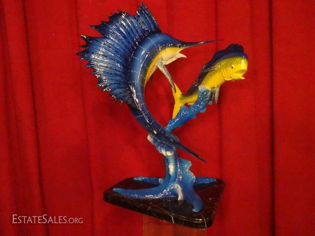 LOT 86: LARGE PATINATED BRONZE SCULPTURE, SAILFISH AND MAHI MAHI