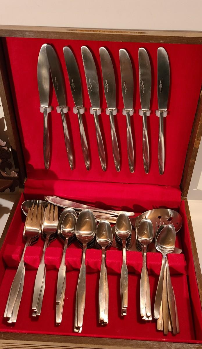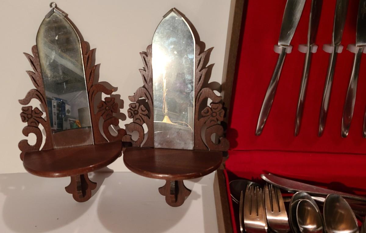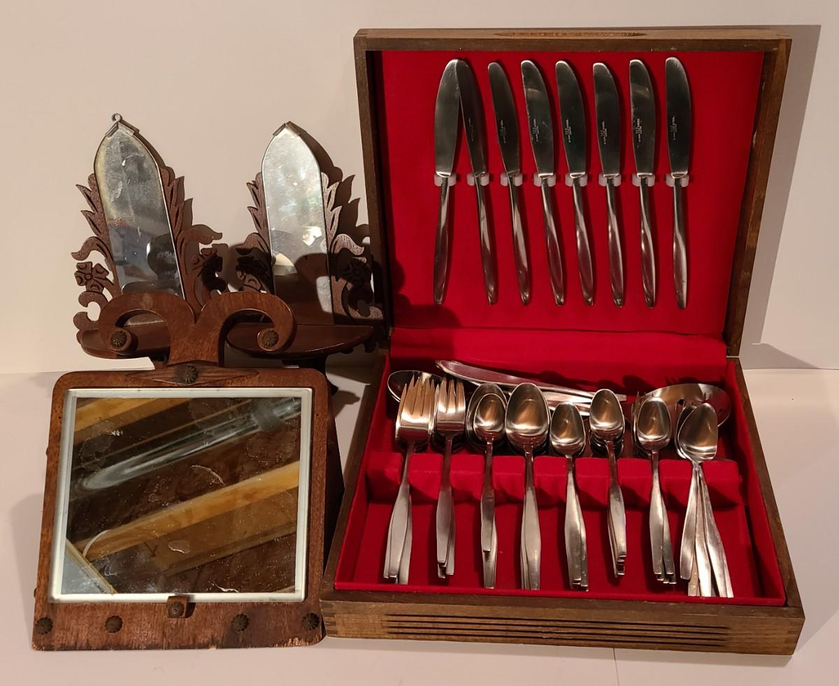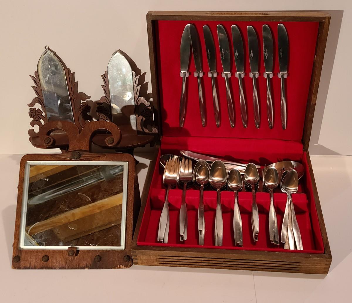Unique antique wood carved mirrors, and chest of MCM Stainless Steel Japan silverware. Please see all pictures for content of the lot, condition of the lot, and measurements if taken. Pictures are the best representation of the items listed and items are untested unless indicated in description. Thank you for looking and have fun bidding!