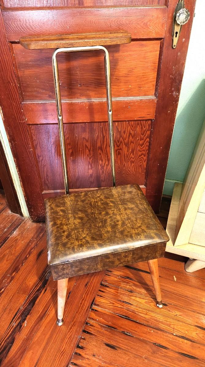 1970's Mid Century modern men's Valet Chair by Nova products. Padded seat lifts up to reveal storage. There is a padded brace across that back that is in the chair - needs 2 bolts to affix. Surprisingly good condition. 39.5" tall, 15.5" deep.