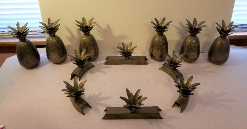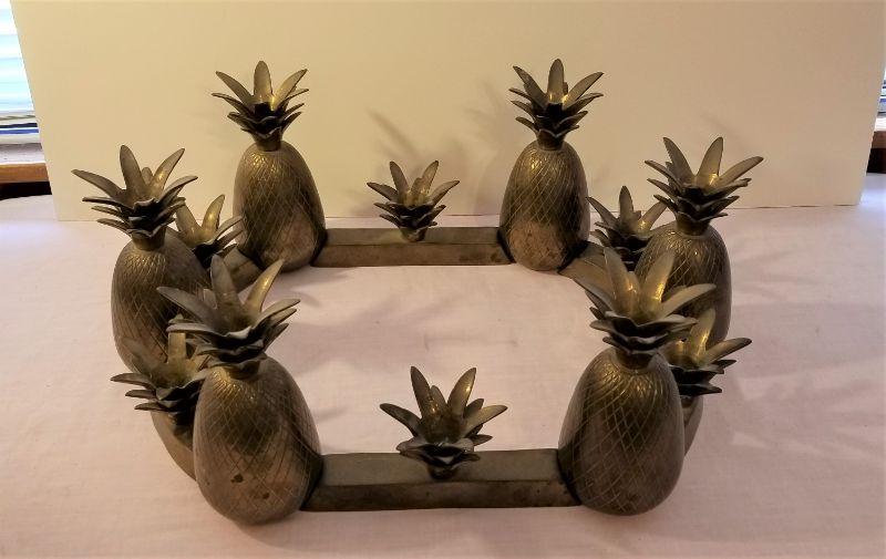 You get all you see here, and you can use it several different ways. Solid Brass Pineapple motif candleholder centerpiece set - use all of part of it - very versatile. Pieces are heavy. Mid Century time period. 12 pieces in all. Pineapples (6) are each about 6.5" tall
