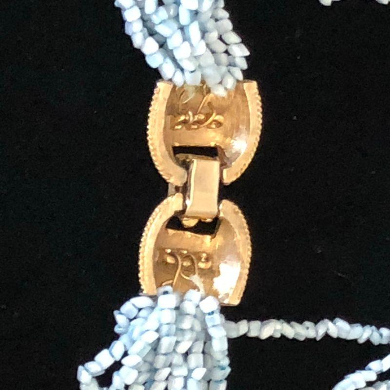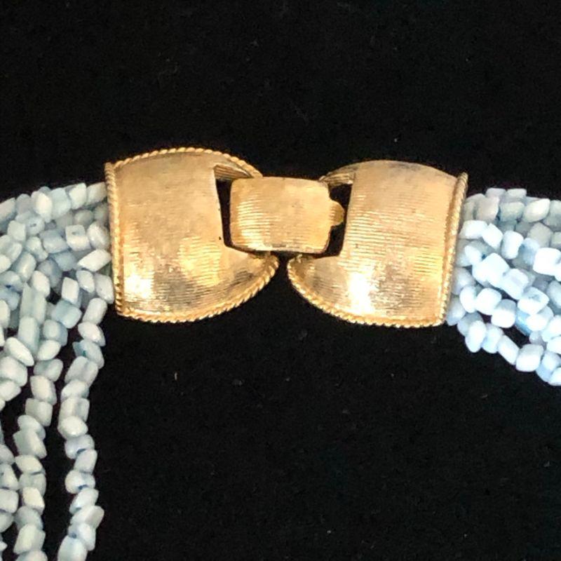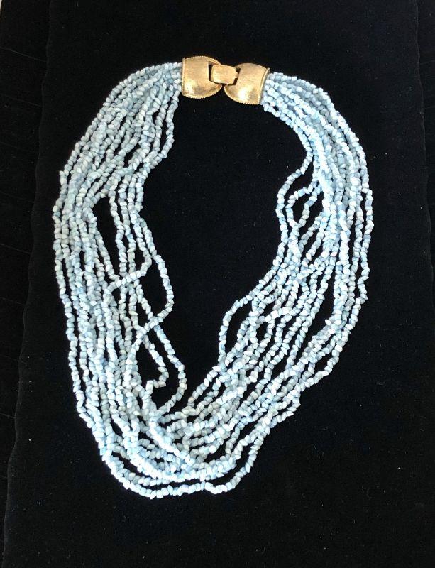 There are 12 strands in this choker style necklace. It has a pretty gold tone clip.