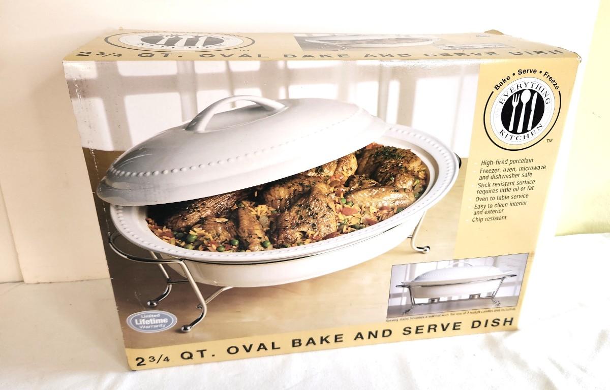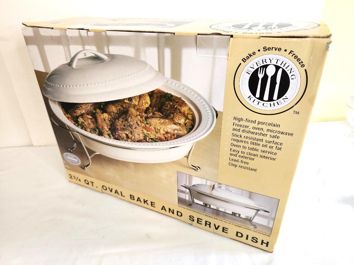 Never removed from box - Everything Kitchen brand Bake/Serve/Freeze Dish 2.75 quart size. High fired porcelain, microwave/dishwasher safe. Put it aside to give for a nice shower/wedding gift.