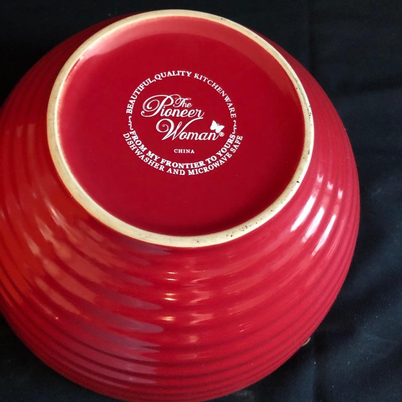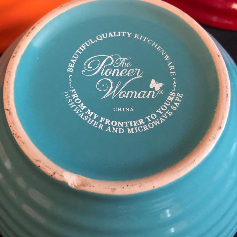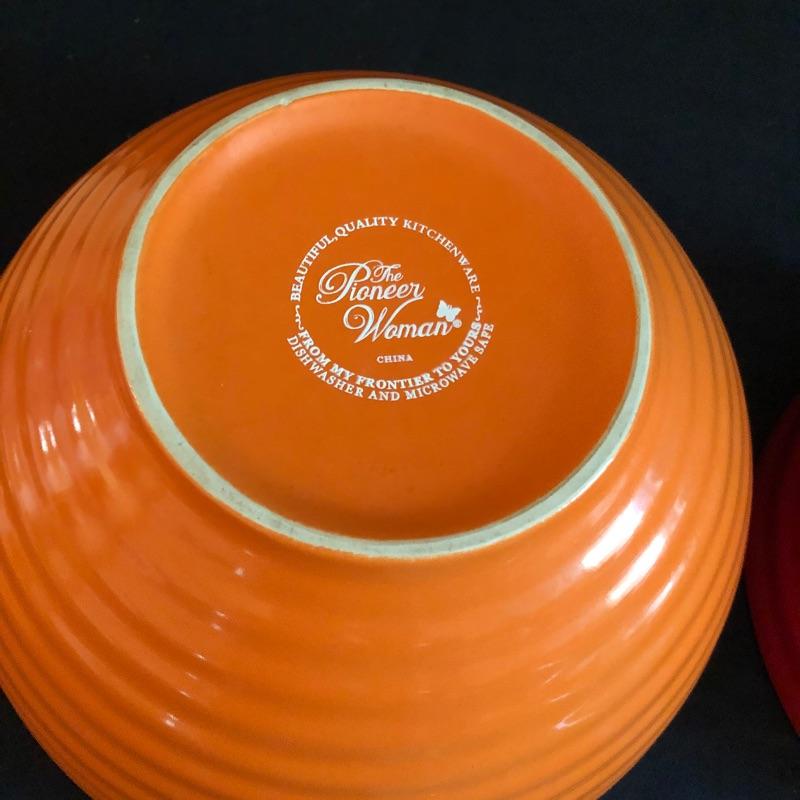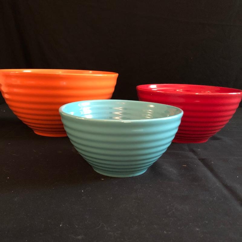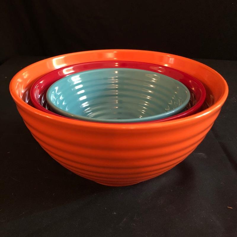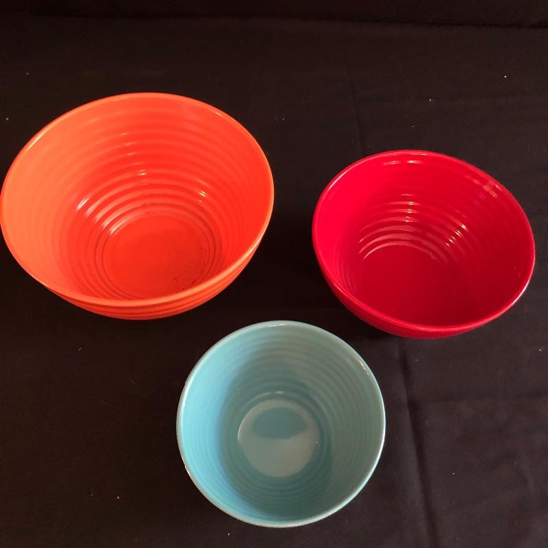This group of 3 nesting bowls from Pioneer Woman will certainly brighten any kitchen. The largest bowl is 10” diameter. They are in great shape with just the smallest of chips on the blue bowl that you can see in the second to last image.