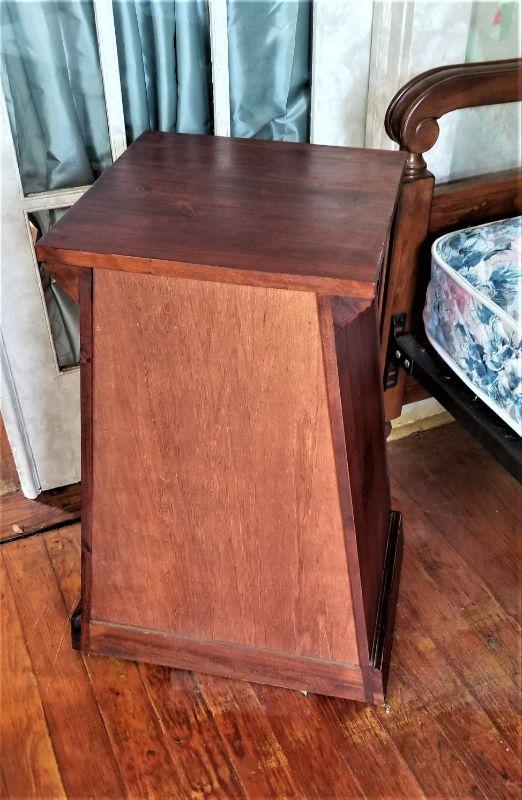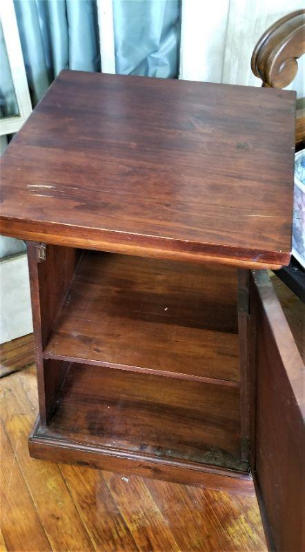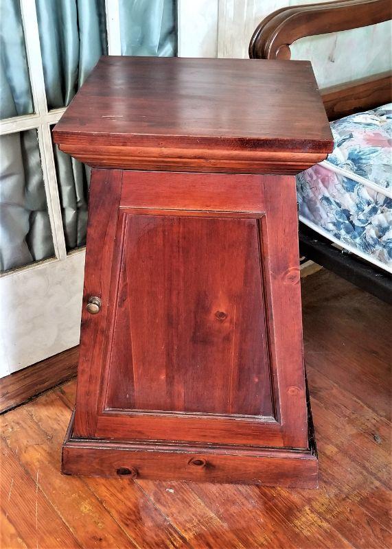 This pyramid style side table is solid wood (back is particle board) - door opens to reveal two shelves. 31" tall, 21" across at the bottom, 15" deep. Please check out all photos for condition.