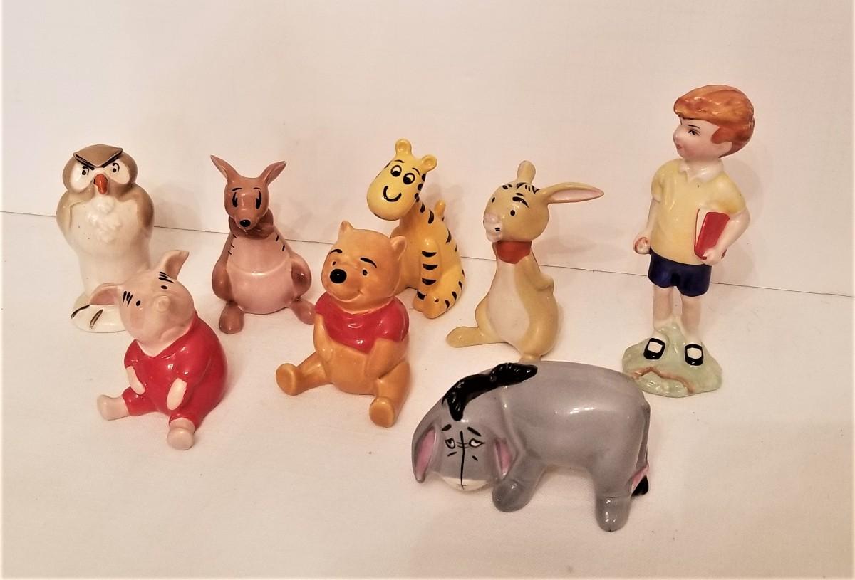 This is a complete set of 8 and is hard to find - Walt Disney Productions Winnie the Pooh china figures, done by the quality BESWICK company in England. These were retired a long time ago. For scale, Christopher Robin is standing about 5" tall. That figure alone routinely SELLS for 50.00 on ebay. No boxes. All in good condition.