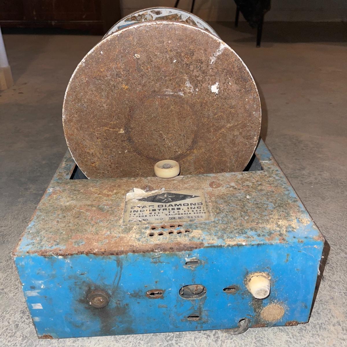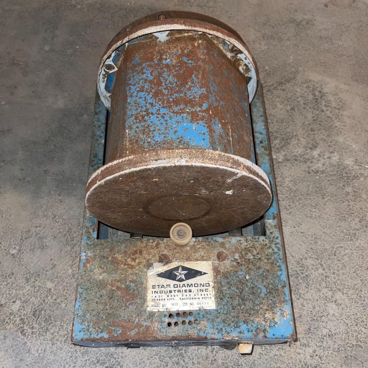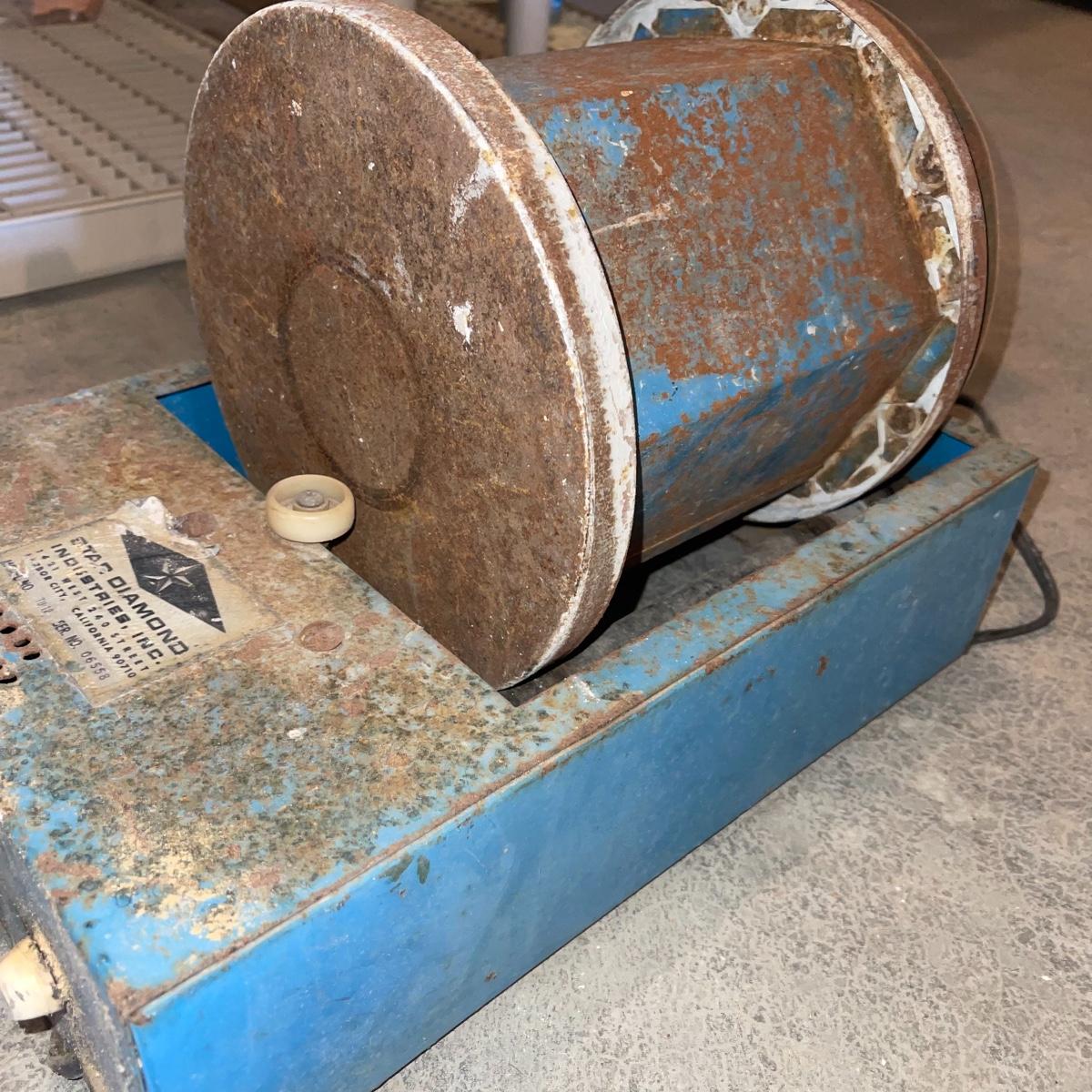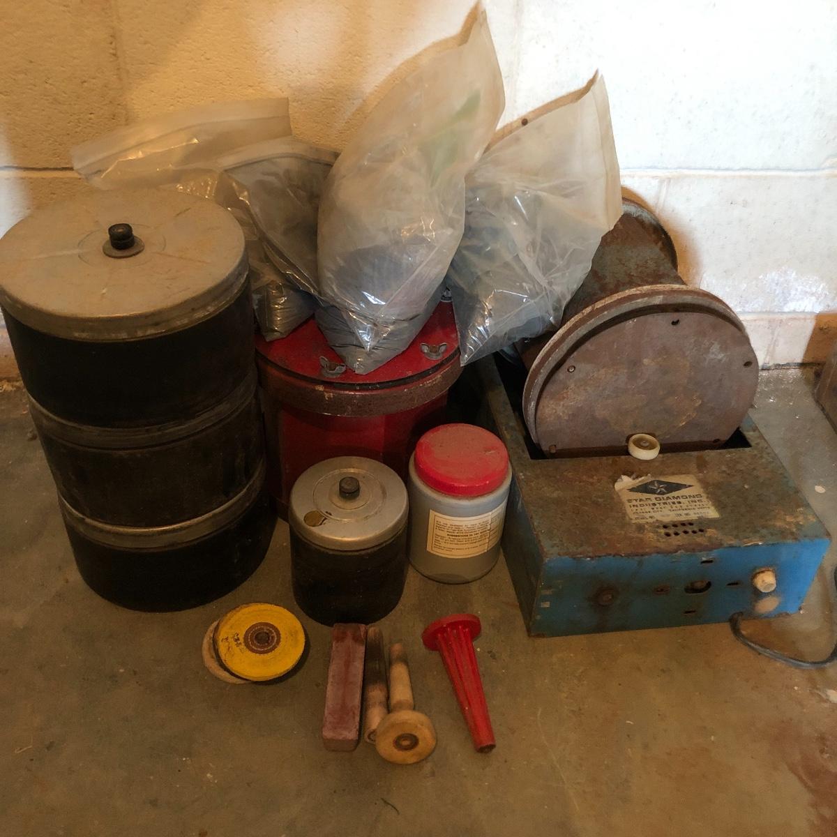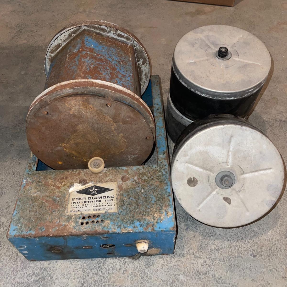 There are six rock tumbler drums in this lot, two large ones, three medium sized, and one small. The three medium sized drums measure 7.5“ in diameter and 4.5“ tall and all are in fair condition with wear from use. They have both rubber exteriors and interiors with metal lids. The large red and blue drums are about 9“ in diameter and 9“ tall, are metal with interior rubber liners, and have a 12lb capacity. The blue drum with a blue model TU-12 Star Diamond Industries tumbler, both are well rusted. There are a few types of polishing tools included as well as four bags and a container with a variety of tumbling grit. Add to your rock tumbling collection with these spare drums and extra grit!