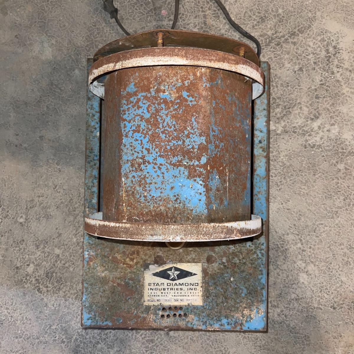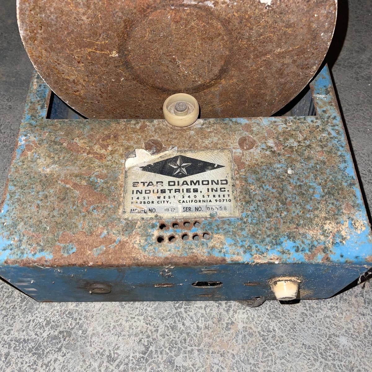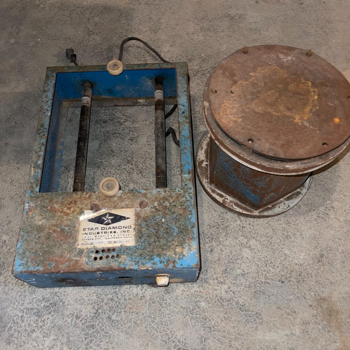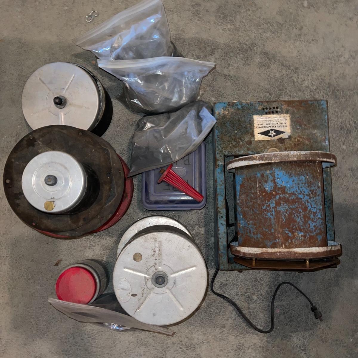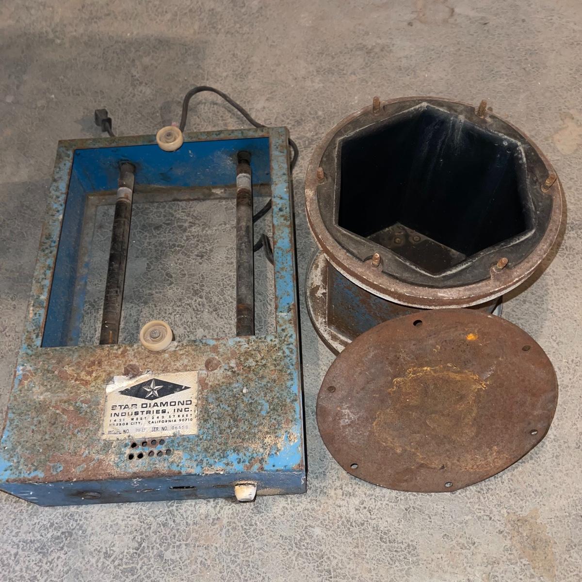 There are six rock tumbler drums in this lot, two large ones, three medium sized, and one small. The three medium sized drums measure 7.5“ in diameter and 4.5“ tall and all are in fair condition with wear from use. They have both rubber exteriors and interiors with metal lids. The large red and blue drums are about 9“ in diameter and 9“ tall, are metal with interior rubber liners, and have a 12lb capacity. The blue drum with a blue model TU-12 Star Diamond Industries tumbler, both are well rusted. There are a few types of polishing tools included as well as four bags and a container with a variety of tumbling grit. Add to your rock tumbling collection with these spare drums and extra grit!