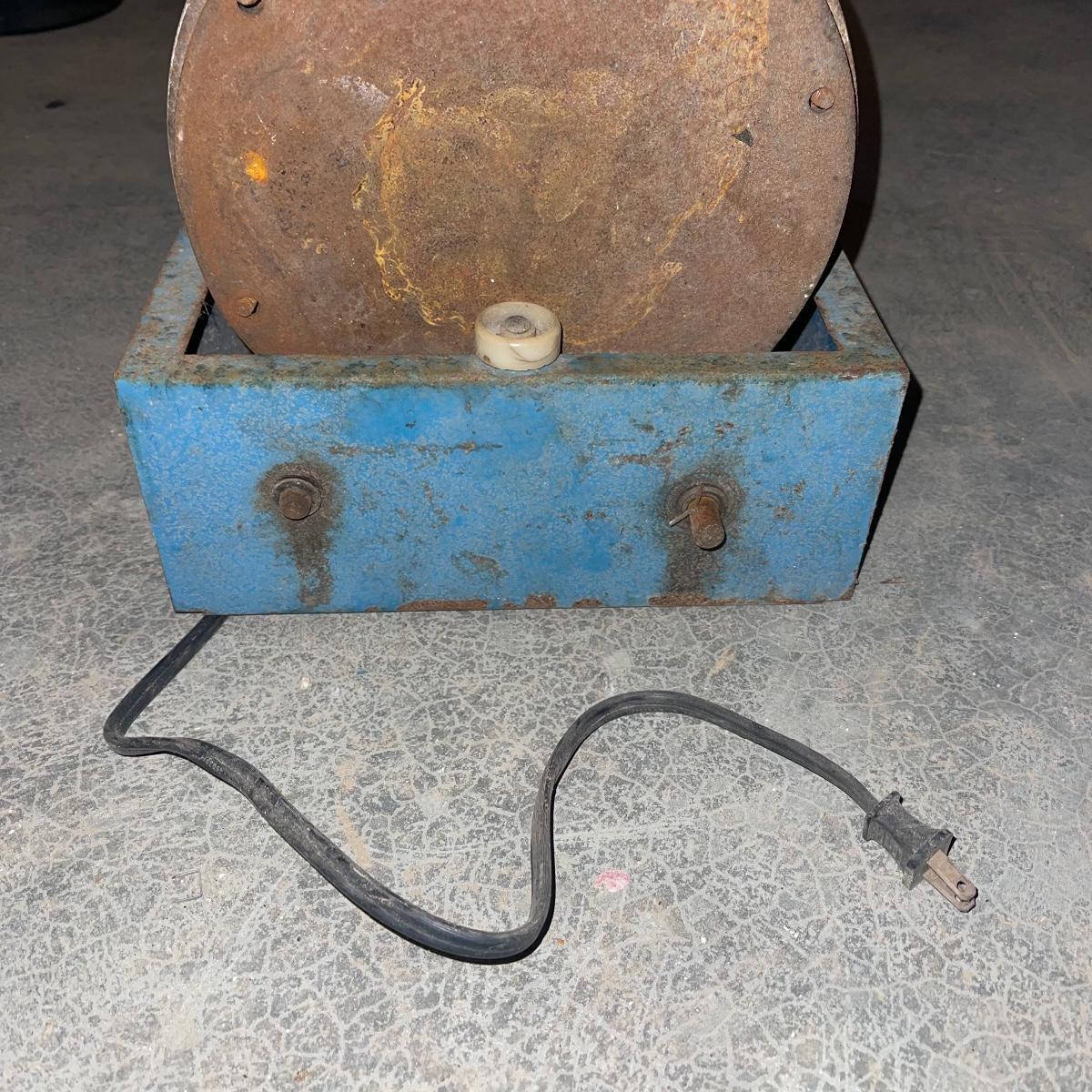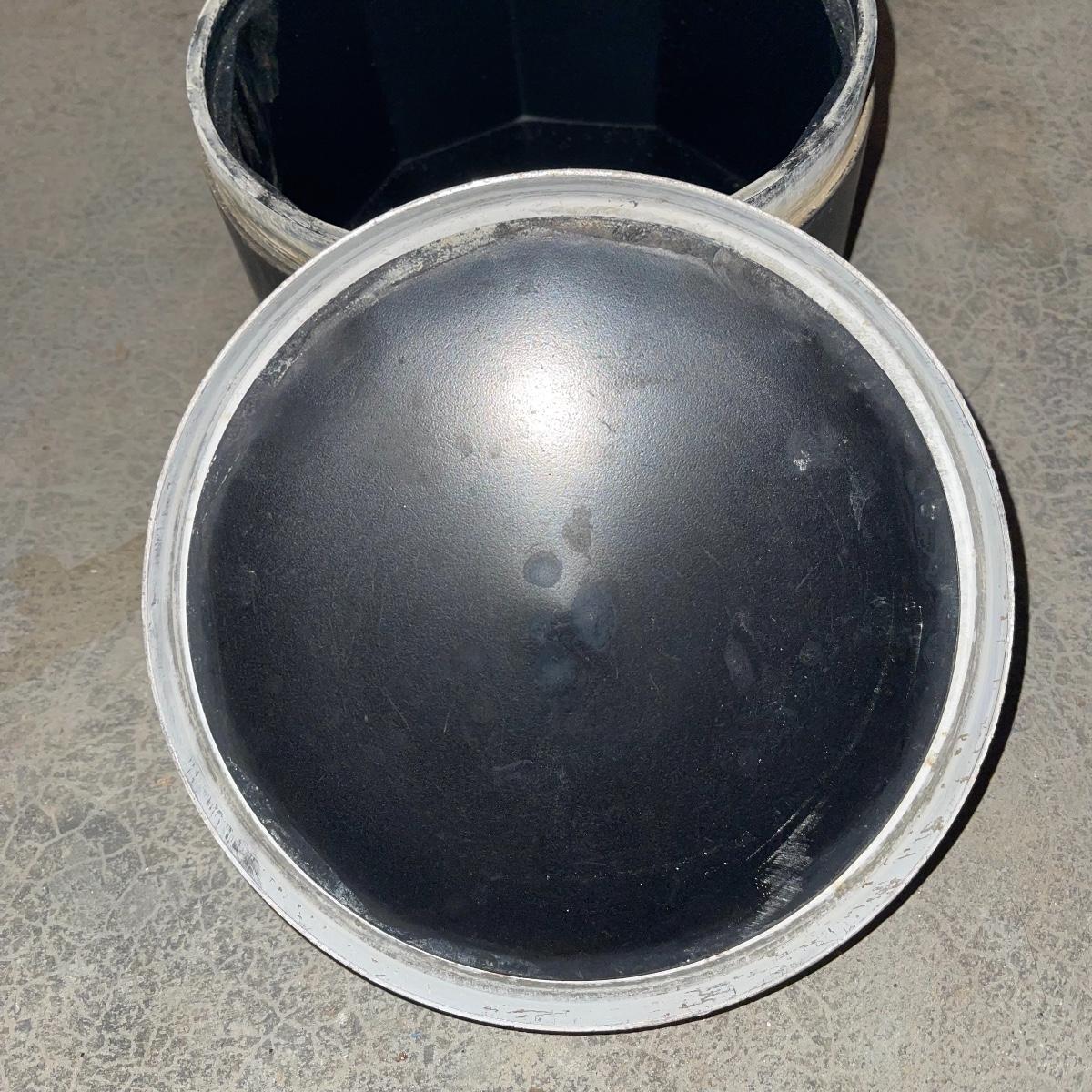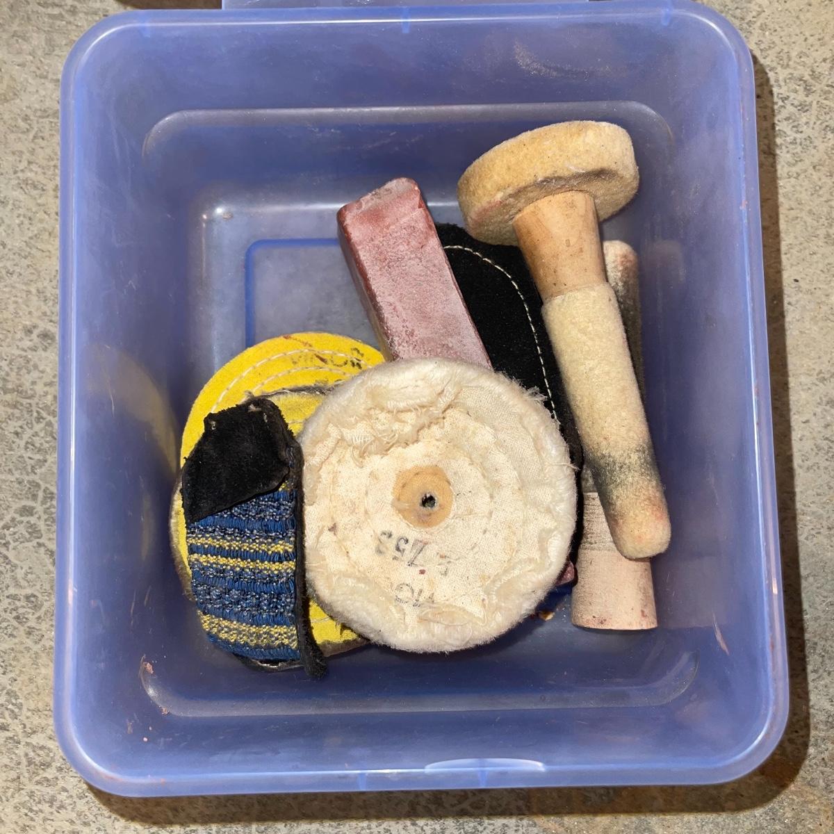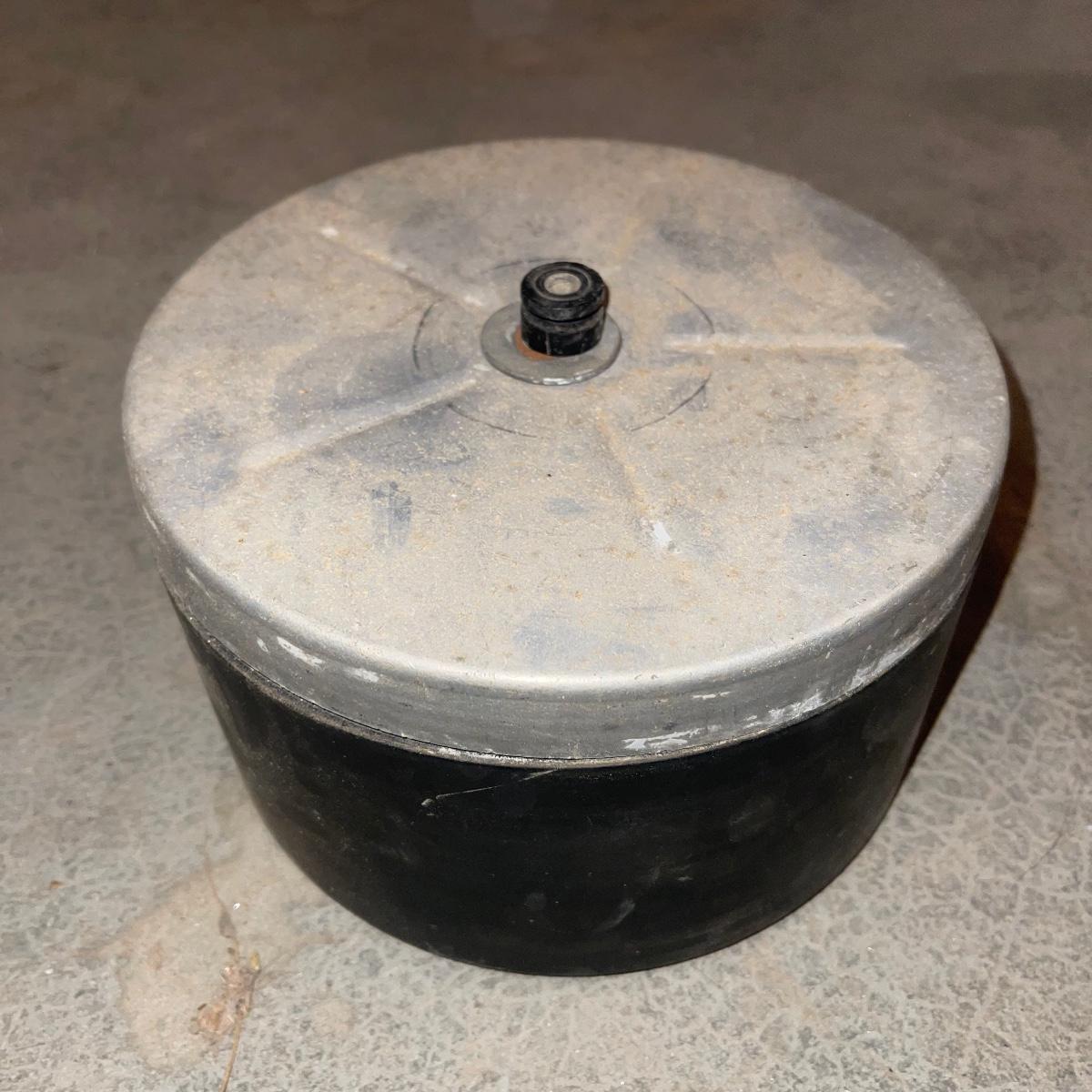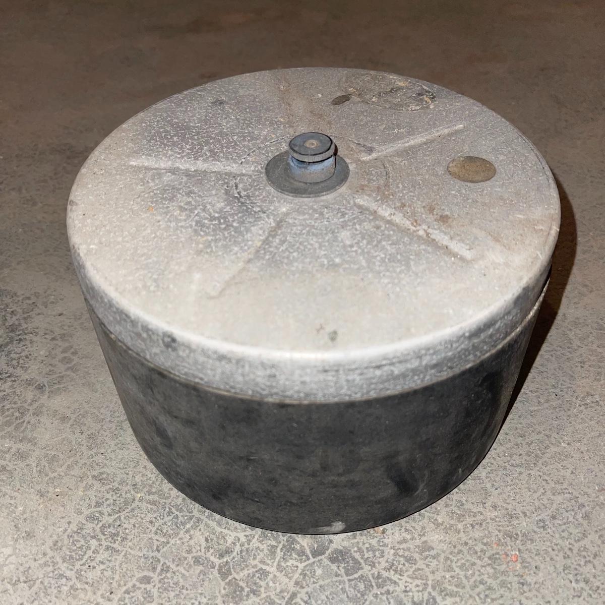 There are six rock tumbler drums in this lot, two large ones, three medium sized, and one small. The three medium sized drums measure 7.5“ in diameter and 4.5“ tall and all are in fair condition with wear from use. They have both rubber exteriors and interiors with metal lids. The large red and blue drums are about 9“ in diameter and 9“ tall, are metal with interior rubber liners, and have a 12lb capacity. The blue drum with a blue model TU-12 Star Diamond Industries tumbler, both are well rusted. There are a few types of polishing tools included as well as four bags and a container with a variety of tumbling grit. Add to your rock tumbling collection with these spare drums and extra grit!