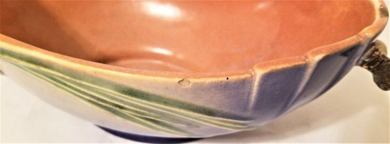 This bowl is from the first issue of the Pinecone pattern - this is style 279-9" Good condition except for a small (old) fleck to the rim (pictured). Pinecone is one of the most desirable Roseville patterns. This piece measures 3.5" tall and about 9" across.