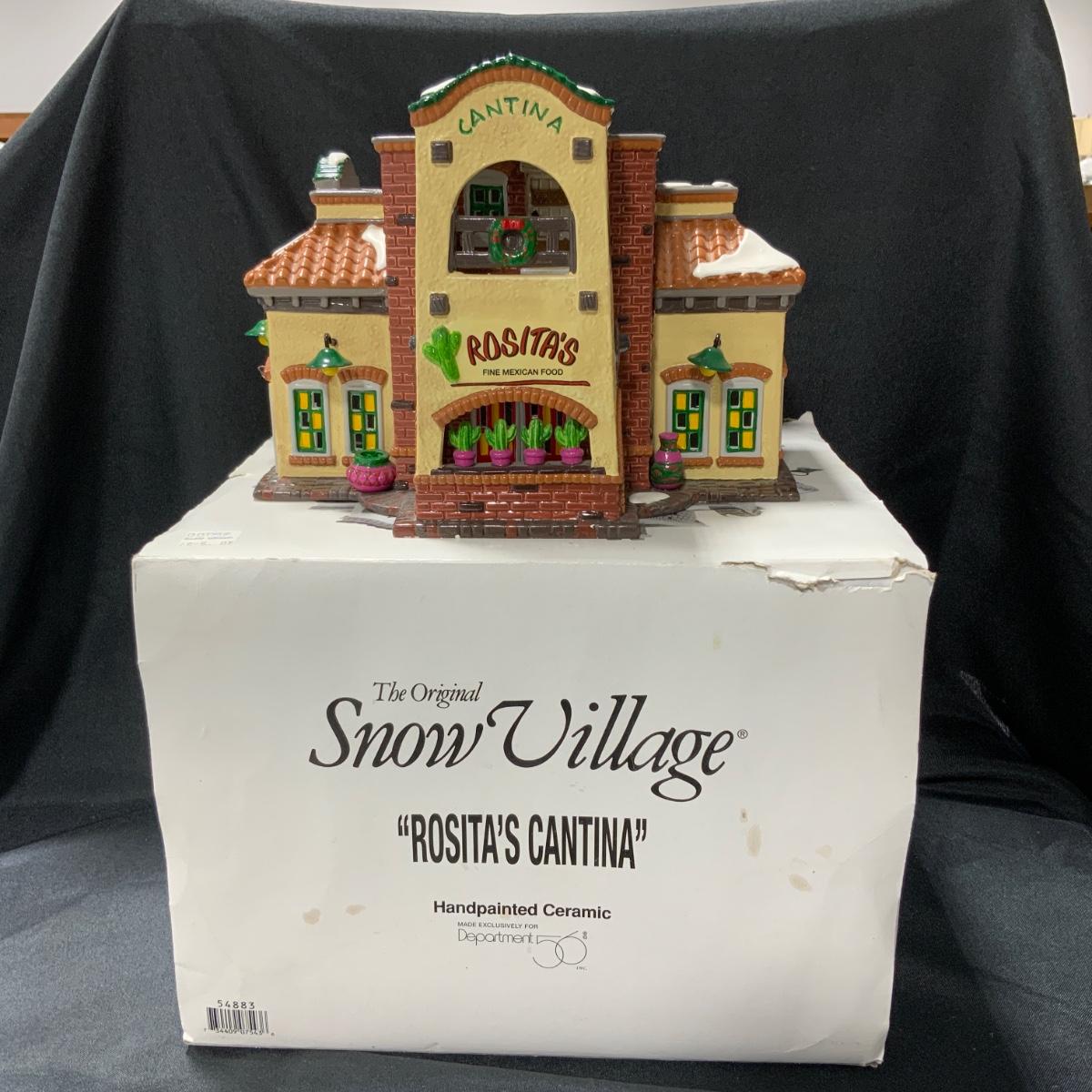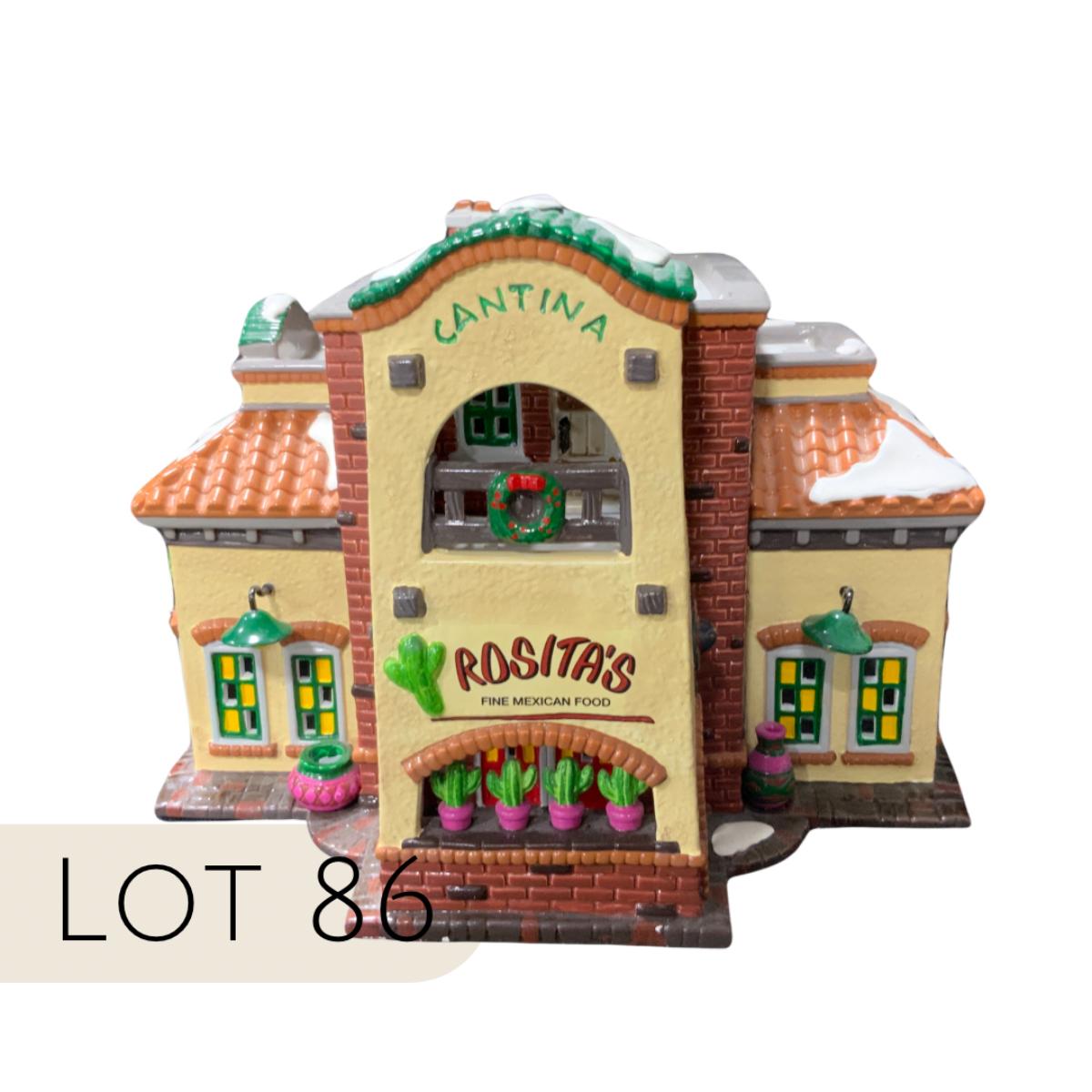 Excellent Department 56 Snow Village Rosita’s Cantina “House”. Every town needs that chain Mexican restaurant that is inexplicably more popular than the authentic spot around the corner. Vibrant colors, nice decals. Please see photos for details and condition. ::: Shipping is available on this lot. If you require shipping you must let us know at the close of the auction. We will coordinate with you after the item has been won. Shipping fees will include insurance up to or exceeding the value of all items being mailed. If you have any questions regarding this lot please contact the auctioneer either via this website, by direct email or by phone. PICK UP TIMES and other important information can be found in the TERMS and DESCRIPTION of the auction. Please take a look for pertinent information. Thanks! Any condition statement is given as a courtesy to a client, is an opinion, and should not be treated as a statement of fact. Reference to condition written, oral or within a condition report shall not be regarded as a full account of condition and may not include all defects, alterations, or restorations. Absence of a condition report does not imply a lot is flawless or lacking imperfections or damage. Katherine’s Auction & Appraisal Service shall have no responsibility for any error or omission. Returns shall not be accepted on the basis of condition.