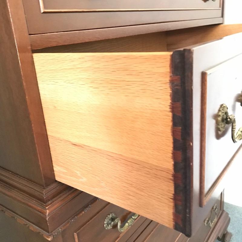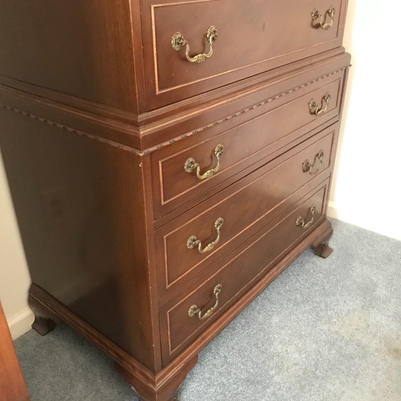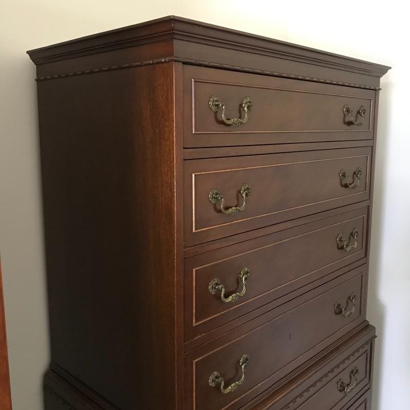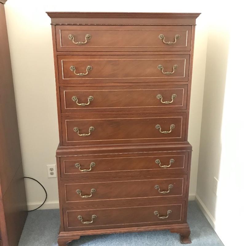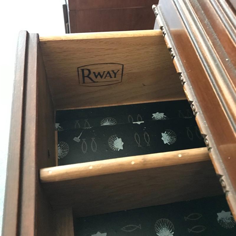 Handsome vintage seven drawer tallboy dresser by Rway. Lovely borders and brass pulls adorn each drawer. Two matching side tables can be found in lot 82. A couple of drawers have removable custom organizers with one middle partition fixed in the fifth drawer down. This chest of drawers has normal wear and is very sturdy measuring approximately 36” 21” x 63” .This is one piece and very heavy with no stairs to load. Please bring help to load. Local Pickup Only.