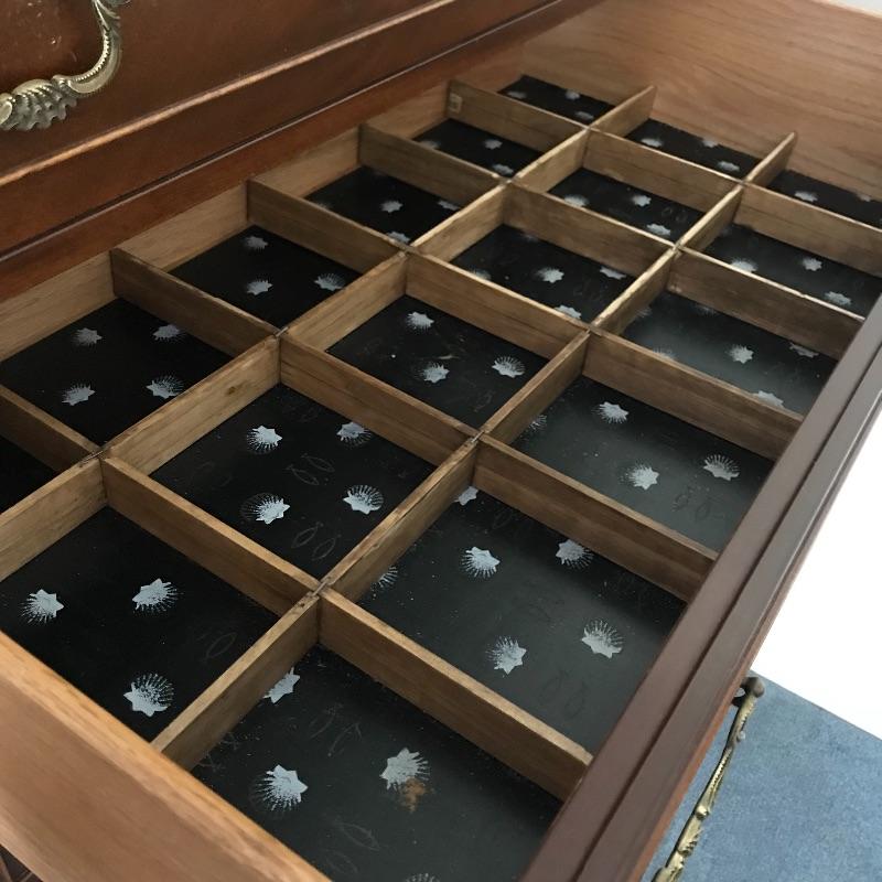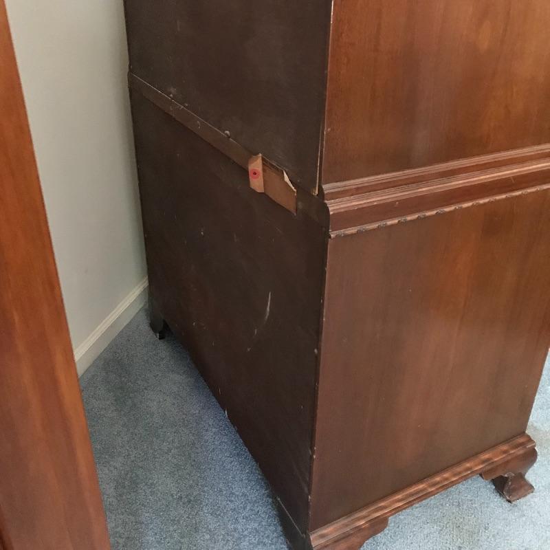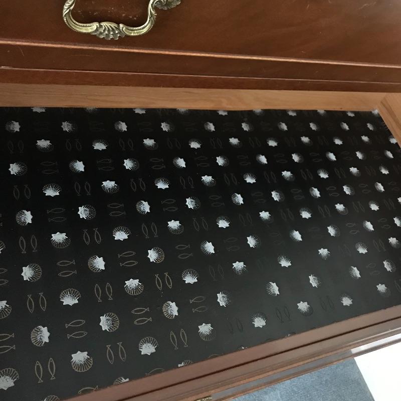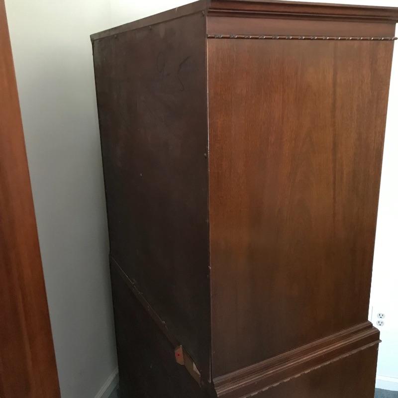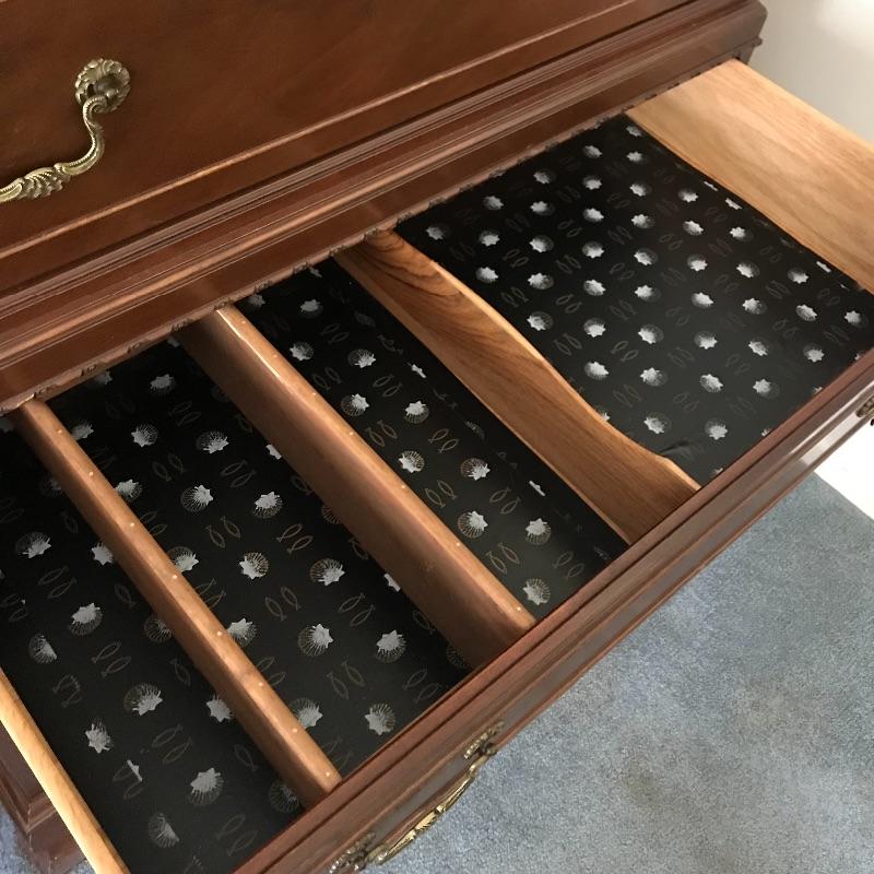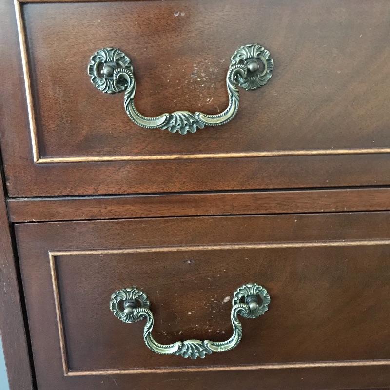 Handsome vintage seven drawer tallboy dresser by Rway. Lovely borders and brass pulls adorn each drawer. Two matching side tables can be found in lot 82. A couple of drawers have removable custom organizers with one middle partition fixed in the fifth drawer down. This chest of drawers has normal wear and is very sturdy measuring approximately 36” 21” x 63” .This is one piece and very heavy with no stairs to load. Please bring help to load. Local Pickup Only.